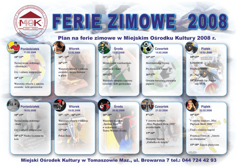 FERIE ZIMOWE 2008 Plan na ferie zimowe w Miejskim Ośrodku Kultury 2008 r. Poniedziałek 11.02.2008 Wtorek Środa Czwartek Piątek 12.02.2008 13.02.2008 14.02.2008 15.02.2008 1000 1500 1000 - 1200 1000-1500 1000-1500 1000-1500 Turniej tenisa stołowego - eliminacje 1600-1700 Minimundial trambambulo Multimedialny Turniej KINOMOK Warsztaty otwarte z zakresu ceramiki - ręczne lepienie w glinie eliminacje i finały Pro Evolution Soccer 08 Projekcja Filmu 1000-1200 1600-1700 pt. „Na Fali” Warsztaty otwarte z zakresu ceramiki - koło garncarskie Otwarte warsztaty czerpania papieru 1900 Koncert Agi Zaryan sala MOK Gry i zabawy integracyjne 10 12 00 00 Warsztaty otwarte z zakresu ceramiki - koło garncarskie Poniedziałek Wtorek Środa Czwartek Piątek 18.02.2008 19.02.2008 20.02.2008 21.02.2008 22.02.2008 1000 1500 1000 - 1200 ; 1600-1700 1000-1500 930-1300 1000-1300 Turniej tenisa stołowego - finały Warsztaty otwarte z zakresu ceramiki. 1200-1400 V zimowy konkurs „Mini Playback Show 2008” przesłuchania V zimowy konkurs „Mini Playback Show 2008” Gry i zabawy integracyjne Warsztaty teatralne „Spotkać Teatr” w wykonaniu Teatru Wertep z Łodzi 1000-1200 Nauka toczenia na kole Pokaz iluzji. 1300-1400 Warsztaty tkackie „Zakładka do książki” Finał i rozdanie nagród Projekcja Filmu pt. „Asterix na olimpiadzie” 1500-1800 Zajęcia plastyczne Miejski Ośrodek Kultury w Tomaszowie Maz., ul. Browarna 7 tel.: 044 724 42 93