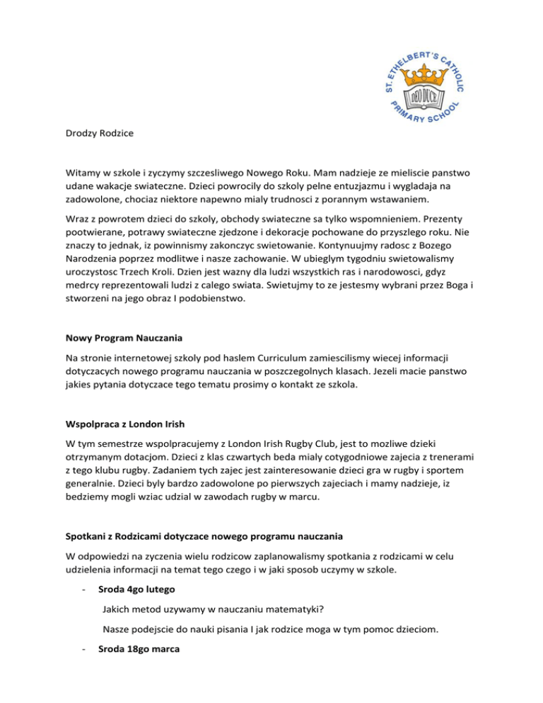 Drodzy Rodzice Witamy w szkole i zyczymy szczesliwego Nowego Roku. Mam nadzieje ze mieliscie panstwo udane wakacje swiateczne. Dzieci powrocily do szkoly pelne entuzjazmu i wygladaja na zadowolone, chociaz niektore napewno mialy trudnosci z porannym wstawaniem. Wraz z powrotem dzieci do szkoly, obchody swiateczne sa tylko wspomnieniem. Prezenty pootwierane, potrawy swiateczne zjedzone i dekoracje pochowane do przyszlego roku. Nie znaczy to jednak, iz powinnismy zakonczyc swietowanie. Kontynuujmy radosc z Bozego Narodzenia poprzez modlitwe i nasze zachowanie. W ubieglym tygodniu swietowalismy uroczystosc Trzech Kroli. Dzien jest wazny dla ludzi wszystkich ras i narodowosci, gdyz medrcy reprezentowali ludzi z calego swiata. Swietujmy to ze jestesmy wybrani przez Boga i stworzeni na jego obraz I podobienstwo. Nowy Program Nauczania Na stronie internetowej szkoly pod haslem Curriculum zamiescilismy wiecej informacji dotyczacych nowego programu nauczania w poszczegolnych klasach. Jezeli macie panstwo jakies pytania dotyczace tego tematu prosimy o kontakt ze szkola. Wspolpraca z London Irish W tym semestrze wspolpracujemy z London Irish Rugby Club, jest to mozliwe dzieki otrzymanym dotacjom. Dzieci z klas czwartych beda mialy cotygodniowe zajecia z trenerami z tego klubu rugby. Zadaniem tych zajec jest zainteresowanie dzieci gra w rugby i sportem generalnie. Dzieci byly bardzo zadowolone po pierwszych zajeciach i mamy nadzieje, iz bedziemy mogli wziac udzial w zawodach rugby w marcu. Spotkani z Rodzicami dotyczace nowego programu nauczania W odpowiedzi na zyczenia wielu rodzicow zaplanowalismy spotkania z rodzicami w celu udzielenia informacji na temat tego czego i w jaki sposob uczymy w szkole. - Sroda 4go lutego Jakich metod uzywamy w nauczaniu matematyki? Nasze podejscie do nauki pisania I jak rodzice moga w tym pomoc dzieciom. - Sroda 18go marca Wspolpraca z rodzicami. Mamy nadzieje iz znajdziecie panstwo czas na spotkanie z nami. Planujemy tez spotkanie na temat bezpieczenstwa w uzywaniu internetu. Powiadomimy panstwa o datach wkrotce. Rada Rodzicow Nadchodzace spotkania Rady Rodzicow: Piatek 30go stycznia 1:45 do 3:15 Czwartek 19go marca 1:45 do 3:15 Wszyscy rodzice sa mile widziani na tych spotkaniach. Jezeli jestescie panstwo zaisnteresowani prosimy o kontakt z recepcja szkoly. Nowi pracownicy Witamy serdecznie w naszej szkole Ms George ( klasa 1 nauczyciel) Mrs Webb( nauczyciel pomocniczy klasa 2) Ms Oke ( nauczyciel pomocniczy w Reception i klasa 1) Dziekujemy wszystkim ktorzy wzieli udzial w naszym bazarze swiatecznym, jak rowniz tym ktorzy ten bazar przygotowali. Zebrano £500, ktore zostana przeznaczone na zakup gier na plac zabaw jak rowniez zabawek I gier do zabawy podczas przerw w klasie kiedy pada deszcz. Apele klasowe Klasa 4RH : piatek 16go stycznia Klasa 5K : piatek 23go stycznia Klasa 1L : piatek 30go stycznia Klasa 4S : piatek 6go lutego Msze Sw. Klasy 5/6 wtorek 27go stycznia Klasy 3/4 wtorek 3go lutego Zajecia poza szkolne rozpoczynaja sie wtym tygodniu. Zebrania dla rodzicow odbeda sie w srode 11go I w piatek 13go lutego. Informacja na temat spotkan zostala wyslana. Prosimy o zwrot formularzy dotyczacych bezplatnych obiadow. Szkola moze stracic £ 1300 jezeli panstwo nie zarejestrujecie swojego dziecka. Wiecej informacji na stronie internetowej.