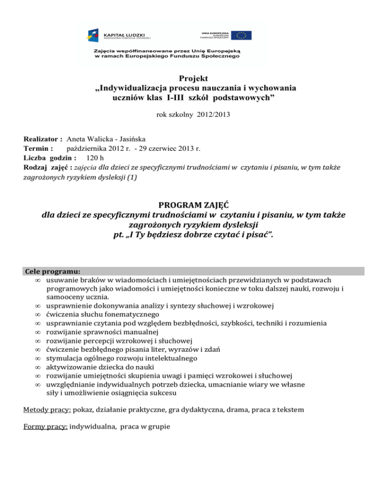 Projekt „Indywidualizacja procesu nauczania i wychowania uczniów klas I-III szkół podstawowych” rok szkolny 2012/2013 Realizator : Aneta Walicka - Jasińska Termin : października 2012 r. - 29 czerwiec 2013 r. Liczba godzin : 120 h Rodzaj zajęć : zajęcia dla dzieci ze specyficznymi trudnościami w czytaniu i pisaniu, w tym także zagrożonych ryzykiem dysleksji (1) PROGRAM ZAJĘĆ dla dzieci ze specyficznymi trudnościami w czytaniu i pisaniu, w tym także zagrożonych ryzykiem dysleksji pt. „I Ty będziesz dobrze czytać i pisać”. Cele programu: • usuwanie braków w wiadomościach i umiejętnościach przewidzianych w podstawach programowych jako wiadomości i umiejętności konieczne w toku dalszej nauki, rozwoju i samooceny ucznia. • usprawnienie dokonywania analizy i syntezy słuchowej i wzrokowej • ćwiczenia słuchu fonematycznego • usprawnianie czytania pod względem bezbłędności, szybkości, techniki i rozumienia • rozwijanie sprawności manualnej • rozwijanie percepcji wzrokowej i słuchowej • ćwiczenie bezbłędnego pisania liter, wyrazów i zdań • stymulacja ogólnego rozwoju intelektualnego • aktywizowanie dziecka do nauki • rozwijanie umiejętności skupienia uwagi i pamięci wzrokowei i słuchowej • uwzględnianie indywidualnych potrzeb dziecka, umacnianie wiary we własne siły i umożliwienie osiągnięcia sukcesu Metody pracy: pokaz, działanie praktyczne, gra dydaktyczna, drama, praca z tekstem Formy pracy: indywidualna, praca w grupie TREŚCI DO REALIZACJI: • Utrwalanie znajomości alfabetu, wyodrębnianie samogłosek i spółgłosek, liter i głosek, sylab. • Ćwiczenia sprawności manualnej , ćwiczenia percepcyjno-motoryczne, kreślenie szlaczków literopodobnych. • Odwzorowywanie kształtów znaków, figur, liter - ćwiczenia uwagi i pamięci wzrokowej – gry dydaktyczne. • Wyodrębnianie głosek w nagłosie, śródgłosie i wygłosie. • Układanie zdań z podanym wyrazem, przeliczanie wyrazów. • Analiza i synteza słuchowo-wzrokowa wyrazów - ćwiczenia w czytaniu. • Ćwiczenia usprawniające dzielenie wyrazów na głoski i sylaby. • Ćwiczenia utrwalające pisownię wielkiej litery w imionach ludzi i zwierząt oraz na początku zdania. • Układanie wyrazów z liter i sylab. • Układanie zdań z rozsypanek wyrazowych i rozwiązywanie rebusów. • Pisanie liter, sylab, wyrazów i krótkich zdań. • Pisanie prostych wyrazów z pamięci. • Liczenie głosek, liter, sylab, spółgłosek i samogłosek w wyrazach - ćwiczenia. • Głośne indywidualne czytanie wyrazów jednosylabowych, dwusylabowych i wybranych krótkich tekstów. • Nauka poprawnego wypowiadania się i budowania zdań rozwiniętych. • Układanie historyjek obrazkowych we właściwej kolejności. • Czytanie zdań oznajmujących, pytających i wykrzyknikowych z właściwą intonacją. • Ćwiczenia w czytaniu ze zrozumieniem – układanie podpisów do ilustracji. • Doskonalenie techniki głośnego czytania. • Ćwiczenia zmierzające do osiągnięcia płynności, poprawności i wyrazistości głośnego czytania (zmiana siły i tonu głosu, tempa czytania, stosowanie pauz gramatycznych i logicznych). • Wdrażanie do głośnego i cichego czytania ze zrozumieniem. • Czytanie z podziałem na role. • Układanie krótkich opowiadań związanych z treścią utworu lub innego zakończenia opowiadania. • Ćwiczenia w płynnym, czytelnym i estetycznym pisaniu. • Pisanie z pamięci i ze słuchu wyrazów i zdań pisowni zgodnej z brzmieniem. • Przepisywanie wyrazów, zdań tekstów powiązanych z uzupełnianiem i przekształcaniem. • Porządkowanie zdań w rozsypankach sylabowych i zdaniowych. • Redagowanie i zapisywanie krótkiej wypowiedzi na określony temat. • Ćwiczenia w pisaniu życzeń i adresowaniu koperty. • Poznanie pisowni wybranych wyrazów według poznanych zasad ortograficznych (wyrazy z „ó” wymiennym i niewymiennym, zakończenia –ów, -ówna, często spotykane wyrazy z „rz” wymiennym, niewymiennym, po spółgłoskach i w wyrazach pokrewnych, wyrazy z „h” i „ż”, wyrazy z „ą” i „ę” w różnych pozycjach, wyrazy z zanikiem dźwięczności na końcu i w środku wyrazu) • Praktyczne ćwiczenia w opanowaniu poprawnych form gramatycznych • Rozpoznawanie rodzajów zdań. • Wyodrębnianie poznanych części mowy.