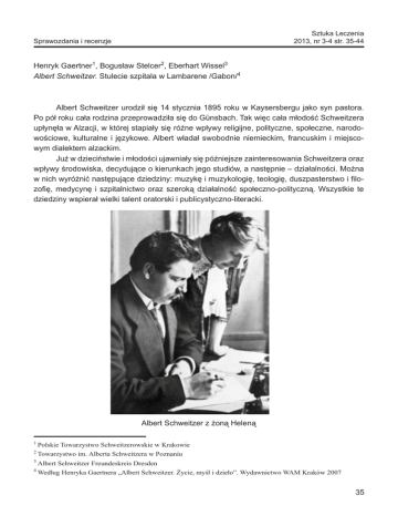 Sztuka Leczenia 2013, nr 3-4 str. 35-44 Sprawozdania i recenzje Henryk Gaertner1, Bogusław Stelcer2, Eberhart Wissel3 Albert Schweitzer. Stulecie szpitala w Lambarene /Gabon/4 Albert Schweitzer urodził się 14 stycznia 1895 roku w Kaysersbergu jako syn pastora. Po pół roku cała rodzina przeprowadziła się do Günsbach. Tak więc cała młodość Schweitzera upłynęła w Alzacji, w której stapiały się różne wpływy religijne, polityczne, społeczne, narodowościowe, kulturalne i językowe. Albert władał swobodnie niemieckim, francuskim i miejscowym dialektem alzackim. Już w dzieciństwie i młodości ujawniały się późniejsze zainteresowania Schweitzera oraz wpływy środowiska, decydujące o kierunkach jego studiów, a następnie – działalności. Można w nich wyróżnić następujące dziedziny: muzykę i muzykologię, teologię, duszpasterstwo i filozofię, medycynę i szpitalnictwo oraz szeroką działalność społeczno-polityczną. Wszystkie te dziedziny wspierał wielki talent oratorski i publicystyczno-literacki. Albert Schweitzer z żoną Heleną 1 Polskie Towarzystwo Schweitzerowskie w Krakowie Towarzystwo im. Alberta Schweitzera w Poznaniu 3 Albert Schweitzer Freundeskreis Dresden 4 Według Henryka Gaertnera „Albert Schweitzer. Życie, myśl i dzieło”. Wydawnictwo WAM Kraków 2007 2 35 Sprawozdania i recenzje W piątym roku życia zaczął naukę gry na organach i wkrótce występował publicznie w kościołach. Późniejsze studia związały go ze słynnymi wówczas muzykami – braćmi Eugeniuszem i Ernestem Münchami, a następnie z Karolem Marią Widorem. Naukę fortepianu podjął w Paryżu u Isadory Philips i Marii Jaëll-Trautmann, uczennicy Franciszka Liszta. Ona to skłoniła Schweitzera do zajęcia się problemami techniki gry fortepianowej i transmisji między mózgiem a ręką. Badania te Schweitzer kontynuował u Karla Stumpfa w Berlinie i Charlesa Férégo w Paryżu. Ulubionymi kompozytorami Schweitzera byli: Wagner, Franck, a szczególnie Jan Sebastian Bach. Po serii zwięzłych opracowań Schweitzer wydał swe pomnikowe dzieło o Bachu kolejno po francusku, niemiecku i angielsku. Ostatnia wersja stała się podstawą dalszych, w tym dwu polskich, wydań /Polskie Wydawnictwo Muzyczne w Krakowie/. Schweitzer zajmował się też klasycznym i krytycznym opracowaniem oraz wydawaniem dzieł Bacha. Stał się wybitnym znawcą organów, ratując jedno od rozbiórki, a pomagając w rekonstrukcji innych. Wydał międzynarodowy regulamin budowy instrumentu i gry na nim. Jako artysta-wirtuoz organów występował od 8 roku życia. Grał Bacha, Mendelssohna, Francka, Regera i Widora. Pozyskał współpracę i przyjaźń wybitnych artystów, m.in. Artura Honeggera, Pabla Casalsa, rodziny Wagnera /o której napisał wspomnienia/, polskiej klawesynistki Wandy Landowskiej oraz krytyka Paula Vallatona i pisarza Romaina Rollanda. Niektórzy odwiedzali go i występowali w Lambarene. Swymi występami i wykładami w wielu miejscach Schweitzer pozyskiwał środki na realizację swych planów, m.in. opłacił koszty państwowego egzaminu lekarskiego oraz częściowo – budowy i działalności szpitala i wioski trędowatych w Lambarene. 18-letni Schweitzer po maturze został studentem teologii i filozofii w Strasburgu. Po roku podjął studia hebraistyczne, a po pięciu latach złożył państwowy egzamin teologii. Słuchał wykładów w Paryżu /Sorbona/ i Berlinie. W 24.roku życia uzyskał doktorat filozofii uniwersytetu w Strasburgu, a po zdaniu drugiego egzaminu teologii stał się doktorem teologii. Podjął pracę wpierw jako wikary, a następnie dyrektor fundacji św. Tomasza w Strasburgu. Jako 27-letni młodzieniec habilitował się na docenta Wydziału Teologicznego. Znaczące teologiczne dzieła Schweitzera dotyczą głównie dziejów wczesnego chrześcijaństwa. Rozpatrywał on naukowo historię badań życia Jezusa, mesjanizmu, męki i Ostatniej Wieczerzy. Praca o psychiatrycznej ocenie Chrystusa stała się podstawą doktoratu medycyny. Dalsze dzieła to naukowe opracowania historii badań życia i mistyki św. Pawła oraz różnic między naukami jego i Chrystusa. Schweitzer jest też autorem dzieł o wierze i etyce, o chrześcijaństwie i innych religiach światowych oraz o filozofii religii Emanuela Kanta. Działalność teologiczna Schweitzera zyskiwała wiele uznania. Adolph von Harnack, teolog i kaznodzieja niemieckiego domu cesarskiego, orzekł: “prace Schweitzera są mocnym końcowym akordem całej epoki teologii i otwierają nową jej epokę”. Natomiast uniwersytet w Zurychu nadał Schweitzerowi godność doktora honoris causa i zaproponował nieprzyjętą przezeń profesurę Wydziału Teologii. Niemniej dzieła Schweitzera budziły i krytykę, a jego poglądy na niektóre nauki i działania kościoła doprowadziły nawet do czasowych ograniczeń duszpasterskich czynności Schweitzera, które pełnił je przez całe życie, nawet w afrykańskich warunkach Lambarene. 36 Sztuka Leczenia 2013, nr 3-4 str. 35-44 Sprawozdania i recenzje W dziedzinie filozofii ważnymi pracami Schweitzera były książki o tytułach Filozofia a ogólne wykształcenie w XIX stuleciu, Filozofia kultury, Upadek i odbudowa kultury, Kultura i etyka, Światopogląd indyjskich myślicieli i częściowo dalsze monografie, jak Moje życie i myśl oraz Człowiek i stworzenie. W czasie pracy lekarskiej w Lambarene Schweitzer formułuje swą oryginalną zasadę “czci dla życia” /veneratio vitae/, jako elementarne i uniwersalne pojęcie etyki, niezależne od żadnej filozofii. Zasada ta zakłada, że z poznania i zrozumienia własnej i cudzej woli życia wypływa nakaz czci dla życia. Dobrem jest utrzymywanie i popieranie życia, złem – szkodzenie mu lub niszczenie. Zgodnie z własnymi słowami “Harmonia i siła są w nas, gdy nasze myśli i działania tworzą jedność” Schweitzer realizował w pełni zasadę czci dla życia w różnych dziedzinach swej d