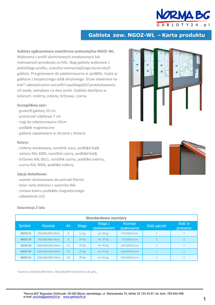 G A B L O T Y 2 4 . p l Gablota zew. NGOZ-WL – Karta produktu Gablota ogłoszeniowa zewnętrzna wolnostojąca NGOZ -WL. Wykonana z profili aluminiowych anodowanych lub malowanych proszkowo na RAL. Nogi gabloty wykonane z jednolitego profilu, znacząco wzmacniającego konstrukcję gabloty. Przygotowane do zabetonowania w podłożu. Szyba w gablocie z bezpiecznego szkła akrylowego. Drzwi otwierane na bok* zabezpieczone uszczelką zapobiegającą przedostawaniu się wody, zamykane na dwa zamki. Gablota dostępna w kolorach: srebrny, zielony, brązowy, czarny. Szczegółowy opis: - grubość gabloty 10 cm - przestrzeń użytkowa 7 cm - nogi do zabetonowania 50cm - podłoże magnetyczne - gablota zapakowana w skrzynie z drewna Kolory: - srebrny anodowany, narożnik szary, podkład biały - zielony RAL 6005, narożnik czarny, podkład biały - brązowy RAL 8011, narożnik czarny, podkład srebrny, - czarny RAL 9006, podkład srebrny Opcje dodatkowe: - wymiar dostosowany do potrzeb Klienta - kolor ramy dobrany z wzornika RAL - zmiana koloru podkładu magnetycznego - oświetlenie LED Gwarancja 2 lata Standardowe wymiary Rozmiar A4 Waga Waga z opakowaniem Rozmiar opakowania Ilość paczek Ilość w przesyłce NGOZ 51 50x100x200+50cm 6 11 kg. ok. 30 kg. 57x250x11cm 1 1 NGOZ 29 70x100x200+50cm 9 14 kg. ok. 32 kg. 77x250x11cm 1 1 NGOZ 39 100x100x200+50cm 12 19 kg. ok. 40 kg. 107x250x11cm 1 1 NGOZ 40 120x100x200+50cm 15 22 kg. ok. 45 kg. 124x250x11cm 1 1 NGOZ 41 150x100x200+50cm 18 26 kg. ok. 55 kg. 154x250x11cm 1 1 Symbol *wymiary 120x100x200+50cm, 150x100x200+50 otwierane do góry, "Norma BG" Bogusław Golińczak. 05-082 Blizne Jasińskiego, ul. Warszawska 74, tel/fax 22 723 43 87, tel. kom. 793-932-488 e-mail: [email protected] www.gabloty24.pl 1 G A B L O T Y 2 4 . p l Gablota zew. NGOZ-WL – Karta produktu "Norma BG" Bogusław Golińczak. 05-082 Blizne Jasińskiego, ul. Warszawska 74, tel/fax 22 723 43 87, tel. kom. 793-932-488 e-mail: [email protected] www.gabloty24.pl 2
