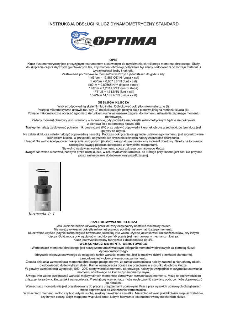 INSTRUKCJA OBSŁUGI KLUCZ DYNAMOMETRYCZNY STANDARD OPIS Klucz dynamometryczny jest precyzyjnym instrumentem stosowanym do uzyskiwania określonego momentu obrotowego. Służy do skręcania części złącznych gwintowanych tak, aby moment obrotowy połączenia był znany i odpowiedni do rodzaju materiału i wytrzymałości śruby i nakrętki. Zestawienie porównawcze momentów w różnych jednostkach długości i siły: 1 kG*cm = 13,887 OZ*IN (uncja x cal) 1 kG*cm = 0,867 LB*IN (funt x cal) 1kG*m = 9,80665 N*m (Niuton x metr) 1 kG*m = 7,233 LB*FT (funt x stopa) 1FT*LB = 12 LB*IN (funt x cal) 1dm*N = 14,16 OZ*IN (uncja x cal) OBSŁ UGA KL UCZA Wybrać odpowiednią skalę Nm lub in-lbs. Odblokować pokrętło mikrometryczne (I). Pokrętło mikrometryczne ustawić tak, aby „0” na skali pokrętła pokryło się z pionową linią na ramieniu klucza (II). Pokrętło mikrometryczne obracać zgodnie z kierunkiem ruchu wskazówek zegara, do momentu ustawienia żądanego momentu obrotowego. Żądany moment obrotowy jest ustawiony w momencie, gdy podziałka na pokrętle mikrometrycznym będzie się pokrywała z pionową linią na ramieniu klucza. (III) Następnie należy zablokować pokrętło mikrometryczne (IV) oraz ustawić odpowiedni kierunek obrotu grzechotki, po tym klucz jest gotowy do użytku. Na zabierak klucza należy nałożyć odpowiednią nasadkę. Podczas dokręcania osiągnięcie ustawionego momentu jest sygnalizowane kliknięciem klucza. W przypadku usłyszenia lub wyczucia kliknięcia należy zaprzestać dokręcania. Uwaga! Nie wolno kontynuować dokręcania śrub po tym jak klucz zasygnalizuje nastawiony moment obrotowy. Należy na to zwrócić szczególną uwagę podczas dokręcania z niewielkimi momentami. Nie wolno nastawiać wartości momentu spoza zakresu pomiarowego klucza. Uwaga! Nie wolno stosować, żadnych przedłużeń klucza, w celu wydłużenia ramienia, do którego przykładana jest siła. Na przykład przez zastosowanie dodatkowej rury przedłużającej. Ilustracja 1: 1 PRZECHOWYWAN IE KLUC ZA Jeśli klucz nie będzie używany przez dłuższy czas należy nastawić minimalny zakres. Nie należy wykręcać pokrętła mikrometrycznego poniżej nastawy najniższego momentu. Klucz wolno czyścić jedynie sucha miękka bawełnianą szmatką. Nie wolno używać jakichkolwiek rozpuszczalników, czy innych cieczy. Gdyż mogą one wypłukać smar, którym fabrycznie jest nasmarowany mechanizm klucza. Klucz jest wykalibrowany fabrycznie z dokładnością do 4%. WZMACNIACZ MOMENT U OBROTOWEGO Wzmacniacz momentu obrotowego jest narzędziem umożliwiającym osiąganie momentów obrotowych za pomocą klucza dynamometrycznego fabrycznie nieprzystosowanego do osiągania takich wartości momentu. Jest to możliwe dzięki przekładni planetarnej, zamontowanej w głowicy wzmacniacza momentu. Zasada działania wzmacniacza momentu obrotowego polega na tym, że ramie wzmacniacza należy zaprzeć o nieruchomy obiekt, o odpowiednio dużej wytrzymałości. Ramię wzmacniacza obraca się przeciwnie w stosunku do obrotu klucza. W głowicy wzmacniacza występują 10% - 20% straty wartości momentu obrotowego, należy je uwzględnić w przypadku ustawiania momentu obrotowego na kluczu dynamometrycznym. Uwaga! Nie wolno przekraczać wartości maksymalnych momentów obrotowych wzmacniacza momentu. Może to doprowadzić do zniszczenia zarówno klucza jak i wzmacniacza. Przeciążony wzmacniacz może nagle zwolnić stawiany opór, co może doprowadzić do obrażeń. Wzmacniacz momentu nie jest przystosowany do pracy z urządzeniami udarowymi. Praca przy wysokich udarowych obciążeniach może doprowadzić do zniszczenia wzmacniacza. Wzmacniacz momentu wolno czyścić jedynie suchą, miękką bawełnianą szmatką. Nie wolno używać jakichkolwiek rozpuszczalników, czy innych cieczy. Gdyż mogą one wypłukać smar, którym fabrycznie jest nasmarowany mechanizm klucza.