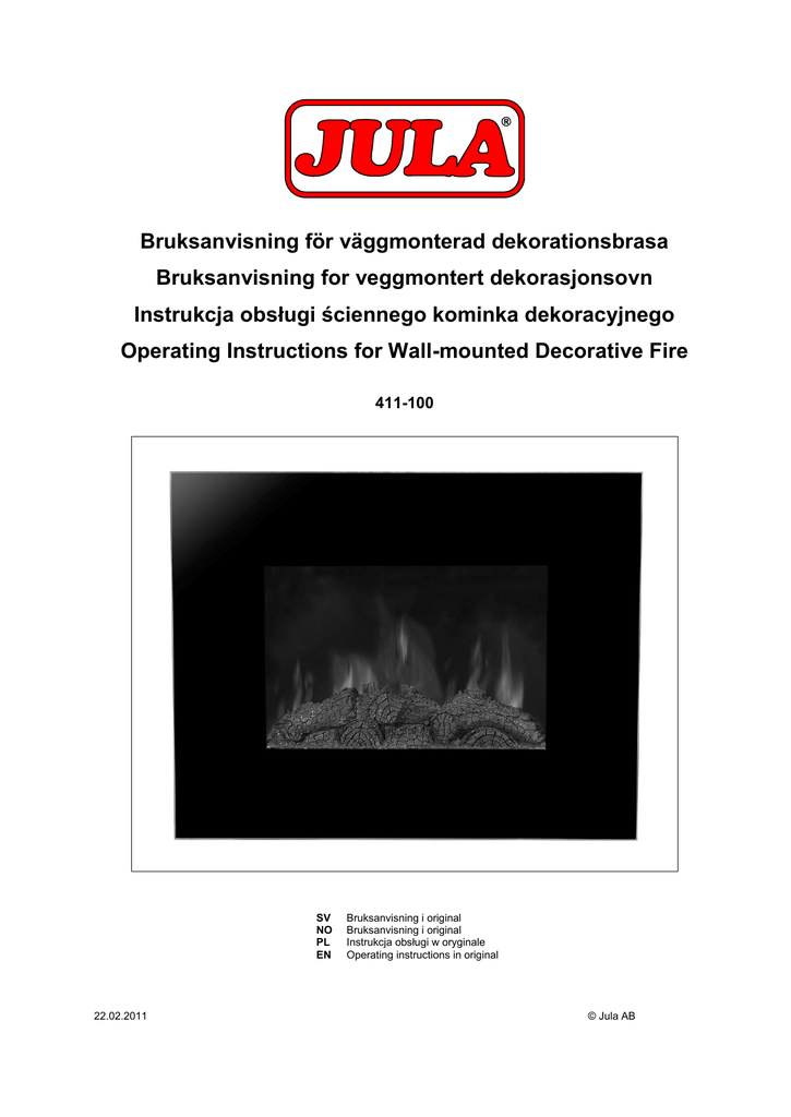 Bruksanvisning för väggmonterad dekorationsbrasa Bruksanvisning for veggmontert dekorasjonsovn Instrukcja obsługi ściennego kominka dekoracyjnego Operating Instructions for Wall-mounted Decorative Fire 411-100 SV NO PL EN 22.02.2011 Bruksanvisning i original Bruksanvisning i original Instrukcja obsługi w oryginale Operating instructions in original © Jula AB SVENSKA 4 SÄKERHETSANVISNINGAR ....................................................................................................................... 4 TEKNISKA DATA ......................................................................................................................................... 4 ILLUSTRATION ............................................................................................................................................ 5 HANDHAVANDE .......................................................................................................................................... 6 Uppackning .......................................................................................................................................... 6 Före montering ..................................................................................................................................... 6 Installation (se fig. 1–4) ........................................................................................................................ 6 Lampbyte (fig. 5 och 6) ........................................................................................................................ 6 Manuell manövrering ........................................................................................................................... 7 Fjärrstyrning ......................................................................................................................................... 7 Överhettningsskydd ............................................................................................................................. 7 UNDERHÅLL ................................................................................................................................................ 7 Rengöring ............................................................................................................................................ 7 FELSÖKNING............................................................................................................................................... 7 NORSK 8 SIKKERHETSANVISNINGER ...................................................................................................................... 8 TEKNISKE DATA ......................................................................................................................................... 8 ILLUSTRASJON ........................................................................................................................................... 9 BRUK .......................................................................................................................................................... 10 Oppstart ............................................................................................................................................. 10 Nyttige råd før montering ................................................................................................................... 10 Montering (se fig. 1-4) ........................................................................................................................ 10 Skifte av pære (se fig. 5 og 6) ............................................................................................................ 10 Manuell bruk ...................................................................................................................................... 11 Bruk med fjernkontroll ........................................................................................................................ 11 Sikkerhetsbryter ................................................................................................................................. 11 VEDLIKEHOLD .......................................................................................................................................... 11 Rengjøring ......................................................................................................................................... 11 FEILSØKING .............................................................................................................................................. 11 POLSKI 12 ZASADY BEZPIECZEŃSTWA ................................................................................................................... 12 DANE TECHNICZNE ................................................................................................................................. 12 RYSUNEK .................................................................................................................................................. 13 OBSŁUGA .................................................................................................................................................. 14 Rozpakowywanie ............................................................................................................................... 14 Przed montażem ................................................................................................................................ 14 INSTALACJA (zobacz rys. 1–4) ........................................................................................................ 14 Wymiana żarówki (rys. 5 i 6) .............................................................................................................. 14 Ręczne sterowanie ............................................................................................................................ 15 Zdalne sterowanie....