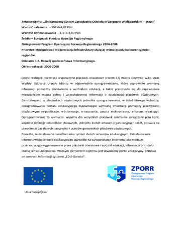 Tytuł projektu: „Zintegrowany System Zarządzania Oświatą w Gorzowie Wielkopolskim – etap I” Wartość całkowita - 504 444,01 PLN Wartość dofinansowania - 378 333,00 PLN Źródło – Europejski Fundusz Rozwoju Regionalnego Zintegrowany Program Operacyjny Rozwoju Regionalnego 2004-2006 Priorytet I Rozbudowa i modernizacja infrastruktury służącej wzmocnieniu konkurencyjności regionów, Działanie 1.5. Rozwój społeczeństwa informacyjnego. Okres realizacji: 2006-2008 Dzięki realizacji inwestycji wyposażono placówki oświatowe (razem 67) miasta Gorzowa Wlkp. oraz Wydział Edukacji Urzędu Miasta w odpowiednie oprogramowanie, które usprawniło wymianę informacji pomiędzy placówkami a wydziałem edukacji, a także przyczyniło się do zapewnienia mieszkańcom miasta pełnej i wszechstronnej informacji o działalności placówek oświatowych. Zainstalowano w placówkach oświatowych jednolite oprogramowanie, w skład którego wchodzą: oprogramowanie portalu edukacyjnego zapewniające wymianę informacji pomiędzy placówkami oświatowymi (e-publikacje, e-informacje, e-nauczanie, poczta elektroniczna, e-forum, e-zakupy). Oprogramowanie to wymusza: wspólny dla wszystkich placówek centralnie zarządzany plan kont, wspólne definicje składników płacowych, jednolity kształt arkuszy organizacyjnych szkół, pozwala na utworzenie baz danych nauczycieli i uczniów gorzowskich placówek oświatowych. Ponadto, zainstalowano i uruchomiono system dwóch serwerów edukacyjnych. Zainstalowanie internetowego serwera edukacyjnego pozwoliło na wykorzystanie Internetu jako medium przenoszącego wygenerowane przez placówki oświatowe i wydział edukacji, informacje oraz dało szansę ich upublicznienia. Ważnym elementem systemu jest utworzony portal edukacyjny. Stanowi on centrum informacji systemu „EDU-Gorzów". Unia Europejska