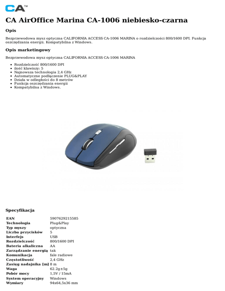 CAAirOfficeMarinaCA-1006niebiesko-czarna Opis BezprzewodowamyszoptycznaCALIFORNIAACCESSCA-1006MARINAorozdzielczości800/1600DPI.Funkcja oszczędzaniaenergii.KompatybilnazWindows. Opismarketingowy BezprzewodowamyszoptycznaCALIFORNIAACCESSCA-1006MARINA Rozdzielczość800/1600DPI ilośćklawiszy:5 Najnowszatechnologia2,4GHz AutomatycznepodłączeniePLUG&PLAY Działawodległoścido8metrów Funkcjaoszczędzaniaenergii KompatybilnazWindows. Specyfikacja EAN 5907629215585 Technologia Plug&Play Typmyszy optyczna Liczbaprzycisków 5 Interfejs USB Rozdzielczość 800/1600DPI Bateriaalkaliczna AA Zarządzanieenergią tak Komunikacja faleradiowe Częstotliwość 2,4GHz Zasięgnadajnika[m] 8m Waga 62.2g±5g Pobórmocy 1,5V/15mA Systemoperacyjny Wymiary Windows 94x64,5x36mm Kolor Gwarancja e-mail:[email protected] niebiesko-czarny 2lata ©2015-2017CaliforniaAccessWszystkieprawazastrzeżone