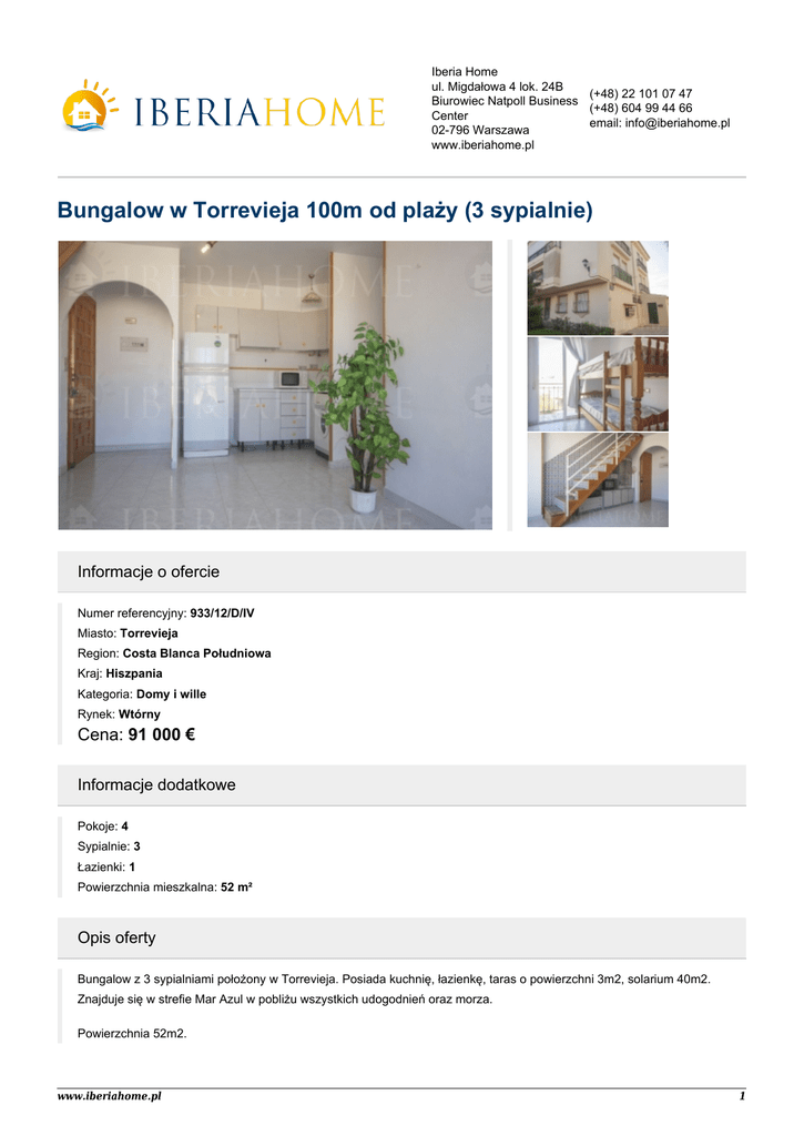 Iberia Home ul. Migdałowa 4 lok. 24B (+48) 22 101 07 47 Biurowiec Natpoll Business (+48) 604 99 44 66 Center email: [email protected] 02-796 Warszawa www.iberiahome.pl Bungalow w Torrevieja 100m od plaży (3 sypialnie) Informacje o ofercie Numer referencyjny: 933/12/D/IV Miasto: Torrevieja Region: Costa Blanca Południowa Kraj: Hiszpania Kategoria: Domy i wille Rynek: Wtórny Cena: 91 000 € Informacje dodatkowe Pokoje: 4 Sypialnie: 3 Łazienki: 1 Powierzchnia mieszkalna: 52 m² Opis oferty Bungalow z 3 sypialniami położony w Torrevieja. Posiada kuchnię, łazienkę, taras o powierzchni 3m2, solarium 40m2. Znajduje się w strefie Mar Azul w pobliżu wszystkich udogodnień oraz morza. Powierzchnia 52m2. www.iberiahome.pl 1 Udogodnienia ● Taras ● Umeblowany www.iberiahome.pl 2