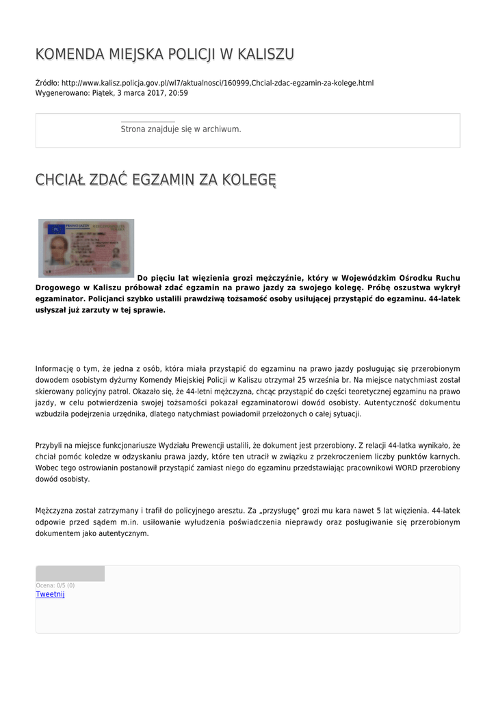 KOMENDA MIEJSKA POLICJI W KALISZU Źródło: http://www.kalisz.policja.gov.pl/wl7/aktualnosci/160999,Chcial-zdac-egzamin-za-kolege.html Wygenerowano: Piątek, 3 marca 2017, 20:59 Strona znajduje się w archiwum. CHCIAŁ ZDAĆ EGZAMIN ZA KOLEGĘ Do pięciu lat więzienia grozi mężczyźnie, który w Wojewódzkim Ośrodku Ruchu Drogowego w Kaliszu próbował zdać egzamin na prawo jazdy za swojego kolegę. Próbę oszustwa wykrył egzaminator. Policjanci szybko ustalili prawdziwą tożsamość osoby usiłującej przystąpić do egzaminu. 44-latek usłyszał już zarzuty w tej sprawie. Informację o tym, że jedna z osób, która miała przystąpić do egzaminu na prawo jazdy posługując się przerobionym dowodem osobistym dyżurny Komendy Miejskiej Policji w Kaliszu otrzymał 25 września br. Na miejsce natychmiast został skierowany policyjny patrol. Okazało się, że 44-letni mężczyzna, chcąc przystąpić do części teoretycznej egzaminu na prawo jazdy, w celu potwierdzenia swojej tożsamości pokazał egzaminatorowi dowód osobisty. Autentyczność dokumentu wzbudziła podejrzenia urzędnika, dlatego natychmiast powiadomił przełożonych o całej sytuacji. Przybyli na miejsce funkcjonariusze Wydziału Prewencji ustalili, że dokument jest przerobiony. Z relacji 44-latka wynikało, że chciał pomóc koledze w odzyskaniu prawa jazdy, które ten utracił w związku z przekroczeniem liczby punktów karnych. Wobec tego ostrowianin postanowił przystąpić zamiast niego do egzaminu przedstawiając pracownikowi WORD przerobiony dowód osobisty. Mężczyzna został zatrzymany i trafił do policyjnego aresztu. Za „przysługę” grozi mu kara nawet 5 lat więzienia. 44-latek odpowie przed sądem m.in. usiłowanie wyłudzenia poświadczenia nieprawdy oraz posługiwanie się przerobionym dokumentem jako autentycznym. Ocena: 0/5 (0) Tweetnij