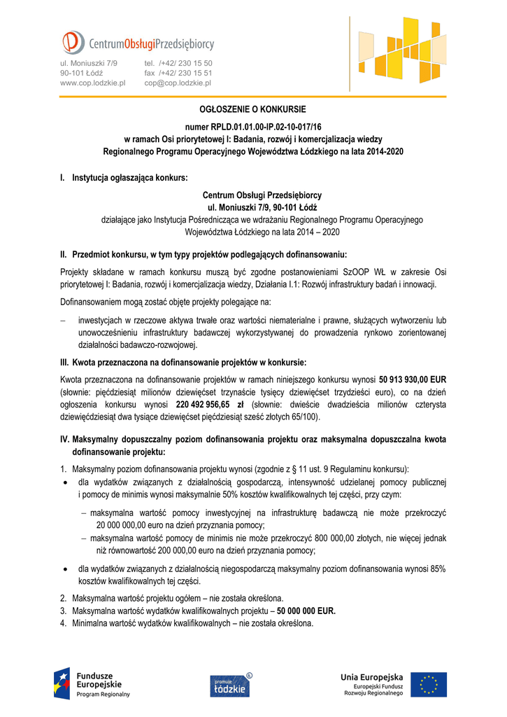 ul. Moniuszki 7/9 90-101 Łódź www.cop.lodzkie.pl tel. /+42/ 230 15 50 fax /+42/ 230 15 51 [email protected] OGŁOSZENIE O KONKURSIE numer RPLD.01.01.00-IP.02-10-017/16 w ramach Osi priorytetowej I: Badania, rozwój i komercjalizacja wiedzy Regionalnego Programu Operacyjnego Województwa Łódzkiego na lata 2014-2020 I. Instytucja ogłaszająca konkurs: Centrum Obsługi Przedsiębiorcy ul. Moniuszki 7/9, 90-101 Łódź działające jako Instytucja Pośrednicząca we wdrażaniu Regionalnego Programu Operacyjnego Województwa Łódzkiego na lata 2014 – 2020 II. Przedmiot konkursu, w tym typy projektów podlegających dofinansowaniu: Projekty składane w ramach konkursu muszą być zgodne postanowieniami SzOOP WŁ w zakresie Osi priorytetowej I: Badania, rozwój i komercjalizacja wiedzy, Działania I.1: Rozwój infrastruktury badań i innowacji. Dofinansowaniem mogą zostać objęte projekty polegające na: inwestycjach w rzeczowe aktywa trwałe oraz wartości niematerialne i prawne, służących wytworzeniu lub unowocześnieniu infrastruktury badawczej wykorzystywanej do prowadzenia rynkowo zorientowanej działalności badawczo-rozwojowej. III. Kwota przeznaczona na dofinansowanie projektów w konkursie: Kwota przeznaczona na dofinansowanie projektów w ramach niniejszego konkursu wynosi 50 913 930,00 EUR (słownie: pięćdziesiąt milionów dziewięćset trzynaście tysięcy dziewięćset trzydzieści euro), co na dzień ogłoszenia konkursu wynosi 220 492 956,65 zł (słownie: dwieście dwadzieścia milionów czterysta dziewięćdziesiąt dwa tysiące dziewięćset pięćdziesiąt sześć złotych 65/100). IV. Maksymalny dopuszczalny poziom dofinansowania projektu oraz maksymalna dopuszczalna kwota dofinansowanie projektu: 1. Maksymalny poziom dofinansowania projektu wynosi (zgodnie z § 11 ust. 9 Regulaminu konkursu): dla wydatków związanych z działalnością gospodarczą, intensywność udzielanej pomocy publicznej i pomocy de minimis wynosi maksymalnie 50% kosztów kwalifikowalnych tej części, przy czym: maksymalna wartość pomocy inwestycyjnej na infrastrukturę badawczą nie może przekroczyć 20 000 000,00 euro na dzień przyznania pomocy; maksymalna wartość pomocy de minimis nie może przekroczyć 800 000,00 złotych, nie więcej jednak niż równowartość 200 000,00 euro na dzień przyznania pomocy; dla wydatków związanych z działalnością niegospodarczą maksymalny poziom dofinansowania wynosi 85% kosztów kwalifikowalnych tej części. 2. Maksymalna wartość projektu ogółem – nie została określona. 3. Maksymalna wartość wydatków kwalifikowalnych projektu – 50 000 000 EUR. 4. Minimalna wartość wydatków kwalifikowalnych – nie została określona. V. Termin, miejsce i forma składania wniosku o dofinansowanie projektu: Termin ogłoszenia konkursu: 23 listopada 2016 r. Nabór wniosków o dofinansowanie rozpoczyna się 27 grudnia 2016 r., a kończy 28 lutego 2017 r. Termin naboru wniosków nie podlega przywróceniu. Wnioski o dofinansowanie należy składać osobiście w dni robocze w godzinach pracy Centrum Obsługi przedsiębiorcy lub przesłać na adres: Centrum Obsługi Przedsiębiorcy Zespół Konsultantów ul. Moniuszki 7/9, 90-101 Łódź Wniosek o dofinansowanie należy przygotować zgodnie z Instrukcją wypełniania wniosku o dofinansowanie i złożyć w wersji papierowej w formacie A4, w jednym egzemplarzu oraz w formie elektronicznej na nośniku elektronicznym (np. płycie CD-R/DVD) w wersji tożsamej z wersją papierową. Formularz wniosku o dofinansowanie wraz z instrukcją jego wypełniania został udostępniony na stronie internetowej: www.cop.lodzkie.pl; www.rpo.lodzkie.pl; www.funduszeeuropejskie.gov.pl. VI. Sposób i miejsce udostępnienia regulaminu konkursu: Szczegółowe informacje o konkursie zawarte zostały w Regulaminie konkursu numer RPLD.01.01.00-IP.02-10017/16 w ramach Regionalnego Programu Operacyjnego Województwa Łódzkiego na lata 2014-2020 Osi priorytetowej I: Badania, rozwój i komercjalizacja wiedzy, Działania I.1: Rozwój infrastruktury badań i innowacji, który wraz z załącznikami został zamieszczony na stronie internetowej Centrum Obsługi Przedsiębiorcy pod adresem www.cop.lodzkie.pl oraz Portalu Funduszy Europejskich www.funduszeeuropejskie.gov.pl oraz na stronie internetowej www.rpo.lodzkie.pl.