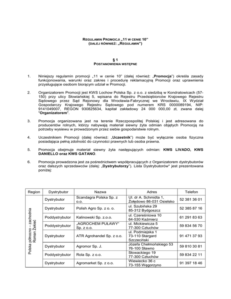 REGULAMIN PROMOCJI „11 W CENIE 10” (DALEJ RÓWNIEŻ: „REGULAMIN”) §1 POSTANOWIENIA WSTĘPNE 1. Niniejszy regulamin promocji „11 w cenie 10” (dalej również: „Promocja”) określa zasady funkcjonowania, warunki oraz zakres i procedurę reklamacyjną Promocji oraz uprawnienia przysługujące osobom biorącym udział w Promocji. 2. Organizatorem Promocji jest KWS Lochow Polska Sp. z o.o. z siedzibą w Kondratowicach (57150) przy ulicy Słowiańskiej 5, wpisana do Rejestru Przedsiębiorców Krajowego Rejestru Sądowego przez Sąd Rejonowy dla Wrocławia-Fabrycznej we Wrocławiu, IX Wydział Gospodarczy Krajowego Rejestru Sądowego pod numerem KRS 0000089194, NIP: 9141049007, REGON 930825634, kapitał zakładowy 24 000 000,00 zł, zwana dalej "Organizatorem". 3. Promocja organizowana jest na terenie Rzeczpospolitej Polskiej i jest adresowana do producentów rolnych, którzy nabywają materiał siewny żyta odmian objętych Promocją na potrzeby wysiewu w prowadzonym przez siebie gospodarstwie rolnym. 4. Uczestnikiem Promocji (dalej również: „Uczestnik”) może być wyłącznie osoba fizyczna posiadająca pełną zdolność do czynności prawnych lub osoba prawna. 5. Promocja obejmuje materiał siewny żyta następujących odmian: KWS LIVADO, KWS DANIELLO oraz KWS GATANO. 6. Promocja prowadzona jest za pośrednictwem współpracujących z Organizatorem dystrybutorów oraz dalszych sprzedawców (dalej: „Dystrybutorzy”). Lista Dystrybutorów* jest prezentowana poniżej: Polska północno – zachodnia Roman Żekieć Region Dystrybutor Nazwa Dystrybutor Scandagra Polska Sp. z o.o. Dystrybutor Polish Agro Sp. z o. o. Poddystrybutor Kalinowski Sp. z.o.o. Poddystrybutor „AGROCHEM PUŁAWY“ Sp. z o.o. Dystrybutor ATR Agrohandel Sp. z o.o. Dystrybutor Agromor Sp. J. Poddystrybutor Rola Sp. z o.o. Dystrybutor Agromarket Sp. z o.o. Adres Ul. dr A. Schmidta 1, Żołędowo 86-031 Osielsko ul. Szubińska 29 85-312 Bydgoszcz ul. Czereśniowa 10 64-530 Kaźmierz ul. Mickiewicza 5 77-300 Człuchów ul. Podmiejska 1 73-110 Stargard Szczeciński Józefa Chełmońskiego 53 76-100 Sławno Słowackiego 19 77-300 Człuchów Wiewiecko 36 c 73-155 Węgorzyno Telefon 52 381 36 01 52 385 87 16 61 291 83 63 59 834 56 70 91 471 37 93 59 810 30 81 59 834 22 11 91 397 18 46 Dystrybutor Nazwa Dystrybutor Osadkowski-Cebulski Sp. z o.o. Dystrybutor Osadkowski S.A. Poddystrybutor "Agro-Efekt" Sp. z o.o. Poddystrybutor Dystrybutor Firma Nasienna Granum Poddystrybutor Centrala Nasienna Sp. z o.o. w Sieradzu Polska północno-wschodnia Łukasz Preuss Poddystrybutor Przedsiębiorstwo Zaopatrzenia Rolnictwa Chempest S.A. PPHU "ANAS" Andrzej Antczak Dystrybutor Agrolok Sp. z o.o. Dystrybutor Ampol-Merol Sp. z o.o. Dystrybutor PZZ w Kwidzynie Spółka z o.o. Dystrybutor Rolimpex S.A. Dystrybutor Agro-Sieć Sp. z o.o. Polska południowo – wschodnia Łukasz Wnuk Polska południowo-zachodnia. Marcin Hoffmann Region Poddystrybutor Poddystrybutor Dystrybutor Poddystrybutor Poddystrybutor Centrum HandlowoUsługowe „BUGAJ” P.H. AGRO-TERS E.SOLAK & S.SOLAK Sp. J. Przedsiębiorstwo Handlowe Agroskład Centrala Nasienna w Warszawie sp. z o.o Przedsiębiorstwo Handlowe AGRO-POL Wojciech Białecki Poddystrybutor ¨Agricola-Lublin¨ Sp. z o.o. Dystrybutor CENTRALA NASIENNA w Kielcach Sp. z o.o. Adres ul. Nasienna 6 59-220 Legnica ul. Kolejowa 6 56-420 Bierutów ul. Parkowa 14 56-500 Syców ul. Łąkowa 24 47-400 Racibórz Ul. Targowa 12 99-200 Poddębice Wodzierady 81 98-105 Wodzierady ul. POW 30 98-200 Sieradz Ul. Dworcowa 4 87-400 Golub-Dobrzyń ul. Mikołaja z Ryńska 28a 87-200 Wąbrzeźno ul. Południowa 14A 82-500 Kwidzyn ul. Lubawska 7 14-200 Iława ul. Przemysłowa 6 86-200 Chełmno Zągoty 22 09-230 Bielsk ul. Rampa Brzeska 3 22-100 Chełm Józefin 39 97-225 Ujazd ul. Nasielska 8 06-100 Pułtusk ul. Dolna 38 08-500 Ryki Ciecierzyn 121A 21-003 Ciecierzyn ul. Henryka Sienkiewicza 76 25-501 Kielce Telefon 76 850 61 49 71 394 70 20 62 786 84 00 32 412 50 00 43 678 32 26 43 677 31 26 43 827 13 31 56 682 38 88 56 688 48 09 55 279 34 26 89 648 25 40 56 677 04 60 24 267 73 90 82 565 40 70 44 719 24 88 22 335 59 74 81 865 45 44 81 756 13 12 41 368 45 02 *W celu uzyskania informacji na temat dostępności odmian żyta hybrydowego KWS, zachęcamy do kontaktu z naszymi Przedstawicielami Handlowymi oraz z siecią dystrybucji i poddystrybucji KWS Zboża pod wskazanymi numerami telefonów. §2 PRZEDMIOT I CZAS TRWANIA PROMOCJI ORAZ WARUNKI UCZESTNICTWA W PROMOCJI 1. Przedmiotem Promocji jest udzielenie rabatu towarowego na zakup jednostek siewnych odmian objętych Promocją. Przy zakupie każdych 10 jednostek siewnych odmiany objętej Promocją do zakupu zostanie dodana dodatkowa jednostka siewna tej samej odmiany, co spowoduje proporcjonalne obniżenie ceny jednostkowej jednostek siewnych objętych zakupem. 2. Warunkiem uzyskania rabatu, o którym mowa w ust. 1 powyżej, jest przekazanie Dystrybutorowi w trakcie zakupu prawidłowo wypełnionego i podpisanego Kuponu w okresie jego ważności, zawierającego dane na potrzeby wystawienia faktury VAT. Prawidłowość danych może być weryfikowana przez Dystrybutorów i przez Organizatora. 3. Kupony będą dostępne m.in. w punktach sprzedażowych Dystrybutorów, na stronie internetowej Organizatora, u przedstawicieli handlowych Organizatora, na targach branżowych, w okresie od 01.06.2016 do 31.08.2016 nie dłużej jednak niż do czasu wyczerpania zapasu odmian objętych Promocją w poszczególnych punktach sprzedażowych Dystrybutorów. 4. Kupony mogą być wykorzystane do dnia 31.10.2016 r., nie później jednak niż do momentu wyczerpania zapasu jednostek siewnych odmian objętych Promocją. 5. Jeden Kupon może być wykorzystany tylko w trakcie jednego zakupu. 6. W Promocji nie mogą uczestniczyć pracownicy i przedstawiciele Organizatora, podmiotów sprzedających produkty objęte Promocją, jak również pracownicy podmiotów biorących bezpośredni udział w przy