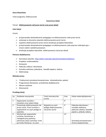 Anna Niewińska Treść programu: Elektryczność Scenariusz lekcji Temat: Elektryzowanie ciał przez tarcie oraz przez dotyk Cele lekcji: Uczeń; • • • • • przeprowadza doświadczenie polegające na elektryzowaniu ciała przez tarcie wskazuje w otoczeniu zjawiska elektryzowania przez tarcie wyjaśnia elektryzowanie przez tarcie (analizuje przepływ ładunków) przeprowadza doświadczenie polegające na elektryzowaniu ciała poprzez zetknięcie go z innym ciałem naelektryzowanym. Analizuje przepływ ładunków elektryzowania ciał przez dotyk. Pomoce dydaktyczne; • • • • • • Symulacja zjawiska http://phet.colorado.edu/en/simulation/balloons Projektor multimedialny Komputer Pałeczka szklana i ebonitowa Szmatka wełniana, jedwabna, kawałki papieru, balony Elektroskop Metody pracy; • • • • Praktyczne( symulacja komputerowa, doświadczenie, pokaz) Programowe (komputer, przedmioty dydaktyczne) Głośne myślenie Glosowanie Przebieg lekcji; Lp. Działanie nauczyciela 1 Zapoznanie uczniów z tematem oraz celami lekcji Prezentuje elektryzowanie ciał przez tracie. Prosi uczniów o wyjaśnienie na czym polega to zjawisko. Wysłuchuje wypowiedzi uczniów, komentuje, a następnie przy pomocy pierwszej części symulacji krok po kroku tłumaczy na czym 2 3 Treść instrukcji dla ucznia Czas Użyte materiały/pomoce 3! Wyjaśnij na czym polega elektryzowanie ciał przez tarcie 3! Pałeczka ebonitowa i szmatka wełniana, pałeczka szklana, kawałek papieru, jedwab, balony 12! Symulacja komputerowa – strona wydawnictwa polega ten sposób elektryzowania ciał. 4. Weryfikuje przykłady podawane przez uczniów oraz analizę przepływu elektronów 5 Prezentuje elektroskop, jego budowę, zasadę działania Prezentuje elektryzowanie ciał przez dotyk. Prosi uczniów o wyjaśnienie – na czym polega ten sposób elektryzowania ciał. Wysłuchuje wypowiedzi uczniów, komentuje je, a następnie przy pomocy drugiej części symulacji krok po kroku tłumaczy elektryzowanie ciał przez dotyk. Podsumowuje lekcję. Udostępnia uczniom rysunki z symulacji. 6 7 8 ZamKor.pl http://phet.colorado.edu/ en/simulation/balloons Podaj kilka przykładów elektryzowania ciał przez tarcie w najbliższym otoczeniu i wykorzystując te ciała, w tej chwili, zaprezentuj ten sposób. Dokonaj analizy przepływu elektronów pomiędzy tymi ciałami. 5! 5! elektroskop 12! Elektroskop, naelektryzowana wcześniej przez tarcie pałeczka ebonitowa i szklana. Symulacja komputerowa Wyjaśnij na czym polega elektryzowanie ciał przez dotyk. Wklejają do zeszytu. 2! Praca domowa – zapoznanie się z odsyłaczami do lekcji http://www.scholaris.pl/frontend,4,82163.html – elektryzowanie przez dotyk http://www.scholaris.pl/frontend,4,91276.html – rozkład ładunków w atomie.
