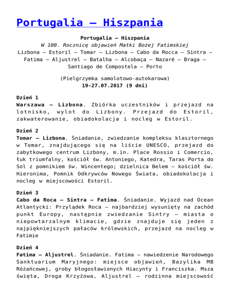 Portugalia – Hiszpania Portugalia – Hiszpania W 100. Rocznicę objawień Matki Bożej Fatimskiej Lizbona – Estoril – Tomar – Lizbona – Cabo da Rocca – Sintra – Fatima – Aljustrel – Batalha – Alcobaça – Nazaré – Braga – Santiago de Compostela – Porto (Pielgrzymka samolotowo-autokarowa) 19-27.07.2017 (9 dni) Dzień 1 Warszawa – Lizbona. Zbiórka uczestników i przejazd na lotnisko, wylot do Lizbony. Przejazd do Estoril, zakwaterowanie, obiadokolacja i nocleg w Estoril. Dzień 2 Tomar – Lizbona. Śniadanie, zwiedzanie kompleksu klasztornego w Tomar, znajdującego się na liście UNESCO, przejazd do zabytkowego centrum Lizbony, m.in. Place Rossio i Comercio, łuk triumfalny, kościół św. Antoniego, Katedra, Taras Porta do Sol z pomnikiem św. Wincentego; dzielnica Belem – kościół św. Hieronima, Pomnik Odkrywców Nowego Świata, obiadokolacja i nocleg w miejscowości Estoril. Dzień 3 Cabo da Roca – Sintra – Fatima. Śniadanie. Wyjazd nad Ocean Atlantycki: Przylądek Roca – najbardziej wysunięty na zachód punkt Europy, następnie zwiedzanie Sintry – miasta o niepowtarzalnym klimacie, gdzie znajduje się jeden z najpiękniejszych pałaców królewskich, przejazd na nocleg w Fatimie Dzień 4 Fatima – Aljustrel. Śniadanie. Fatima – nawiedzenie Narodowego Sanktuarium Maryjnego: miejsce objawień, Bazylika MB Różańcowej, groby błogosławionych Hiacynty i Franciszka. Msza święta, Droga Krzyżowa, Aljustrel – rodzinna miejscowość Franciszka, Hiacynty i Łucji; różańcowa i nocleg w Fatimie. obiadokolacja, procesja Dzień 5 Batalha – Alcobaca – Nazaré. Śniadanie, przejazd do Batalha i Alcobaca – zwiedzimy dwa zespoły klasztorne, ujęte z uwagi na piękno architektury i bogatą historię na liście UNESCO, odwiedzimy też najstarsza dawna wioskę rybacką – Nazaré – zwiedzimy kościół Matki Bożej z Nazaretu; możliwość odpoczynku na plaży. Powrót do Fatimy późnym popołudniem, obiadokolacja, nabożeństwo różańcowe i procesja różańcowa ze świecami, nocleg w Fatimie. Dzień 6 Braga – Santiago de Compostela. Po śniadaniu, wyruszamy na północ kraju – przejazd przez Bragę – religijne centrum Portugalii, będące już w XII w. siedzibą biskupią, miasto też jest określane jako „Portugalski Rzym” i nawiedzenie Sanktuarium Bom Jesus do Monte. Późnym wieczorem przyjazd do Santiago de Compostela, obiadokolacja i nocleg. Dzień 7 Santiago de Compostela. Śniadanie, msza św. w sanktuarium św. Jakuba Apostoła w Santiago de Compostela, zwiedzanie: zabytkowy zespół Starego Miasta (wpisany na listę światowego dziedzictwa UNESCO). Obiadokolacja i nocleg. Dzień 8 Porto. Śniadanie, powrót do Portugalii, przejazd do Porto. Msza św. w katedrze; zwiedzanie jednego z najpiękniej położonych miast Europy, nad skalistymi wąwozami rzeki Douro, spiętego mostami z czasów G. Eiffla, niezwykłe zabytki i składy win o światowej sławie, rejs statkiem po rzece Douro, możliwość zwiedzenia słynnych zakładów/piwnic winiarskich producenta wina „Porto Offley”, degustacja, zakupy. Przyjazd do Fatimy, obiadokolacja, udział w procesji różańcowej i nocleg w Fatimie. Dzień 9 Lizbona – Warszawa. Śniadanie, lotnisko, powrót do Polski. przejazd do Lizbony na Świadczenia: • bilety samolotowe • transfer z i na lotnisko • autokar do dyspozycji na miejscu • pokoje 2-3 osobowe w hotelach 3* z klimatyzacją • śniadania i obiadokolacje • opieka licencjonowanego pilota na całej trasie pielgrzymki • codzienna msza św. • opieka duchowa kapłana na całej trasie • bilety wstępów do zwiedzanych obiektów • opłaty za przewodników lokalnych • ubezpieczenie NNW i KL oraz chorób przewlekłych i bagażu • system Tour Audio Guide Cena nie obejmuje: • dopłaty do pokoju jednoosobowego (160 EUR) • napiwków dla pilota, kierowców, obsługi hotelowej (40 EUR) • napojów do obiadokolacji • wydatków osobistych Ważne informacje: • organizator zastrzega sobie prawo zmiany kolejności zwiedzania w zależności od: pogody, kondycji uczestników oraz godzin otwarcia obiektów • cena wyjazdu zawiera składkę do Turystycznego Funduszu Gwarancyjnego