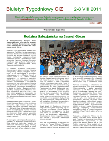 Biuletyn Tygodniowy CIZ 2-8 VIII 2011 Biuletyn Centrum Informacyjnego Zakonów opracowywany przez zespół portalu internetowego www.zyciezakonne.pl i sekretariat Konferencji Wyższych Przełożonych Zakonów Męskich 32/2011 (127) Wiadomość tygodnia Rodzina Salezjańska na Jasnej Górze VI Międzynarodowy Kongres Maryi Wspomożycielki, gromadzący przestawicieli Rodziny Salezjańskiej z całego świata, odbywał się w dniach 3-6 sierpnia na Jasnej Górze. Przeszło 1100 uczestników zostało przywitanych w Auli Ojca Kordeckiego Jasnogórskiego Sanktuarium przez organizatora spotkania ks. Adriano Bregolina, arcybiskupa metropolitę częstochowskiego Stanisława Nowaka i Przełożonego Generalnego ks. Pascuala Cháveza Villanueva. Inicjatorem tego spotkania Rodziny Salezjańskiej jest Stowarzyszenie Maryi Wspomożycielki (ADMA). Ks. Bregolin, Wikariusz Przełożonego Generalnego i główny animator Rodziny Salezjańskiej, witając przybyłych przypomniał, że na zakończenie V Kongresu, odbywającego się w Mieście Meksyk w sierpniu 2007 r., ks. Chávez wskazał uczestnikom, a zwłaszcza członkom ADMA, trzy szczególne obszary zaangażowania: przypomnienie i niezachwiane proponowanie wszystkim grupom Rodziny Salezjańskiej kultu Maryi Wspomożycielki, stanowiącego nieodzowną charakterystykę życia ks. Bosko i Duchowości Salezjańskiej; propagowanie pobożności maryjnej szczególnie wśród młodzieży i młodych rodzin; pogłębienie pobożności ma ryjnej, przede wszystkim w świetle adhortacji apostolskiej papieża Pawła VI "Marialis Cultus". Następnie zabrał głos Arcybiskup Częstochowy Stanisław Nowak: „Jako arcybiskup metropolita tego miejsca powiem, że czujemy się bardzo złączeni z Salezjanami i Córkami Maryi Wspomożycielki, którzy nie oszczędzają się w pracy na rzecz najuboższej młodzieży. Jesteśmy dumni z ich obecności. Dzięki waszej wspaniałej Rodzinie w naszej diecezji jest więcej światła i radości”. Po czym głos zabrał Ojciec Rodziny Salezjańskiej, ks. Pascual Chávez Villanueva, który skierował tradycyjne "słówko na dobranoc". Wymieniając grupy Rodziny Salezjańskiej, które odnoszą się w swojej nazwie do tytułu Wspomożycielki, stwier- dził: "Można zatem zasadnie twierdzić, że Rodzina Salezjańska jest Rodziną Maryjną". Hasło Kongresu „Totus Tuus", wskazując na świętość i wielką pobożność maryjną błogosławionego Jana Pawła II, wyraża także synowskie zaufanie Rodziny Salezjańskiej do Maryi Wspomożycielki. Przypomniał, że Mama Małgorzata przypomniała Jankowi w przededniu jego wyjazdu do seminarium: "Kiedy przyszedłeś na świat, poświęciłam cię Najświętszej Maryi Pannie, kiedy rozpocząłeś studia, poleciłam ci nabożeństwo do naszej Matki; a teraz polecam abyś „był cały Jej", kochaj kolegów czczących Maryję, a jeśli zostaniesz księdzem, zawsze zachęcaj i propaguj nabożeństwo do Maryi". Drugi dzień VI Światowego Kongresu Maryi Wspomożycielki rozpoczął się Eucharystią u stóp obrazu Czarnej Madonny w Sanktuarium Jasnogórskim. Na dwie sesje obrad, do południa i po południu, złożyły się konferencje, świadectwa i doświadczenia, które uwypukliły niektóre rysy maryjne i przybliżyły interesujące sylwetki czcicieli. Mszy św. przewodniczył Przełożony Generalny ks. Pasqual Chávez Villanueva. Ks. Franco Lotto, Rektor Bazyliki Maryi Wspomożycielki w Turynie, wygłosił homi- 1 lię. Komentując niektóre fragmenty maryjne, a w sposób szczególny ten mówiący o Weselu w Kanie, podkreślił obecność, macierzyńską rolę i zatroskanie Maryi. Pierwszą konferencję, o charakterze biblijnym, wygłosił ks. Juan José Bartolomé: "Wspomożycielka i Matka wszystkich wierzących. O roli Maryi w życiu wiary ucznia na podstawie Ewangelii św. Jana". Świadectwo przedstawił ks. Zenon Klawikowski, wykładowca Duchowości salezjańskiej w Lądzie. Ks. Klawikowski uwypuklił specyfikę kultu maryjnego w duchowości narodu polskiego. W drugiej części dopołudniowej sesji miała miejsce prezentacja doświadczeń życia grup i członków Stowarzyszenia Maryi Wspomożycielki (ADMA) z różnych krajów. Pierwsze dwa dotyczyły współpracy Duszpasterstwa Młodzieży i ADMY w Torrent (Hiszpania) oraz historii Ady i Andrei, rodziny z Turynu (Włochy). Tradycyjne, salezjańskie "słówko na dobranoc" skierowała Matka Yvonne Reungoat. Przełożona Generalna Córek Maryi Wspomożycielki przypomniała, w jaki sposób kult maryjny wpisuje się w DNA Rodziny duchowej, która zrodziła się z charyzmatu Ks. Bosko: "Związek z kultem maryjnym naszej Rodziny zakłada poszu- kiwanie Jezusa i dróg, które do Niego prowadzą każdego dnia. Maryja prowadzi nas do Jezusa, sprawia, żę stajemy się częścią Kościoła, łączy nas w jedną Rodzinę, umacnia naszą wspólnotę, zachęca do wypełniania powierzonej nam misji polegającej na byciu dla młodego pokolenia wyrazem miłości Bożej. Dzień zakończył się modlitwą różańcową, odmówioną w różnych językach, na jasnogórskich wałach; rozważania zaczerpnięto z pism kard. Augusta Hlonda i Listu Apostolskiego Jana Pawła II o Różańcu. Trzeci dzień obrad VI Światowego Kongresu Maryi Wspomożycielki na Jasnej Górze obracał się przede wszystkich wokół trzech “pasji” Ks. Bosko, które charakteryzują duchowość salezjańską: Eucharystia, Papież i Maryja. Dzień rozpoczął się Mszą świętą. Przełożony Generalny w swojej homilii wybrał jako myśl przewodnią zdanie, które mogłoby podsumować cały pontyfikat Jana Pawła II: „Nie chciałbym niczego innego, jak tylko przywrócić Boga światu". „Myślę, że to pragnienie najbardziej leżało mu na sercu, dlatego niósł Ewangelię na krańce świata i mówił o niej na wszystkich placach, gdzie go zapraszano, aby zabrał głos. Jan Paweł II - lampa, która świeci, oświeca umysł i rozgrzewa serca. Człowiek, wierzący, pasterz, Namiestni
