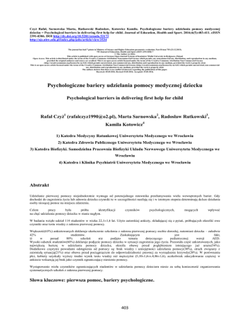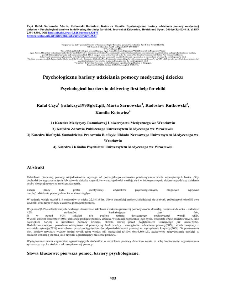 Czyż Rafał, Sarnowska Marta, Rutkowski Radosław, Kotowicz Kamila. Psychologiczne bariery udzielania pomocy medycznej dziecku = Psychological barriers in delivering first help for child. Journal of Education, Health and Sport. 2016;6(5):403-411. eISSN 2391-8306. DOI http://dx.doi.org/10.5281/zenodo.53173 http://ojs.ukw.edu.pl/index.php/johs/article/view/3534 The journal has had 7 points in Ministry of Science and Higher Education parametric evaluation. Part B item 755 (23.12.2015). 755 Journal of Education, Health and Sport eISSN 2391-8306 7 © The Author (s) 2016; This article is published with open access at Licensee Open Journal Systems of Kazimierz Wielki University in Bydgoszcz, Poland Open Access. This article is distributed under the terms of the Creative Commons Attribution Noncommercial License which permits any noncommercial use, distribution, and reproduction in any medium, provided the original author(s) and source are credited. This is an open access article licensed under the terms of the Creative Commons Attribution Non Commercial License (http://creativecommons.org/licenses/by-nc/4.0/) which permits unrestricted, non commercial use, distribution and reproduction in any medium, provided the work is properly cited. This is an open access article licensed under the terms of the Creative Commons Attribution Non Commercial License (http://creativecommons.org/licenses/by-nc/4.0/) which permits unrestricted, non commercial use, distribution and reproduction in any medium, provided the work is properly cited. The authors declare that there is no conflict of interests regarding the publication of this paper. Received: 05.05.2016. Revised 25.05.2016. Accepted: 25.05.2016. Psychologiczne bariery udzielania pomocy medycznej dziecku Psychological barriers in delivering first help for child Rafał Czyż1 ([email protected]), Marta Sarnowska2, Radosław Rutkowski3, Kamila Kotowicz4 1) Katedra Medycyny Ratunkowej Uniwersytetu Medycznego we Wrocławiu 2) Katedra Zdrowia Publicznego Uniwersytetu Medycznego we Wrocławiu 3) Katedra Biofizyki. Samodzielna Pracownia Biofizyki Układu Nerwowego Uniwersytetu Medycznego we Wrocławiu 4) Katedra i Klinika Psychiatrii Uniwersytetu Medycznego we Wrocławiu Abstrakt Udzielanie pierwszej pomocy niejednokrotnie wymaga od potencjalnego ratownika przełamywania wielu wewnętrznych barier. Gdy dochodzi do zagrożenia życia lub zdrowia dziecka czynniki te w szczególności nasilają się i w istotnym stopniu determinują dalsze działania osoby niosącej pomoc na miejscu zdarzenia. Celem pracy była próba identyfikacji na chęć udzielania pomocy dziecku w stanie nagłym. czynników psychologicznych, mogących wpływać W badaniu wzięło udział 114 studentów w wieku 22,1±1,6 lat. Użyto autorskiej ankiety, składającej się z pytań, próbujących określić owe czynniki oraz testu wiedzy z zakresu pierwszej pomocy. Większość(65%) ankietowanych deklaruje ukończenie szkolenia z zakresu pierwszej pomocy osobie dorosłej, natomiast dziecka – zaledwie 42% studentów. Zaskakującym jest fakt, iż w ponad 80% szkoleń nie podjęto tematu dotyczącego pediatrycznej wersji AED. Wysoki odsetek studentów(60%) deklaruje podjęcie pomocy dziecku w sytuacji zagrożenia jego życia. Pozostała część ankietowanych, jako największą barierę w udzielaniu pomocy dziecku, określa obawę przed pogłębieniem istniejącego już urazu(54%). Dodatkowo częstymi powodami odstąpienia od pomocy są: brak wiedzy i umiejętności udzielania pomocy(30%), strach związany z zaistniałą sytuacją(21%) oraz obawa przed pociągnięciem do odpowiedzialności prawnej za wyrządzenie krzywdy(20%). W porównaniu płci, kobiety uzyskały wyższy średni wynik testu wiedzy niż mężczyźni (5,10±1,6vs.4,86±1,6), aczkolwiek zdecydowanie częściej w ankiecie wskazują jej brak jako czynnik ograniczający niesienie pomocy. Występowanie wielu czynników ograniczających studentów w udzielaniu pomocy dzieciom niesie za sobą konieczność organizowania systematycznych szkoleń z zakresu pierwszej pomocy. Słowa kluczowe: pierwsza pomoc, bariery psychologiczne. 403 Psychological barriers in delivering first help for child Delivering first aid many times requires from potential rescuer breaking many inside barriers. When occurs emergency situation where the child’s health or life is endangered all of this factors intensify and in significant degree are determining further actions of the person delivering help on the spot. Aim of this study was an attempt of identification to influence on willingness to deliver medical help for child in emergency state. of psychological factors, being able In examination took part 114 students aged 22.1±1.6 years. Author’s questionnaire form was used. It consisted of questions which were trying to determine those psychological factors and first aid medical knowledge test. Majority (65%) of participants declare the fact of completion of adult first aid course, however of child first aid course – only 42% of students. Suprising is a fact, that in over 80% of trainings a subject of the paediatric AED version wasn't raised. High percentage of students (60%) declaring willingness of taking the help to the child in emergency state. The rest part of respondents, as the biggest barrier in help for child, is defining anxiety of deepening the already existing injury (54%). Additionally frequent reasons of giving up the help were: lack of knowledge and skills in delivering medical help (30%), fear associated with the existing situation (21%) and anxiety of drawing to the legal liability for harming (20%). In comparing the sex, women obtained higher average medical knowledge test results than men (5.10±1.6 vs 4.86±1.6), although definitely more often in questionnaire form show its lack as a limiting factor in delivering help. Occurrence of many factors which limiting students in delivering medical help for children bringing the need to organ
