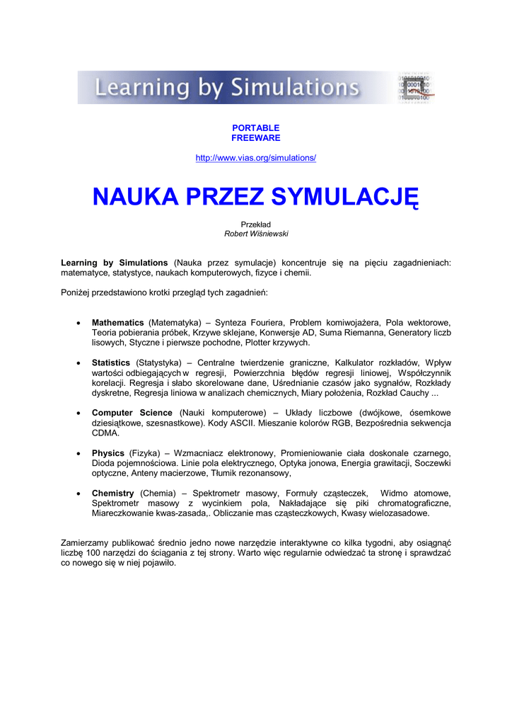 PORTABLE FREEWARE http://www.vias.org/simulations/ NAUKA PRZEZ SYMULACJĘ Przekład Robert Wiśniewski Learning by Simulations (Nauka przez symulacje) koncentruje się na pięciu zagadnieniach: matematyce, statystyce, naukach komputerowych, fizyce i chemii. Poniżej przedstawiono krotki przegląd tych zagadnień: Mathematics (Matematyka) – Synteza Fouriera, Problem komiwojażera, Pola wektorowe, Teoria pobierania próbek, Krzywe sklejane, Konwersje AD, Suma Riemanna, Generatory liczb lisowych, Styczne i pierwsze pochodne, Plotter krzywych. Statistics (Statystyka) – Centralne twierdzenie graniczne, Kalkulator rozkładów, Wpływ wartości odbiegających w regresji, Powierzchnia błędów regresji liniowej, Współczynnik korelacji. Regresja i słabo skorelowane dane, Uśrednianie czasów jako sygnałów, Rozkłady dyskretne, Regresja liniowa w analizach chemicznych, Miary położenia, Rozkład Cauchy ... Computer Science (Nauki komputerowe) – Układy liczbowe (dwójkowe, ósemkowe dziesiątkowe, szesnastkowe). Kody ASCII. Mieszanie kolorów RGB, Bezpośrednia sekwencja CDMA. Physics (Fizyka) – Wzmacniacz elektronowy, Promieniowanie ciała doskonale czarnego, Dioda pojemnościowa. Linie pola elektrycznego, Optyka jonowa, Energia grawitacji, Soczewki optyczne, Anteny macierzowe, Tłumik rezonansowy, Chemistry (Chemia) – Spektrometr masowy, Formuły cząsteczek, Widmo atomowe, Spektrometr masowy z wycinkiem pola, Nakładające się piki chromatograficzne, Miareczkowanie kwas-zasada,. Obliczanie mas cząsteczkowych, Kwasy wielozasadowe. Zamierzamy publikować średnio jedno nowe narzędzie interaktywne co kilka tygodni, aby osiągnąć liczbę 100 narzędzi do ściągania z tej strony. Warto więc regularnie odwiedzać ta stronę i sprawdzać co nowego się w niej pojawiło. Program Linki Krótki opis Źródła #1001 Fourier Synthesis Program ten wykonuje syntezę Fouriera korzystając z jego pierwszych siedmiu współczynników. Użytkownik może wybierać formy wstępnie zdefiniowanych sygnałów oraz eksperymentować przez zmianę współczynników szeregów Fouriera. Teach/Me Data Analysis #1002 Optimisation by a Kohonen Network Zagadnienie komiwojażera jest znanym problemem optymalizacji nieliniowej NP. Jednym ze sposobów prowadzących do przybliżonego rozwiązania jest skorzystanie z kołowej sieci Kohonena. Użytkownik może ustawiać główne parametry tej sieci oraz eksperymentować z różnymi liczbami miast. Teach/Me Data Analysis #1003 Vector Fields Program ten pozwala na eksperymentowanie z prostymi polami wektorowymi. Użytkownik może definiować proste różnice między równaniami i badać ich wpływy na wynikowe pola wektorowe. World of Infineon Discretes #1004 Sampling Theorem Symulacja ta pokazuje konsekwencje teorii próbkowania, którą zdefiniowali niezależnie Nykvist i Shannon. Można wybrać jeden z wielu wstępnie zdefiniowanych kształtów oraz próbkować je z różnymi częstościami. World of Infineon Discretes unpublished #1005 Splines Splajny są często stosowane do dopasowania krzywych. Taka symulacja pozwala eksperymentowanie z różnymi aspektami sześciennych krzywych sklejanych.. Można przełączać się zwykłymi splajnami sześciennymi, splajnami naturalnymi oraz splajnami wygładzanymi. Symulacja ta pokazuje wpływ zmian częstości próbkowania i/lub amplitudy rozdzielczości na konwersję A/D. World of Infineon Discretes Symulacja ta pokazuje zbieżność sumy Riemanna w kierunku definiowania całki funkcji. Elementary Calculus #1008 Random Generator Program ten pokazuje funkcję generatora liczb losowych (kongruentny generator liniowy), który jest stosowany w wielu programach. Można eksperymentować z różnymi parametrami, oglądać histogram wynikowego rozkładu, wykres jego korelacji oraz gęstości wygenerowanych liczb. Teach/Me Data Analysis #1009 Tangent and First Derivative Program ten pokazuje zależność między prędkością średnią, prędkością chwilową i pierwsza pochodną na diagramie typu czas-odległość. #1010 Function Plotter Program ten wyświetla wykresy funkcji matematycznych. Można specyfikować równania funkcji, ustawiać ich parametry oraz oglądac jak wykresy ulegają zmianie. #1006 AD Conversion #1007 Riemann Sum unpublished unpublished Program Linki Krótki opis Źródła #2001 Central Limit Theorem Program CenLimit pokazuje wpływy centralnego twierdzenia granicznego. Można wybierać różne rozkłady oraz wykreślać różne liczby próbek do obliczania średnich i wykreślania rozkładów. #2002 Distribution Calculator Lines Program DistCalc oblicza prawdopodobieństwa i wartości krytyczne większości ważnych rozkładów. Celem tego programu jest pokazanie koncepcji wartości krytycznych oraz zastąpienie drukowanych tabel rozkładów. Teach/Me Data Analysis #2003 Leverage Effect in Regression Program ten wizualizuje wpływ wartości odbiegających na linię regresji. Użytkownik może wskazać punkt myszką i przesuwać go po wykresie. Wynikowa linia regresji będzie automatycznie dopasowywana po każdym przesunięciu . Teach/Me Data Analysis #2004 Error Surface of Linear Regression Regresję liniową można pokazać jako problem optymalizacji wyszukiwania najniższego punktu powierzchni odpowiedzi. Program ten pozwala na zabawę z powierzchnią odpowiedzi linii regresji i szukanie optimum w sposób intuicyjny. Teach/Me Data Analysis #2005 Distribution of Correlation Coefficient Współczynnik korelacji jest jedną z powszechnie stosowanych miar statystycznych. Mimo częstego stosowania, przy zbyt małej liczbie obserwacji pokazuje rozkład graniczny, o czym rzadko widomo. Teach/Me Data Analysis #2006 Regression o Data Weakly Correlated Istnieje powszechna, mylna ocena oceny regresji liniowej x-y gdy ma miejsce mała korelacja między danymi. Symulacja ta próbuje rzucić nieco światła na ten aspekt regresji liniowej. Fundamentals of Statistics #2007 Time Average of Signals Sygnały poni