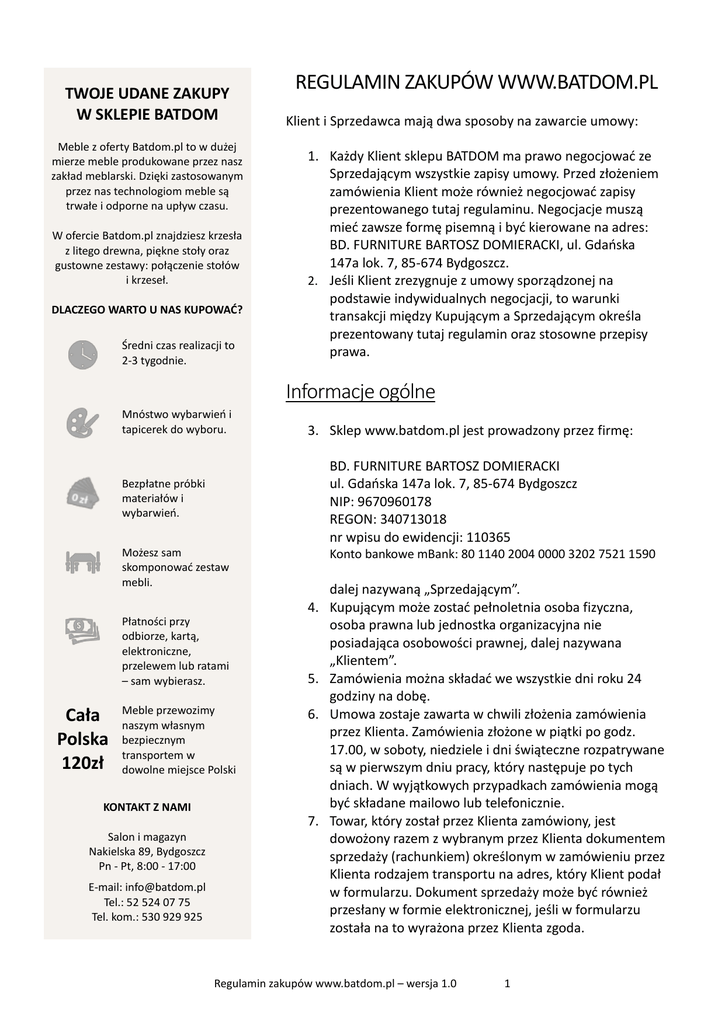 TWOJE UDANE ZAKUPY W SKLEPIE BATDOM Meble z oferty Batdom.pl to w dużej mierze meble produkowane przez nasz zakład meblarski. Dzięki zastosowanym przez nas technologiom meble są trwałe i odporne na upływ czasu. W ofercie Batdom.pl znajdziesz krzesła z litego drewna, piękne stoły oraz gustowne zestawy: połączenie stołów i krzeseł. DLACZEGO WARTO U NAS KUPOWAĆ? Średni czas realizacji to 2-3 tygodnie. REGULAMIN ZAKUPÓW WWW.BATDOM.PL Klient i Sprzedawca mają dwa sposoby na zawarcie umowy: 1. Każdy Klient sklepu BATDOM ma prawo negocjować ze Sprzedającym wszystkie zapisy umowy. Przed złożeniem zamówienia Klient może również negocjować zapisy prezentowanego tutaj regulaminu. Negocjacje muszą mieć zawsze formę pisemną i być kierowane na adres: BD. FURNITURE BARTOSZ DOMIERACKI, ul. Gdańska 147a lok. 7, 85-674 Bydgoszcz. 2. Jeśli Klient zrezygnuje z umowy sporządzonej na podstawie indywidualnych negocjacji, to warunki transakcji między Kupującym a Sprzedającym określa prezentowany tutaj regulamin oraz stosowne przepisy prawa. Informacje ogólne Mnóstwo wybarwień i tapicerek do wyboru. BD. FURNITURE BARTOSZ DOMIERACKI ul. Gdańska 147a lok. 7, 85-674 Bydgoszcz NIP: 9670960178 REGON: 340713018 nr wpisu do ewidencji: 110365 Bezpłatne próbki materiałów i wybarwień. Możesz sam skomponować zestaw mebli. Płatności przy odbiorze, kartą, elektroniczne, przelewem lub ratami – sam wybierasz. Cała Polska 120zł Meble przewozimy naszym własnym bezpiecznym transportem w dowolne miejsce Polski KONTAKT Z NAMI Salon i magazyn Nakielska 89, Bydgoszcz Pn - Pt, 8:00 - 17:00 E-mail: [email protected] Tel.: 52 524 07 75 Tel. kom.: 530 929 925 3. Sklep www.batdom.pl jest prowadzony przez firmę: Konto bankowe mBank: 80 1140 2004 0000 3202 7521 1590 dalej nazywaną „Sprzedającym”. 4. Kupującym może zostać pełnoletnia osoba fizyczna, osoba prawna lub jednostka organizacyjna nie posiadająca osobowości prawnej, dalej nazywana „Klientem”. 5. Zamówienia można składać we wszystkie dni roku 24 godziny na dobę. 6. Umowa zostaje zawarta w chwili złożenia zamówienia przez Klienta. Zamówienia złożone w piątki po godz. 17.00, w soboty, niedziele i dni świąteczne rozpatrywane są w pierwszym dniu pracy, który następuje po tych dniach. W wyjątkowych przypadkach zamówienia mogą być składane mailowo lub telefonicznie. 7. Towar, który został przez Klienta zamówiony, jest dowożony razem z wybranym przez Klienta dokumentem sprzedaży (rachunkiem) określonym w zamówieniu przez Klienta rodzajem transportu na adres, który Klient podał w formularzu. Dokument sprzedaży może być również przesłany w formie elektronicznej, jeśli w formularzu została na to wyrażona przez Klienta zgoda. Regulamin zakupów www.batdom.pl – wersja 1.0 1 TWOJE UDANE ZAKUPY W SKLEPIE BATDOM Meble z oferty Batdom.pl to w dużej mierze meble produkowane przez nasz zakład meblarski. Dzięki zastosowanym przez nas technologiom meble są trwałe i odporne na upływ czasu. W ofercie Batdom.pl znajdziesz krzesła z litego drewna, piękne stoły oraz gustowne zestawy: połączenie stołów i krzeseł. DLACZEGO WARTO U NAS KUPOWAĆ? Średni czas realizacji to 2-3 tygodnie. Mnóstwo wybarwień i tapicerek do wyboru. Bezpłatne próbki materiałów i wybarwień. Możesz sam skomponować zestaw mebli. Płatności przy odbiorze, kartą, elektroniczne, przelewem lub ratami – sam wybierasz. Cała Polska 120zł Meble przewozimy naszym własnym bezpiecznym transportem w dowolne miejsce Polski KONTAKT Z NAMI Salon i magazyn Nakielska 89, Bydgoszcz Pn - Pt, 8:00 - 17:00 E-mail: [email protected] Tel.: 52 524 07 75 Tel. kom.: 530 929 925 8. W przypadku niezgodności towaru z umową Sprzedający ponosi odpowiedzialność przez dwa lata od daty zakupu, zgodnie z art. 10 Ustawy o szczególnych warunkach sprzedaży konsumenckiej z 27 lipca 2002 roku i pozostałymi stosownymi przepisami prawa. 9. Jeśli Klient stwierdzi niezgodność towaru z umową, zobowiązany jest przesłać pismo określające stwierdzoną niezgodność oraz oczekiwania dotyczące sposobu realizacji zobowiązania na adres Głównego Magazynu Sprzedającego: BD. FURNITURE BARTOSZ DOMIERACKI, Nakielska 89, 85-347 Bydgoszcz. 10. Ceny towarów, które podane są przez Sprzedającego są za każdym razem cenami brutto (w ich skład wliczony jest podatek VAT), podanymi w polskiej walucie i nie zawierającymi kosztu dostawy. Koszt dostawy wykazany jest w cenniku dostaw. 11. Sprzedający zobowiązuje się chronić dane osobowe każdego Klienta zgodnie z Ustawą o ochronie danych osobowych z 29.08.1997 r (Dz. U. Nr 133, poz. 883) oraz Ustawą o świadczeniu usług drogą elektroniczną (Dz. U. Nr 144, poz. 1204). Klient podaje swoje dane osobowe Sprzedającemu w momencie składania zamówienia. Tym samym wyraża zgodę na ich przetwarzanie przez Sprzedającego w celu realizacji złożonego zamówienia. Klient w każdej chwili ma możliwość wglądu, aktualizacji, poprawienia oraz usunięcia swoich danych osobowych. 12. Żadne z postanowień niniejszego regulaminu nie ma na celu naruszenia praw Klienta i nie może być w ten sposób interpretowane. W przypadku niezgodności którejkolwiek części regulaminu Sprzedający deklaruje bezwzględne podporządkowanie się prawu Klienta i jego stosowanie w miejsce zakwestionowanego przepisu regulaminu. 13. Sprzedający o zmianach regulaminu informuje Klientów wyświetlając odpowiedni komunikat w górnej części strony internetowej. Komunikat zostanie wyświetlony wszystkim użytkownikom strony, a jego ukrycie będzie wymagało świadomej decyzji każdego użytkownika. Pojawiające się zmiany będą wprowadzane, jeśli będzie konieczność dostosowania regulaminu do zmieniających się, obowiązujących przepisów prawa. 14. Obowiązująca wersja regulaminu dostępna jest w zakładce regulamin, która znajduje się pod adresem: http://www.batdom.pl/regulamin.ehtml. W trakc