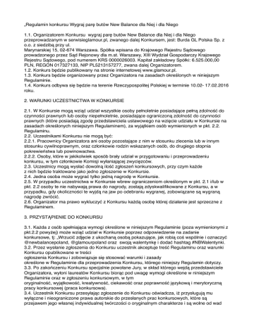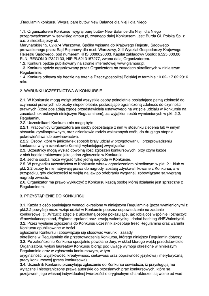 „Regulamin konkursu Wygraj parę butów New Balance dla Niej i dla Niego 1.1. Organizatorem Konkursu wygraj parę butów New Balance dla Niej i dla Niego przeprowadzanym w serwisieglamour.pl, zwanego dalej Konkursem, jest: Burda GL Polska Sp. z o.o. z siedzibą przy ul. Marynarskiej 15, 02-674 Warszawa. Spółka wpisana do Krajowego Rejestru Sądowego prowadzonego przez Sąd Rejonowy dla m.st. Warszawy, XIII Wydział Gospodarczy Krajowego Rejestru Sądowego, pod numerem KRS 0000026003. Kapitał zakładowy Spółki: 6.525.000,00 PLN, REGON 017327133, NIP PL5213157277, zwana dalej Organizatorem. 1.2. Konkurs będzie publikowany na stronie internetowej www.glamour.pl. 1.3. Konkurs będzie organizowany przez Organizatora na zasadach określonych w niniejszym Regulaminie. 1.4. Konkurs odbywa się będzie na terenie Rzeczypospolitej Polskiej w terminie 10.02- 17.02.2016 roku. 2. WARUNKI UCZESTNICTWA W KONKURSIE 2.1. W Konkursie mogą wziąć udział wszystkie osoby pełnoletnie posiadające pełną zdolność do czynności prawnych lub osoby niepełnoletnie, posiadające ograniczoną zdolność do czynności prawnych (które posiadają zgodę przedstawiciela ustawowego na wzięcie udziału w Konkursie na zasadach określonych niniejszym Regulaminem), za wyjątkiem osób wymienionych w pkt. 2.2. Regulaminu. 2.2. Uczestnikami Konkursu nie mogą być: 2.2.1. Pracownicy Organizatora ani osoby pozostające z nim w stosunku zlecenia lub w innym stosunku cywilnoprawnym, oraz członkowie rodzin wskazanych osób, do drugiego stopnia pokrewieństwa lub powinowactwa. 2.2.2. Osoby, które w jakikolwiek sposób brały udział w przygotowaniu i przeprowadzeniu konkursu, w tym członkowie Komisji wyłaniającej zwycięzców. 2.3. Uczestnicy mogą wysłać dowolną ilość zgłoszeń konkursowych, przy czym każde z nich będzie traktowane jako jedno zgłoszenie w Konkursie. 2.4. Jedna osoba może wygrać tylko jedną nagrodę w Konkursie. 2.5. W przypadku uczestnictwa w Konkursie wbrew ograniczeniom określonym w pkt. 2.1 i/lub w pkt. 2.2 osoby te nie nabywają prawa do nagrody, zostają zdyskwalifikowane z Konkursu, a w przypadku, gdy okoliczności te wyjdą na jaw po odebraniu wygranej, zobowiązane są wygraną nagrodę zwrócić. 2.6. Organizator ma prawo wykluczyć z Konkursu każdą osobę której działanie jest sprzeczne z Regulaminem. 3. PRZYSTĄPIENIE DO KONKURSU 3.1. Każda z osób spełniająca wymogi określone w niniejszym Regulaminie (poza wymienionymi z pkt.2.2 powyżej) może wziąć udział w Konkursie poprzez odpowiedzenie na zadanie konkursowe, tj: „Wrzucić zdjęcie z ukochaną osobą pokazujące, jak robią coś wspólnie i oznaczyć @newbalancepoland, @glamourpoland oraz swoją walentynkę i dodać hashtag #NBWalentynki. 3.2. Przez wysłanie zgłoszenia do Konkursu uczestnik akceptuje treść Regulaminu oraz warunki Konkursu opublikowane w treści ogłoszenia Konkursu i zobowiązuje się stosować warunki i zasady określone w Regulaminie dla przeprowadzenia Konkursu, którego niniejszy Regulamin dotyczy. 3.3. Po zakończeniu Konkursu specjalnie powołane Jury, w skład którego wejdą przedstawiciele Organizatora, wyłoni laureatów Konkursu biorąc pod uwagę wymogi określone w niniejszym Regulaminie oraz w zgłoszeniu konkursowym, w tym oryginalność, wyjątkowość, kreatywność, ciekawość oraz poprawność językową i merytoryczną pracy konkursowej (praca konkursowa). 3.4. Uczestnik Konkursu przesyłając zgłoszenie do Konkursu oświadcza, iż przysługują mu wyłączne i nieograniczone prawa autorskie do przesłanych prac konkursowych, które są przejawem jego własnej indywidualnej twórczości o oryginalnym charakterze i są wolne od wad fizycznych i prawnych oraz roszczeń podmiotów trzecich oraz oświadcza, że uzyskał wszelkie zezwolenia lub zgody prawem wymagane na korzystanie z przesłanych prac (w tym prawa na pozowanie osób i rozpowszechnianie wizerunku), o ile są one konieczne lub potrzebne dla ich wykorzystywania przez Organizatora. W przypadku, gdyby oświadczenia, o których mowa powyżej okazały się niezgodne ze stanem faktycznym i/lub prawnym osoba, która nadesłała zgłoszenie, w przypadku ewentualnych roszczeń osób trzecich, ponosi wyłączną i całkowitą odpowiedzialność oraz oświadcza, że ureguluje wszystkie związane z tym faktem poniesione przez Organizatora szkody. Ponadto, w sytuacji o której mowa powyżej, osoba ta podlega dyskwalifikacji z Konkursu i zobowiązana jest do niezwłocznego zwrotu przyznanej przez Organizatora nagrody. 3.5. Uczestnik oświadcza, że wyraża zgodę na wielokrotne (nieograniczone ilościowo, czasowo i terytorialnie) oraz nieodpłatne korzystanie w całości jak i w dowolnie wybranych fragmentach z jego pracy konkursowej (odpowiedź konkursowa ) przez Organizatora oraz firmy powiązane z Organizatorem kapitałowo lub osobowo w sposób pośredni lub bezpośredni jak również przez podmioty wskazane przez Organizatora na wszystkich znanych polach eksploatacji, a w szczególności: a. Utrwalanie i zwielokrotnianie drukiem lub podobną techniką, w tym fotokopiowanie i mikrokopiowanie; b. Wydawanie (publikowanie) i rozpowszechnianie we wszystkich wydaniach, niezależnie od formy, standardu, systemu lub formatu, bez ograniczenia liczby nakładów, wydań oraz egzemplarzy; obejmuje to także prawo do częściowego lub całkowitego przedruku (przed i po produkcji), w tym na fotokopiach, mikrokopiach i mikroreprodukcjach, a także do powielania w inny sposób; c. Wprowadzanie do pamięci komputera i sporządzanie kopii takich zapisów dla potrzeb eksploatacji oraz trwała lub czasowe zwielokrotnianie komputerowego zapisu w całości lub w części dowolnymi środkami i w dowolnej formie; d. Wykorzystywanie do celów marketingowych, w tym reklamy, promocji, oznaczenia lub identyfikacji Organizatora; obejmuje to również utrwalanie i zwielokrotnianie poligraficzne oraz wykorzystanie tych utrwaleń; utrwalan