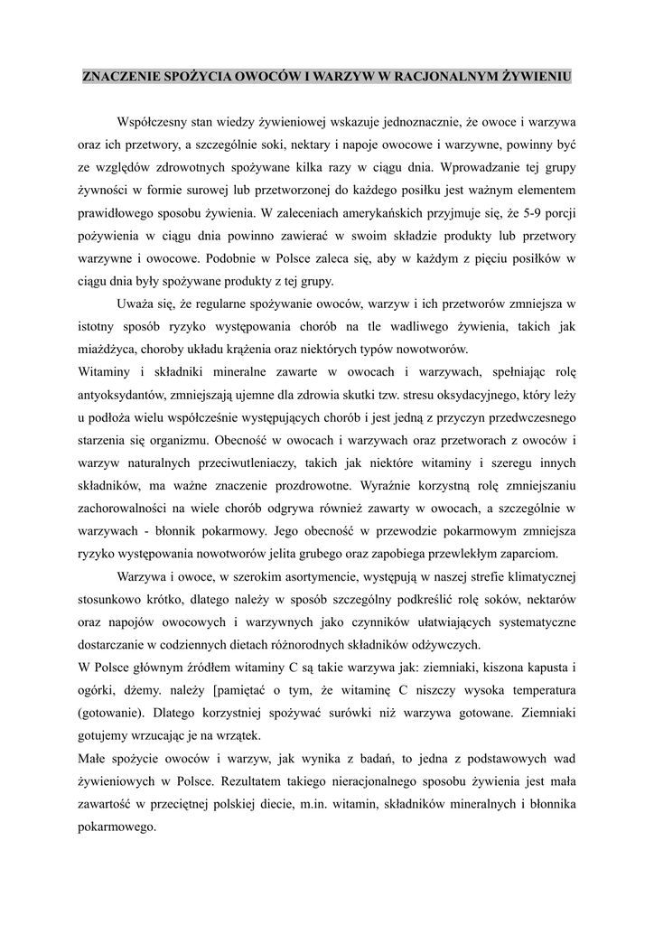ZNACZENIE SPOŻYCIA OWOCÓW I WARZYW W RACJONALNYM ŻYWIENIU Współczesny stan wiedzy żywieniowej wskazuje jednoznacznie, że owoce i warzywa oraz ich przetwory, a szczególnie soki, nektary i napoje owocowe i warzywne, powinny być ze względów zdrowotnych spożywane kilka razy w ciągu dnia. Wprowadzanie tej grupy żywności w formie surowej lub przetworzonej do każdego posiłku jest ważnym elementem prawidłowego sposobu żywienia. W zaleceniach amerykańskich przyjmuje się, że 5-9 porcji pożywienia w ciągu dnia powinno zawierać w swoim składzie produkty lub przetwory warzywne i owocowe. Podobnie w Polsce zaleca się, aby w każdym z pięciu posiłków w ciągu dnia były spożywane produkty z tej grupy. Uważa się, że regularne spożywanie owoców, warzyw i ich przetworów zmniejsza w istotny sposób ryzyko występowania chorób na tle wadliwego żywienia, takich jak miażdżyca, choroby układu krążenia oraz niektórych typów nowotworów. Witaminy i składniki mineralne zawarte w owocach i warzywach, spełniając rolę antyoksydantów, zmniejszają ujemne dla zdrowia skutki tzw. stresu oksydacyjnego, który leży u podłoża wielu współcześnie występujących chorób i jest jedną z przyczyn przedwczesnego starzenia się organizmu. Obecność w owocach i warzywach oraz przetworach z owoców i warzyw naturalnych przeciwutleniaczy, takich jak niektóre witaminy i szeregu innych składników, ma ważne znaczenie prozdrowotne. Wyraźnie korzystną rolę zmniejszaniu zachorowalności na wiele chorób odgrywa również zawarty w owocach, a szczególnie w warzywach - błonnik pokarmowy. Jego obecność w przewodzie pokarmowym zmniejsza ryzyko występowania nowotworów jelita grubego oraz zapobiega przewlekłym zaparciom. Warzywa i owoce, w szerokim asortymencie, występują w naszej strefie klimatycznej stosunkowo krótko, dlatego należy w sposób szczególny podkreślić rolę soków, nektarów oraz napojów owocowych i warzywnych jako czynników ułatwiających systematyczne dostarczanie w codziennych dietach różnorodnych składników odżywczych. W Polsce głównym źródłem witaminy C są takie warzywa jak: ziemniaki, kiszona kapusta i ogórki, dżemy. należy [pamiętać o tym, że witaminę C niszczy wysoka temperatura (gotowanie). Dlatego korzystniej spożywać surówki niż warzywa gotowane. Ziemniaki gotujemy wrzucając je na wrzątek. Małe spożycie owoców i warzyw, jak wynika z badań, to jedna z podstawowych wad żywieniowych w Polsce. Rezultatem takiego nieracjonalnego sposobu żywienia jest mała zawartość w przeciętnej polskiej diecie, m.in. witamin, składników mineralnych i błonnika pokarmowego.