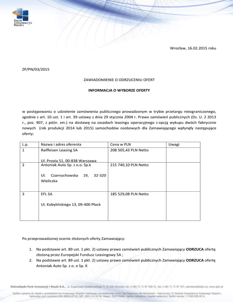 Wrocław, 16.02.2015 roku ZP/PN/03/2015 ZAWIADOMIENIE O ODRZUCENIU OFERT INFORMACJA O WYBORZE OFERTY w postępowaniu o udzielenie zamówienia publicznego prowadzonym w trybie przetargu nieograniczonego, zgodnie z art. 10 ust. 1 i art. 39 ustawy z dnia 29 stycznia 2004 r. Prawo zamówień publicznych (Dz. U. 2 2013 r., poz. 907, z późn. zm.) na dostawę na zasadach leasingu operacyjnego z opcją wykupu dwóch fabrycznie nowych (rok produkcji 2014 lub 2015) samochodów osobowych dla Zamawiającego wpłynęły następujące oferty: L.p. 1 Nazwa i adres oferenta Raiffeisen Leasing SA Cena w PLN 208 505,43 PLN Netto 2 Ul. Prosta 51, 00-838 Warszawa Antoniak Auto Sp. z o.o. Sp.k 215 740,10 PLN Netto Ul. Czarnochowska Wieliczka 3 19, Uwagi 32-320 EFL SA 185 529,08 PLN Netto Ul. Kobylińskiego 13, 09-400 Płock Po przeprowadzonej ocenie złożonych oferty Zamawiający: 1. Na podstawie art. 89 ust. 1 pkt. 2) ustawy prawo zamówień publicznych Zamawiający ODRZUCA ofertę złożoną przez Europejski Fundusz Leasingowy SA ; 2. Na podstawie art. 89 ust. 1 pkt. 2) ustawy prawo zamówień publicznych Zamawiający ODRZUCA ofertę Antoniak Auto Sp. z o. o Sp. K 3. Na podstawie art. 91 ust. 1 ustawy prawo zamówień publicznych Zamawiający dokonał wyboru oferty złożonej przez: Raiffeisen Leasing Polska SA. ul. Prosta 51, 00-838 Warszawa Oferta Raiffeisen Leasing Polska SA. ul. Prosta 51, 00-838 Warszawa otrzymała łącznie 95 punktów (75 punków za cenę, 20 punktów za poziom bezpieczeństwa samochodów). Uzasadnienie W przedmiotowym postępowaniu wpłynęły 3 oferty. Spośród złożonych ofert tylko oferta złożona przez Raiffeisen Leasing Polska SA nie podlegała odrzuceniu. UZASADNIENIE ODRZUCENIA OFERTY złożonej przez Europejski Fundusz Leasingowy SA we Wrocławiu Oddział w Płocku Wykonawca ten w ofercie na stronie 4 oferty dołączył pismo nazwane przez Wykonawcę „Dodatkowa informacja”. Pismo to nie było przewidziane w SIWZ a w swej treści zawiera element wpływający na cenę ofertową. Zamawiający żądał w SIWZ podania ceny rozumianej jako łączna wysokość wynagrodzenia Wykonawcy z tytułu wszystkich opłat leasingowych, jakie Zamawiający zapłaci Wykonawcy z tytułu leasingu operacyjnego 2 (słownie: dwóch) samochodów (wraz z kwotą wpłaty początkowej, ewentualnych opłat administracyjnych itp. oraz wartością wykupu przedmiotu leasingu po zakończeniu trwania umowy). Oznacza to, że Zamawiający nie dopuszczał występowania innych niż wskazana w ofercie cena opłat, do poniesienia których Zamawiający miałby być zobowiązany. Tymczasem w INFORMACJI DODATKOWEJ (str. 4 oferty) Wykonawca wskazał, że oferta nie zawiera kosztów rejestracji Pojazdów i koszt ten dla jednego pojazdu wynosi 317, 50 zł netto. Wezwany do złożenia wyjaśnień Europejski Fundusz Leasingowy SA we Wrocławiu Oddział w Płocku w dniu 13.02.2015 roku udzielił odpowiedzi, w której „odstąpił od opłaty za czynności rejestracyjne pojazdów”. Poprosił ponadto o przedłużenie terminu dostawy o 14 dni tj. do 14.04.2015 roku. W ocenie Zamawiającego stanowi to niedopuszczalną modyfikację złożonej oferty po terminie składania ofert a treść złożonej oferty nie odpowiada treści specyfikacji istotnych warunków zamówienia co do ceny oferty. Ponadto skoro Wykonawca nie jest w stanie wykonać zamówienia w terminie wskazanym w SIWZ a wiec w terminie do 30.03.2015 roku także w tym zakresie treść oferty nie odpowiada treści specyfikacji istotnych warunków zamówienia i oferta tego Wykonawcy podlega odrzuceniu na podstawie art. 89 ust. 1 pkt. 2) ustawy prawo zamówień publicznych UZASDANIENIE ODRZUCENIA OFERTY Antoniak Auto Sp. z o.o. w Wieliczce Oferowane przez Wykonawcę samochody nie spełniają wymagań stawianych przez Zamawiającego w SIWZ. Zamawiający wymagał m.in. żeby głębokość foteli przedniej i tylnej kanapy samochodów wynosiła nie mniej niż 450 mm. Załączony do treści oferty opis techniczny samochodu Peugeot 508 na stronie 19 oferty wskazuje, że głębokość tylnej kanapy wynosi 432 mm a więc jest mniejsza niż wymagana przez Zamawiającego w SIWZ. Ponadto Wykonawca ten wskazał, że nie będzie przy wykonywaniu zamówienia korzystał z podwykonawców (str. 3 oferty) załączając jednak do treści oferty propozycje warunków finansowych Santander Consumer Multirent Sp. z o.o we Wrocławiu co wskazuje, że ten podmiot będzie podwykonawcą w zakresie leasingu. Oferta tego wykonawcy Antoniak Auto Sp. z o.o. jako nie spełniająca wymagań SIWZ podlegała odrzuceniu na podstawie art. 89 ust. 1 pkt. 2) ustawy prawo zamówień publicznych UZASADNIENEI WYBORU OFERTY Raiffeisen Leasing SA Raiffeisen Leasing SA złożył ofertę spełniającą wymagania SIWZ i nie podlegającą odrzuceniu. Po dokonaniu oceny tej oferty przez Zamawiającego oferta uzyskała łącznie 95 punktów (75 punków za cenę, 20 punktów za poziom bezpieczeństwa samochodów). Ponieważ spośród złożonych ofert oferta Raiffeisen Leasing SA jako najkorzystniejsza została wybrana przez zmawiającego (na podstawie art. 91 ust. 1 ustawy prawo zamówień publicznych) Zgodnie z art. 94 ust. 1 pkt 2. ustawy PZP Zamawiający jest uprawniony do zawarcia umowy z wyłonionym Wykonawcą w terminie nie krótszym niż 5 dni od przeslania zawiadomienia o wyborze najkorzystniejszej oferty, tj. od 22.02.2015 roku.