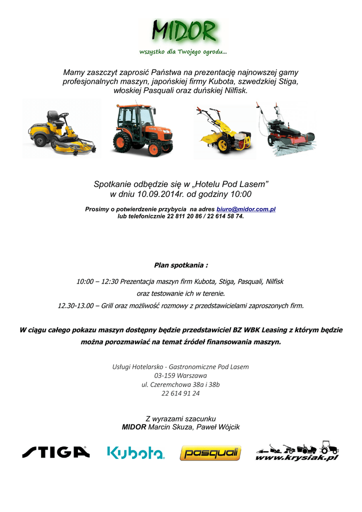 Mamy zaszczyt zaprosić Państwa na prezentację najnowszej gamy profesjonalnych maszyn, japońskiej firmy Kubota, szwedzkiej Stiga, włoskiej Pasquali oraz duńskiej Nilfisk. Spotkanie odbędzie się w „Hotelu Pod Lasem” w dniu 10.09.2014r. od godziny 10:00 Prosimy o potwierdzenie przybycia na adres [email protected] lub telefonicznie 22 811 20 86 / 22 614 58 74. Plan spotkania : 10:00 – 12:30 Prezentacja maszyn firm Kubota, Stiga, Pasquali, Nilfisk oraz testowanie ich w terenie. 12.30-13.00 – Grill oraz możliwość rozmowy z przedstawicielami zaproszonych firm. W ciągu całego pokazu maszyn dostępny będzie przedstawiciel BZ WBK Leasing z którym będzie można porozmawiać na temat źródeł finansowania maszyn. Usługi Hotelarsko - Gastronomiczne Pod Lasem 03-159 Warszawa ul. Czeremchowa 38a i 38b 22 614 91 24 Z wyrazami szacunku MIDOR Marcin Skuza, Paweł Wójcik