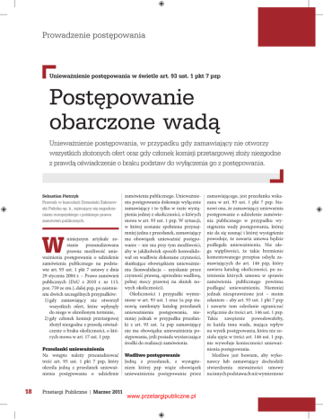 Prowadzenie postępowania Unieważnienie postępowania w świetle art. 93 ust. 1 pkt 7 pzp Postępowanie obarczone wadą Unieważnienie postępowania, w przypadku gdy zamawiający nie otworzy wszystkich złożonych ofert oraz gdy członek komisji przetargowej złoży niezgodne z prawdą oświadczenie o braku podstaw do wyłączenia go z postępowania. Sebastian Pietrzyk Prawnik w kancelarii Domański Zakrzewski Palinka sp. k., zajmujący się zagadnieniami europejskiego i polskiego prawa zamówień publicznych. W niniejszym artykule zostanie przeanalizowana prawna możliwość unieważnienia postępowania o udzielenie zamówienia publicznego na podstawie art. 93 ust. 1 pkt 7 ustawy z dnia 29 stycznia 2004 r. – Prawo zamówień publicznych (DzU z 2010 r. nr 113, poz. 759 ze zm.), dalej pzp, po zaistnieniu dwóch szczególnych przypadków: 1) gdy zamawiający nie otworzył wszystkich ofert, które wpłynęły do niego w określonym terminie, 2) gdy członek komisji przetargowej złożył niezgodne z prawdą oświadczenie o braku okoliczności, o których mowa w art. 17 ust. 1 pzp. Przesłanki unieważnienia Na wstępie należy przeanalizować treść art. 93 ust. 1 pkt 7 pzp, który określa jedną z przesłanek unieważnienia postępowania o udzielenie 18 Przetargi Publiczne | Marzec 2011 zamówienia publicznego. Unieważnienia postępowania dokonuje wyłącznie zamawiający i to tylko w razie wystąpienia jednej z okoliczności, o których mowa w art. 93 ust. 1 pzp. W sytuacji, w której zostanie spełniona przynajmniej jedna z przesłanek, zamawiający ma obowiązek unieważnić postępowanie – nie ma przy tym możliwości, aby w jakikolwiek sposób konwalidował on wadliwie dokonane czynności, skutkujące obowiązkiem unieważnienia (konwalidacja – uzyskanie przez czynność prawną, uprzednio wadliwą, pełnej mocy prawnej na skutek nowych okoliczności). Okoliczności i przypadki wymienione w art. 93 ust. 1 oraz 1a pzp stanowią zamknięty katalog przesłanek unieważnienia postępowania, niemniej jednak w przypadku przesłanki z art. 93 ust. 1a pzp zamawiający nie ma obowiązku unieważnienia postępowania, jeśli posiada wystarczające środki do realizacji zamówienia. Wadliwe postępowanie Jedną z przesłanek, z wystąpieniem której pzp wiąże obowiązek unieważnienia postępowania przez www.przetargipubliczne.pl zamawiającego, jest przesłanka wskazana w art. 93 ust. 1 pkt 7 pzp. Stanowi ona, że zamawiający unieważnia postępowanie o udzielenie zamówienia publicznego w przypadku wystąpienia wady postępowania, której nie da się usunąć i której wystąpienie powoduje, że zawarta umowa będzie podlegała unieważnieniu. Nie ulega wątpliwości, że takie brzmienie komentowanego przepisu odsyła zamawiających do art. 146 pzp, który zawiera katalog okoliczności, po zaistnieniu których umowa w sprawie zamówienia publicznego powinna podlegać unieważnieniu. Niemniej jednak nieuprawnione jest – moim zdaniem – aby art. 93 ust. 1 pkt 7 pzp i zawarte tam odesłanie ograniczać wyłącznie do treści art. 146 ust. 1 pzp. Takie zawężenie powodowałoby, że każda inna wada, mająca wpływ na wynik postępowania, która nie została ujęta w treści art. 146 ust. 1 pzp, nie wywołuje konieczności unieważnienia postępowania. Możliwe jest bowiem, aby wykonawcy lub zamawiający dochodzili stwierdzenia nieważności umowy na innych podstawach niż wymienione Prowadzenie postępowania Art. 705 kc § 1. Organizator oraz uczestnik aukcji albo przetargu może żądać unieważnienia zawartej umowy, jeżeli strona tej umowy, inny uczestnik lub osoba działająca w porozumieniu z nimi wpłynęła na wynik aukcji albo przetargu w sposób sprzeczny z prawem lub dobrymi obyczajami. Jeżeli umowa została zawarta na cudzy rachunek, jej unieważnienia może żądać także ten, na czyj rachunek umowa została zawarta, lub dający zlecenie. § 2. Uprawnienie powyższe wygasa z upływem miesiąca od dnia, w którym uprawniony dowiedział się o istnieniu przyczyny unieważnienia, nie później jednak niż z upływem roku od dnia zawarcia umowy. Art. 189 kpc Powód może żądać ustalenia przez sąd istnienia lub nieistnienia stosunku prawnego lub prawa, gdy ma w tym interes prawny. w art. 146 ust. 1 pzp. Taką podstawę może stanowić chociażby art. 705 ustawy z dnia 23 kwietnia 1964 r. – Kodeks cywilny (DzU nr 16, poz. 93 ze zm.), dalej: kc, lub art. 189 ustawy z dnia 17 listopada 1964 r. – Kodeks postępowania cywilnego (DzU nr 43, poz. 296 ze zm.), dalej: kpc. Wskazane podstawy żądania unieważnienia zawartej umowy zostaną omówione w dalszej części artykułu. Wydaje się zatem, że wszystkie przypadki, w których w danym postępowaniu wystąpi wada, która ma lub może mieć wpływ na wynik postępowania, o ile nie da się jej usunąć, będzie podstawą unieważnienia postępowania przez zamawiającego. Wyrok KIO z dnia 19 kwietnia 2010 r. (KIO/UZP 386/10) „Wadą w rozumieniu przepisu art. 93 ust. 1 pkt 7 pzp jest nieusuwalna wada samego postępowania o udzielenie zamówienia, która wywiera tak istotny wpływ na umowę w sprawie zamówienia publicznego, powodując jej bezwzględną nieważność ab initio, a tym samym prawną bezskuteczność. Wady takie wymienia przykładowo przepis art. 146 ust. 1 pzp”. Powyższe orzeczenie ma o tyle istotne znaczenie, że wskazuje na relację między treścią art. 93 ust. 1 pkt 7 pzp w zakresie wad postępowania a katalogiem przesłanek unieważnienia umowy. Można z tego wywodzić, że o ile katalog przesłanek unieważnienia umowy na podstawie przepisu art. 146 ust. 1 pzp jest wyczerpujący, o tyle – w ocenie Izby – posiłkowo wskazuje on jedynie przykładowe wady, jakie w danym postępowaniu o udzielenie zamówienia publicznego mogą wystąpić. Taka linia orzecznicza i wykładania komentowanych przepisów wydaje się prawidłowa, albowiem pozwala każdorazowo, w konkretnych przypadkach, na zindywidualiz