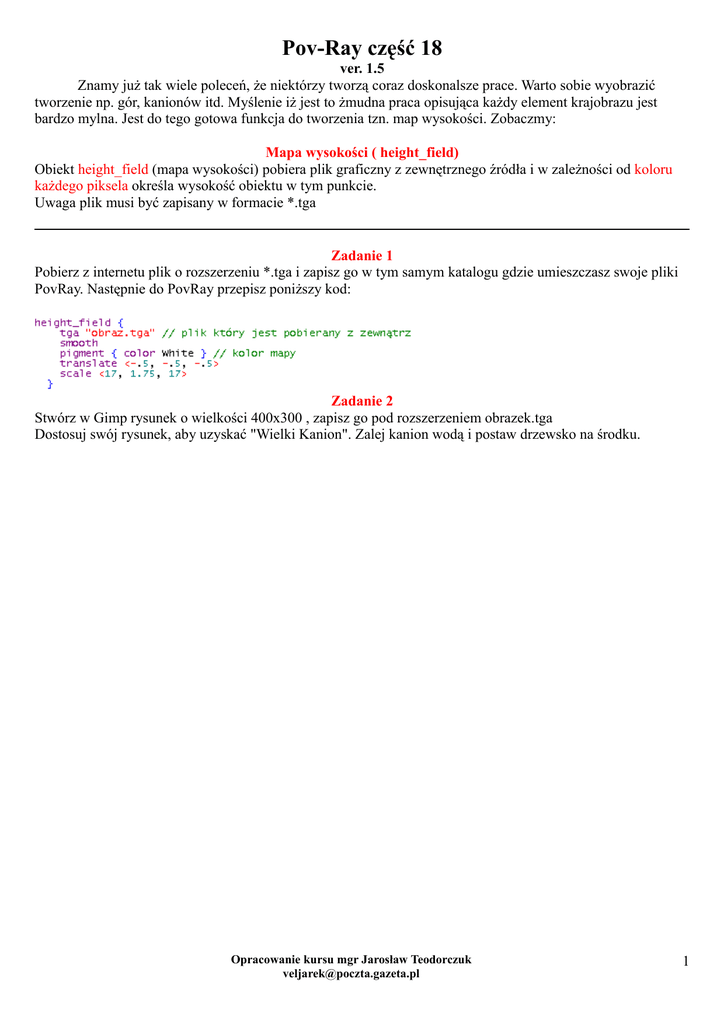 Pov-Ray część 18 ver. 1.5 Znamy już tak wiele poleceń, że niektórzy tworzą coraz doskonalsze prace. Warto sobie wyobrazić tworzenie np. gór, kanionów itd. Myślenie iż jest to żmudna praca opisująca każdy element krajobrazu jest bardzo mylna. Jest do tego gotowa funkcja do tworzenia tzn. map wysokości. Zobaczmy: Mapa wysokości ( height_field) Obiekt height_field (mapa wysokości) pobiera plik graficzny z zewnętrznego źródła i w zależności od koloru każdego piksela określa wysokość obiektu w tym punkcie. Uwaga plik musi być zapisany w formacie *.tga Zadanie 1 Pobierz z internetu plik o rozszerzeniu *.tga i zapisz go w tym samym katalogu gdzie umieszczasz swoje pliki PovRay. Następnie do PovRay przepisz poniższy kod: Zadanie 2 Stwórz w Gimp rysunek o wielkości 400x300 , zapisz go pod rozszerzeniem obrazek.tga Dostosuj swój rysunek, aby uzyskać "Wielki Kanion". Zalej kanion wodą i postaw drzewsko na środku. Opracowanie kursu mgr Jarosław Teodorczuk [email protected] 1