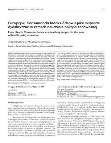 Korczyńska Hygeia Public A Health i wsp. Europejski 2013, 48(2): Konsumencki 137-139 Indeks Zdrowia jako wsparcie dydaktyczne w ramach nauczania ... 137 Europejski Konsumencki Indeks Zdrowia jako wsparcie dydaktyczne w ramach nauczania polityki zdrowotnej Euro Health Consumer Index as a teaching support in the area of health policy education Anna Korczyńska, Małgorzata Kowalska Katedra i Zakład Epidemiologii Śląskiego Uniwersytetu Medycznego w Katowicach Wykorzystywanie nowoczesnych źródeł informacji w postaci istniejących baz danych jest bardzo przydatnym narzędziem dydaktycznym w procesie nauczania polityki zdrowotnej. Stwarza możliwość obserwacji trendów w zakresie podstawowych wskaźników zdrowia i jego uwarunkowań związanych ze środowiskiem, stylem życia oraz infrastrukturą służby zdrowia w poszczególnych krajach. Ponadto daje możliwość porównań istniejących systemów, co jest niezwykle przydatne w zdrowiu publicznym dla ustalania priorytetów realizowanej polityki zdrowotnej. Ciekawą propozycją jest tzw. europejski konsumencki indeks zdrowia (Euro Health Consumer Index – EHCI) opracowywany i prezentowany rokrocznie na stronie internetowej w postaci raportów podsumowujących sytuację w poszczególnych krajach Europy. Warto aktywizować studentów w procesie samodzielnego dociekania słabości i niedomagań funkcjonujących systemów zdrowia oraz konfrontacji własnych obserwacji z oficjalnym stanowiskiem ekspertów zajmujących się polityką zdrowotną. Prezentowana praca jest propozycją wykorzystywania bazy EHCI w ramach zajęć ze zdrowia publicznego. The use of modern sources of information in existing databases is a very useful educational tool in the teaching process of health policy. It creates the opportunity to observe trends in important indicators of health and its determinants related to the environment, lifestyle and infrastructure of health care in particular countries. Moreover it offers the possibility of comparisons of the existing systems, which is extremely useful for determining the public health priorities of the health policy already implemented. An interesting proposition is Euro Health Consumer Index – EHCI, developed and presented each year on an EHCI website as a report summarizing the situation in European countries. It is worthwhile to activate students in the process of selfinquiries regarding the weaknesses of the presently functioning health systems and confront their own observations with the official position of health policy experts. This work is a proposal to use the EHCI database in the public health teaching process. Key words: EHCI, health policy, teaching Słowa kluczowe: EHCI, polityka zdrowotna, nauczanie © Hygeia Public Health 2013, 48(2): 137-139 Adres do korespondencji / Address for correspondence www.h-ph.pl Mgr Anna Korczyńska Katedra i Zakład Epidemiologii Śląskiego Uniwersytetu Medycznego w Katowicach ul. Medyków 18, 40-752 Katowice Ligota tel. 32 20 88 536, 500 237 378, e-mail: [email protected] Nadesłano: 16.05.2013 Zakwalifikowano do druku: 29.05.2013 Wprowadzenie Polityka zdrowotna jest dziedziną, która m.in. uczy podstaw funkcjonowania obecnych systemów ochrony zdrowia, dlatego też charakteryzuje ją mnogość zasad działania opartych o nauki z zakresu polityki, prawa czy ekonomii. Obecna sytuacja demograficzna oraz gospodarcza w Europie jest niezwykle ciekawa z punktu widzenia tej dziedziny. Procesy związane z pogłębiającym się starzeniem populacji oraz utrzymujący się kryzys gospodarczy stawiają kraje europejskie przed nowymi wyzwaniami – zarówno w obrębie struktur, jak i w zakresie funkcjonowania istniejących systemów ochrony zdrowia. Dlatego też aktualne nauczanie polityki zdrowotnej powinno uwzględniać nowoczesne narzędzia i bieżące dane, co pozwoli na wiarygodną ocenę sytuacji a zarazem umożliwi studentom samodzielne i aktywne przyswajanie wiedzy. Takie oczekiwania wydaje się spełniać Europejski Konsumencki Indeks Zdrowia, który można wykorzystywać właśnie w nauczaniu polityki zdrowotnej. Europejski Indeks Konsumencki (EHCI) jest cennym wskaźnikiem zaproponowanym przez organizację Health Consumer Powerhouse (HCP) i prezentowanym rokrocznie w formie raportów, począwszy od 2004 roku. Wskaźnik ten jest propozycją oceny systemów ochrony zdrowia w Europie uwzględniającą oczekiwania i opinie pacjentów. Początkowo organizacja HCP skupiła się na analizie macierzystego – szwedzkiego systemu ochrony zdrowia. Utworzony dla potrzeb ana- Hygeia Public Health 2013, 48(2): 137-139 138 lizy ranking, dostępny dla ogółu społeczeństwa, stał się cennym źródłem wiedzy dla wprowadzanych zmian. Przedsięwzięcie szybko rozszerzono na pozostałe kraje europejskie i tym samym utworzono narzędzie służące porównywaniu systemów ochrony zdrowia w Europie [1]. Należy raz jeszcze podkreślić, że EHCI jest zbiorem wielu informacji zawartych w formie wskaźników charakteryzujących systemy opieki zdrowotnej z perspektywy pacjentów, bowiem coraz częściej podkreśla się istotną rolę pacjenta w ustalaniu jakości świadczonych usług medycznych [2]. Źródła danych EHCI Początkowo koncepcja EHCI była zbudowana w oparciu o 20 wskaźników i dokonany przegląd w postaci raportu zaprezentowano dla 12 państw europejskich; obecnie EHCI obejmuje wszystkie kraje należące do UE, czyli obejmuje 27 państw, ale także kraje kandydujące, czyli Chorwację, Macedonię, Albanię, Islandię oraz Serbię. W swojej konstrukcji wykorzystuje aktualnie 42 wskaźniki zawierające się w pięciu istotnych (z perspektywy pacjenta) obszarach oceny. Należą do nich następujące obszary, z przypisaną maksymalną liczbą punktów możliwą do zdobycia: •prawa pacjenta i dostęp do informacji, z maksymalną liczbą punktów 175 •czas oczekiwania na leczenie, z maksymalną liczbą punktów 250 •wyniki leczenia, z maksymalną liczbą punktów 300 •pr