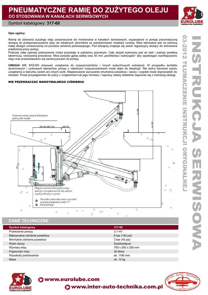 PNEUMATYCZNE RAMIĘ DO ZUŻYTEGO OLEJU DO STOSOWANIA W KANAŁACH SERWISOWYCH Symbol katalogowy: 317-60 Opis ogólny: NIE PRZEKRACZAĆ MAKSYMALNEGO CIŚNIENIA! DANE TECHNICZNE Symbol katalogowy 317-60 Przełożenie pompy Maksymalne ciśnienie powietrza Minimalne ciśnienie powietrza Wylot cieczy Wymiary misy Pojemność misy Wysokość podnoszenia Masa 3:1 HV 8 bar (150 psi) 3 bar (45 psi) Szybkozłącze 700 x 300 x 200 mm 30 litrów ok. 1160 mm ok. 12 kg www.eurolube.com www.inter-auto-technika.com.pl INSTRUKCJA SERWISOWA UWAGA! NIE WOLNO stosować urządzenia do rozpuszczalników i innych wybuchowych substancji. W przypadku kontaktu aluminiowych i cynkowych elementów pompy z niektórymi rozpuszczalnikami może dojść do eksplozji!. Nie wolno kierować wylotu urządzenia w kierunku swoim ani innych osób. Nieplanowane wyrzucenie strumienia powietrza / cieczy / cząstek może doprowadzić do obrażeń. Przed przystąpieniem do pracy z urządzeniem lub jego montażu / naprawy należy dokładnie zapoznać się z instrukcją obsługi. 03-2012 TŁUMACZENIE INSTRUKCJI ORYGINALNEJ Ramię do zbierania zużytego oleju przeznaczone do montowania w kanałach serwisowych, wyposażone w pompę pneumatyczną służącą do przepompowywania oleju do odrębnych zbiorników za pośrednictwem instalacji rurowej. Misa sterowana jest za pomocą małej dźwigni umieszczonej na przodzie ramienia podnoszącego. Pod dźwignią znajduje się zawór regulacyjny służący do sterowania prędkością pracy pompy. Podczas całej operacji podnoszenia miska pozostaje w położeniu poziomym. Cały zespół wykonany jest ze stali i pokryty powłoką lakierniczą, nanoszoną proszkowo. Misa posiada gęstą siatkę oraz 30 mm „pochłaniacz rozbryzgów” aby zapobiegać rozchlapywaniu oleju oraz przedostawaniu się zanieczyszczeń do pompy. PNEUMATYCZNE RAMIĘ DO ZUŻYTEGO OLEJU DO STOSOWANIA W KANAŁACH SERWISOWYCH Symbol katalogowy: 317-60 MONTAŻ MONTAŻ SZYNY: Do mocowania zespołu odprowadzającego olej służy szyna o przekroju C 40x40 mm. Szyna dostarczana jest w odcinkach długości 4 m (ostatni z odcinków należy dociąć odpowiednio do długości kanału. Szynę należy zamocować do sklepienia górnej półki kanału jak najbliżej krawędzi, jednak nie bliżej niż 150 mm aby misa ustawiona w pozycji spoczynkowej była w całości chroniona przez półkę kanału. Odległość pomiędzy wspornikami szyny powinna wynosić od 2 do 2,2 m. Pierwszy i ostatni wspornik powinny znajdować się w odległości około 0,5 m od końców szyny. Jeśli sklepienie jest pochyłe, konieczne może być zastosowanie śrub z podkładkami dystansowymi dla właściwego ustawienia szyny. Na końcach szyny winny być zamontowane elementy ograniczające. MONTAŻ ZESPOŁU PRZEJEZDNEGO: Wepchnąć zespół przejezdny we właściwe miejsce w szynie. Ustawić w pionie z wykorzystaniem ramienia kółka podporowego. Dokładne ustawienie zespołu w pionie ma fundamentalne znaczenie dla wyeliminowania tendencji do samoczynnego składania się ramienia do położenia spoczynkowego. Po ustawieniu zespołu dociąć rurkę kółka podporowego, tak aby nie wystawała więcej niż 5 – 10 mm. PODŁĄCZENIE INSTALACJI ODPROWADZAJĄCEJ OLEJ ORAZ PNEUMATYCZNEJ: Do odprowadzania zużytego oleju zaleca się stosowanie rur hydraulicznych o średnicy ø22 mm. Rury mocuje się do ściany kanału powyżej kółka podporowego, w odległości około 50 mm od siebie. Rurę olejową należy umieścić wyżej niż rurę powietrzną! Można stosować podwójne uchwyty do rur. Odległość pomiędzy przyłączami to około 6m. Przyłącze pneumatyczne winno znajdować się ok. 100 mm od przyłącza zużytego oleju. W instalacji odprowadzającej olej musi być zastosowany zawór odcinający. Nie jest on niezbędny w instalacji pneumatycznej jednak jego zastosowanie ułatwi ewentualne prace serwisowe. Pozycja www.eurolube.com Opis 1 Ogranicznik rozbryzgów (niewidoczny na rysunku) 2 Siatka misy olejowej (niewidoczna na rysunku) 3 Misa 30 l. 4 Dźwignia siłownika pneumatycznego 5 Zawór igłowy do sterowania prędkością pompy 6 Wąż odprowadzający zużyty olej 7 Pneumatyczny siłownik podnoszący 8 Zestaw węży przyłączeniowych 9 Szybkozłącze zużytego oleju 10 Szybkozłącze powietrza 11 Kółko podpierające 12 Filtr ssania 13 Pompa 3:1 HV 14 Wózek 15 Szyna o przekroju C (sprzedawana oddzielnie, symbol 317-61) 16 Filtr-regulator do powietrza www.inter-auto-technika.com.pl PNEUMATYCZNE RAMIĘ DO ZUŻYTEGO OLEJU DO STOSOWANIA W KANAŁACH SERWISOWYCH Symbol katalogowy: 317-60 OBSŁUGA TECHNICZNA I KONSERWACJA Codziennie: 1. Oczyścić ogranicznik rozbryzgów (1) aby zapobiec przedostawaniu się zanieczyszczeń do pompy. Co tydzień: 2. Ze względów bezpieczeństwa przed przystąpieniem do jakichkolwiek prac serwisowych należy odłączyć urządzenie od instalacji pneumatycznej i spuścić ciśnienie. 3. Opróżnić i oczyścić filtr-regulator powietrza (16) 4. Opróżnić i oczyścić filtr ssania (12) 5. Skontrolować czy na dnie misy nie zebrały się zanieczyszczenia. Zdjąć misę z ramienia i wyczyścić. 6. Regularnie kontrolować wszystkie złącza pod kątem potencjalnych przecieków. Kontrolować węże pod kątem uszkodzeń i zużycia. Niezwłocznie wymieniać wszystkie zużyte / uszkodzone części dla uniknięcia poważniejszych problemów. W razie konieczności dokonania przeglądu lub naprawy pompy zapoznać się z jej odrębną instrukcją obsługi. ZALECENIA ODNOŚNIE BEZPIECZEŃSTWA PRACY Z URZĄDZENIEM • Pompa jest przeznaczona do pracy z nie wywołującymi korozji ropopochodnymi cieczami. Nie można używać jej do innych celów ani do pompowania benzyny czy też innych cieczy wybuchowych. • Wszelkie stosowane elementy muszą być dostosowane do występującego w instalacji ciśnienia roboczego. • Nie należy stosować wyższego ciśnienia niż to wymagane do satysfakcjonującej pracy urządzenia. • Przed oddaniem insta