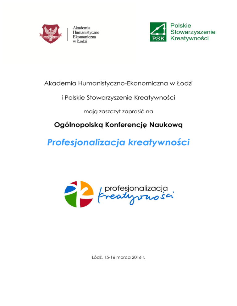 Akademia Humanistyczno-Ekonomiczna w Łodzi i Polskie Stowarzyszenie Kreatywności mają zaszczyt zaprosić na Ogólnopolską Konferencję Naukową Profesjonalizacja kreatywności Łódź, 15-16 marca 2016 r. Komitet Naukowy Przewodnicząca: Przewodniczący: Dr Kamila Witerska Prof. dr hab. Krzysztof J. Szmidt Zastępca przewodniczącej: Uniwersytet Łódzki Dr Elżbieta Woźnicka Członkowie: Członkowie: Prof. dr hab. Andrzej Falkowski Dr Leszek Kuras Uniwersytet SWPS Dr Kamila Lasocińska Prof. dr hab. Eugeniusz Józefowski Dr Łukasz Zaorski-Sikora Akademia Sztuk Pięknych im. Eugeniusza Mgr Anna Przybylska - Polskie Stowarzyszenie Gepperta we Wrocławiu Kreatywności Prof. dr hab. Joanna Madalińska-Michalak Uniwersytet Warszawski Prof. nadzw. dr hab. Janina Uszyńska-Jarmoc Uniwersytet w Białymstoku Dr hab. Irena Pufal-Struzik, prof. UJK Uniwersytet Jana Kochanowskiego W Kielcach Prof. dr hab. Wiesław Karolak Akademia Sztuk Pięknych w Łodzi Komitet Organizacyjny Patronat Honorowy: Partnerzy: Komunikat 2 Głównym celem konferencji jest próba odnalezienia odpowiedzi na pytania dotyczące profesjonalizacji kreatywności i zastanowienie się nad tym czy można mówić o profesjonalizacji kreatywności i w czym się przejawia? Chcielibyśmy, aby nasze spotkanie miało charakter wymiany myśli, doświadczeń, poglądów i dyskusji nad obecnym kształtem kreatywności, jej zakresem, wymiarami i efektami. Pragniemy poddać szerokiej dyskusji zagadnienie profesjonalizacji kreatywności jako jednej z ważniejszych cech nowoczesnego modelu kształcenia. Chcemy wydobyć aspekty profesjonalizowania się kreatywności, przekształcania kreatywności z tej będącej na marginesie w odrębną dziedzinę. Zauważamy bowiem, że kreatywność zyskuje własną tożsamość i znaczenie. Dlatego w trakcie niniejszej konferencji chcemy skupić się nie tylko na refleksji teoretycznej, ale także na prezentacji dzieł twórczych, stymulowaniu procesu ich powstawania oraz na promocji kreatywności. Obrady skoncentrowane będą wokół następujących zagadnień: 1. Identyfikowanie zainteresowań i zdolności 2. Stymulowanie rozwoju kompetencji kreatywnych 3. Sektor kreatywny jako wynik profesjonalizacji 4. Refleksja teoretyczna o kreatywności Najważniejszym zagadnieniem będzie problem: W jaki sposób sprofesjonalizować kreatywność? Formuła konferencji jest otwarta. Dopuszczamy różne formy prezentacji idei i dzieł, ale zapraszamy także do prezentacji własnych i oryginalnych propozycji twórczej wymiany myśli o rzeczywistości czy własnych twórczych działaniach. Proponujemy: prezentacje dzieł będących wytworem twórczej działalności. Prezentacja dzieła może obejmować oryginalne rozwiązania będące wynikiem postawy twórczej, działań twórczych, których efektem są rozwiązania oraz ich zastosowanie. nowe idee, koncepcje i oryginalne Może obejmować projekty indywidualne lub grupowe. Może to być np. prezentacja szkoły i prowadzonych w niej rozwiązań innowacyjnych, rozwiązań prezentacja metodycznych autorskiego programu wprowadzanych w nauczania, szkole, działań oryginalnych artystycznych i okołoartystycznych, rozwiązań biznesowych itp. Konferencja skierowana jest do szerokiego grona odbiorców, którym kreatywność jest bliska w życiu codziennym. Interesuje nas kreatywność w dowolnym obszarze: edukacja, biznes, działania w społeczności lokalnej, działalność organizacji pozarządowych, arteterapia, nowe media, sztuka. Mamy nadzieję, że konferencja stanie się okazją do spotkania w gronie osób pracujących na rzecz profesjonalizacji kreatywności, do inspirujących dyskusji dotyczących twórczych idei. Rezultatem konferencji będzie recenzowana monografia naukowa (5 pkt.) Konferencję urozmaicą warsztaty i szkolenia zakończone certyfikatami – o szczegółach poinformujemy wkrótce. Chcielibyśmy również zakomunikować Państwu, że partnerami naszej konferencji są kluczowe łódzkie instytucje wspierające działania o charakterze twórczym, innowacyjnym, niejako mecenasi kreatywności: WIMA – Widzewska Manufaktura, jest to pozostałość po łódzkich zakładach przemysłu bawełnianego. Stare hale fabryczne przekształciły się w miejsca sztuki, działalności artystycznej, małej manufaktury. Prowadzona w nich aktywność edukacyjna, artystyczna i biznesowa jest wynikiem kreatywności młodych ludzi, chcących zrealizować swoje pasje. Stare pofabryczne hale są obecnie miejscem kreatywnej działalności łodzian. Inkubator przemysłów kreatywnych Art_Inkubator w Fabryce Sztuki to miejsce, gdzie twórczość spotyka się z przedsiębiorczością. Poprzez ten projekt Fabryka Sztuki jako instytucja otoczenia biznesu wspiera osoby kreatywne w działalności rynkowej a jako instytucja kultury realizuje działania mające na celu promocję sztuki i profesjonalizację kadr. Fabryka Sztuki poprzez Art_Inkubator zapewnia pomoc firmom z branży kreatywnej w najtrudniejszym momencie działalności, czyli na starcie i przez pierwsze lata funkcjonowania. Inkubowane firmy mogą inicjować i rozwijać działalność korzystając z preferencyjnych warunków funkcjonowania. Przedsiębiorcy z branży kreatywnej mają do dyspozycji różnego rodzaju przestrzenie, potężną platformę usług elektronicznych oraz doradców i szkoleniowców. Jest to pierwszy w Polsce projekt kompleksowo wspierający przedsiębiorczość w sektorze kreatywnym. EC1 Łódź – Miasto Kultury, najstarsza łódzka elektrownia EC 1 powstała w 1907 roku i służyła mieszkańcom miasta aż do roku 2001. EC1 obecnie staje się miejscem kultury, nauki i rekreacji. W części tzw. Zachód powstaje Centrum Nauki i Techniki. Koncepcja Interaktywnego Centrum Nauki opiera się na założeniu, że istniejąca część elektrociepłowni, wraz z zachowanymi w niej zabytkowymi urządzeniami, stanie się bazą narracji historycznej tj. przywołującej czasy uruchomienia i funkcjonowania 