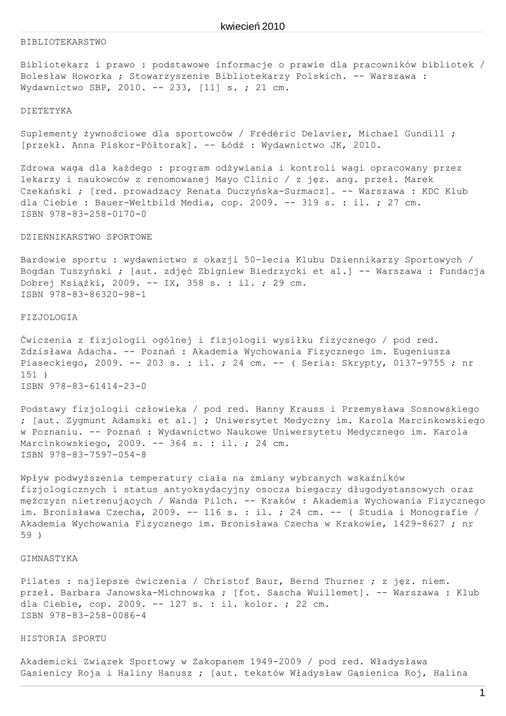 kwiecień 2010 BIBLIOTEKARSTWO Bibliotekarz i prawo : podstawowe informacje o prawie dla pracowników bibliotek / Bolesław Howorka ; Stowarzyszenie Bibliotekarzy Polskich. -- Warszawa : Wydawnictwo SBP, 2010. -- 233, [11] s. ; 21 cm. DIETETYKA Suplementy żywnościowe dla sportowców / Frédéric Delavier, Michael Gundill ; [przekł. Anna Piskor-Półtorak]. -- Łódź : Wydawnictwo JK, 2010. Zdrowa waga dla każdego : program odżywiania i kontroli wagi opracowany przez lekarzy i naukowców z renomowanej Mayo Clinic / z jęz. ang. przeł. Marek Czekański ; [red. prowadzący Renata Duczyńska-Surmacz]. -- Warszawa : KDC Klub dla Ciebie : Bauer-Weltbild Media, cop. 2009. -- 319 s. : il. ; 27 cm. ISBN 978-83-258-0170-0 DZIENNIKARSTWO SPORTOWE Bardowie sportu : wydawnictwo z okazji 50-lecia Klubu Dziennikarzy Sportowych / Bogdan Tuszyński ; [aut. zdjęć Zbigniew Biedrzycki et al.] -- Warszawa : Fundacja Dobrej Książki, 2009. -- IX, 358 s. : il. ; 29 cm. ISBN 978-83-86320-98-1 FIZJOLOGIA Ćwiczenia z fizjologii ogólnej i fizjologii wysiłku fizycznego / pod red. Zdzisława Adacha. -- Poznań : Akademia Wychowania Fizycznego im. Eugeniusza Piaseckiego, 2009. -- 203 s. : il. ; 24 cm. -- ( Seria: Skrypty, 0137-9755 ; nr 151 ) ISBN 978-83-61414-23-0 Podstawy fizjologii człowieka / pod red. Hanny Krauss i Przemysława Sosnowskiego ; [aut. Zygmunt Adamski et al.] ; Uniwersytet Medyczny im. Karola Marcinkowskiego w Poznaniu. -- Poznań : Wydawnictwo Naukowe Uniwersytetu Medycznego im. Karola Marcinkowskiego, 2009. -- 364 s. : il. ; 24 cm. ISBN 978-83-7597-054-8 Wpływ podwyższenia temperatury ciała na zmiany wybranych wskaźników fizjologicznych i status antyoksydacyjny osocza biegaczy długodystansowych oraz mężczyzn nietrenujących / Wanda Pilch. -- Kraków : Akademia Wychowania Fizycznego im. Bronisława Czecha, 2009. -- 116 s. : il. ; 24 cm. -- ( Studia i Monografie / Akademia Wychowania Fizycznego im. Bronisława Czecha w Krakowie, 1429-8627 ; nr 59 ) GIMNASTYKA Pilates : najlepsze ćwiczenia / Christof Baur, Bernd Thurner ; z jęz. niem. przeł. Barbara Janowska-Michnowska ; [fot. Sascha Wuillemet]. -- Warszawa : Klub dla Ciebie, cop. 2009. -- 127 s. : il. kolor. ; 22 cm. ISBN 978-83-258-0086-4 HISTORIA SPORTU Akademicki Związek Sportowy w Zakopanem 1949-2009 / pod red. Władysława Gąsienicy Roja i Haliny Hanusz ; [aut. tekstów Władysław Gąsienica Roj, Halina Hanusz, Wojciech Szatkowski]. -- Zakopane ; Kraków : Fall, 2010. -- 191, [1] s., 1 [16] s. tabl. : il. ; 24 cm. Akademicki Związek Sportowy w Zakopanem 1949-2009 / pod red. Władysława kwiecień 2010 Władysław Gąsienica Roj, Halina Gąsienicy Roja i Haliny Hanusz ; [aut. tekstów Hanusz, Wojciech Szatkowski]. -- Zakopane ; Kraków : Fall, 2010. -- 191, [1] s., [16] s. tabl. : il. ; 24 cm. 40 lat kolarstwa w LKS POM Strzelce Krajeńskie (1968-2008) / Zbigniew Szafkowski. -- Gorzów Wlkp. ; Strzelce Krajeńskie : Lubuska Rada Olimpijska, 2010. -- 120 s. : il. kolor. ; 21 cm. ISBN 978-83-924086-5-9 Kronika sportu polskiego 2009 / [aut. tekstu: Adam Dutlinger et al. ; red. nacz. Bogdan Chruścicki ; wyd. Mariusz Piłat ; aut. zdj.: A. Paczesny et al.]. -Warszawa : Fundacja Dobrej Książki, cop. 2010. -- 583, [2] s. : il. kolor. ; 29 cm. ISBN 978-83-86320-59-2 Legendarni mistrzowie karate / Jose M. Fraguas ; [tł.: Jakub Piotrkowicz, Patryk Sapała]. -- Warszawa : Wydawnictwo Warszawskiego Centrum Karate, 2008. -- 339 s. : il. ; 30 cm. ISBN 978-83-900409-7-4 Transnational aspects of European sport history : proceedings of the 13th CESH Congres, Gorzów Wlkp., Poland / Tomasz Jurek, Stephan Wassong (eds.). -- Gorzów Wlkp. : [Akademia Wychowania Fizycznego w Poznaniu. Zamiejscowy Wydział Kultury Fizycznej], 2009. -- 316 s. : il. kolor. ; 21 cm. ISBN 978-83-930278-0-4 MEDYCYNA Autyzm : epidemiologia, diagnoza i terapia / pod red. Tadeusza Pietrasa, Andrzeja Witusika i Piotra Gałeckiego. -- Wrocław : Wydawnictwo Continuo, 2010. -- 239 s., [8] s. tabl. kolor. : il. kolor. ; 25 cm. MEDYCYNA NIEKONWENCJONALNA Mądrość ciała : czaszkowo-krzyżowe podejście do istoty zdrowia / Michael Kern ; przekł. Marta Kulon, Dorota Tomczyk. -- Warszawa : Virgo, 2010. Niefarmakologiczne metody uzupełniające leczenie niektórych chorób / red. nauk. Zygmunt Antoszewski, Barbara Błońska-Fajfrowska, Janusz H. Skalski ; [aut. Zygmunt Antoszewski et al.]. -- Chorzów : Oficyna Wydawnicza Śląskiej Wyższej Szkoły Informatyki, 2007. -- 280 s. : il. ; 21 cm. MEDYCYNA SPORTOWA Antydoping w Polsce / [aut. Dariusz Błachnio et al. ; red. Andrzej Pokrywka]. -Warszawa : Instytut Sportu, 2009. -- 59, 9 s. : il. ; 24 cm. ISBN 978-83-903294-0-6 Doping zabija sport : skutki i przeciwdziałanie / [red. Wiesława Granowska ; aut. Dariusz Błachnio et al. ; Towarzystwo Warszawskie Lekarskie]. -- Warszawa : [s.n.], 2007. (Warszawa : Oficyna Wydawniczo-Poligraficzna "Adam"). -- 135 s. : il. ; 24 cm. ISBN 978-83-7232-747-5 METODOLOGIA 2 kwiecień 2010 Metodologia badań obszaru pośredniczenia w komunikacji naukowej z perspektywy nauki o informacji / Remigiusz Sapa. -- Kraków : Wydawnictwo Uniwersytetu Jagiellońskiego, 2009. -- 214, [1] s. : il. ; 24 cm. -- ( Zeszyty Naukowe Uniwersytetu Jagiellońskiego. Prace z Bibliotekoznawstwa i Informacji Naukowej, 1230-7025 ; z. 17 ) Wykorzystanie badań naukowych w wychowaniu fizycznym i sporcie : praca badawcza z 4 obszarów aktywności ruchowej: sport, wychowanie fizyczne, rekreacja i fizjoterapia. Cz. 2 / pod red. Józefa Wojnara, Bożeny WojciechowskiejMaszkowskiej i Rafała Tatarucha ; Politechnika Opolska. Wydział Wychowania Fizycznego i Fizjoterapii. -- Opole : Politechnika Opolska. Wydział Wychowania Fizycznego i Fizjoterapii, 2009. -- 232 s. : il. ; 24 cm. ISBN 978-83-928426-2-0 MOTORYKA Badania zmienności cech budowy somatycznej i sprawności motorycznej żołnierzy zasadniczej służby wojskowej i studentów wychowania fizycznego / Antoni Seredyński. -- Rzeszów : Wydawnictwo Uniwersytet