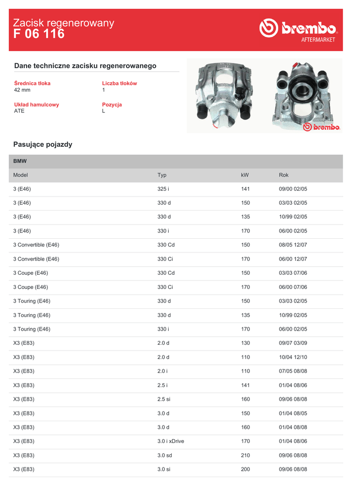 Zacisk regenerowany F 06 116 Dane techniczne zacisku regenerowanego Średnica tłoka 42 mm Liczba tłoków 1 Układ hamulcowy ATE Pozycja L Pasujące pojazdy BMW Model Typ kW Rok 3 (E46) 325 i 141 09/00 02/05 3 (E46) 330 d 150 03/03 02/05 3 (E46) 330 d 135 10/99 02/05 3 (E46) 330 i 170 06/00 02/05 3 Convertible (E46) 330 Cd 150 08/05 12/07 3 Convertible (E46) 330 Ci 170 06/00 12/07 3 Coupe (E46) 330 Cd 150 03/03 07/06 3 Coupe (E46) 330 Ci 170 06/00 07/06 3 Touring (E46) 330 d 150 03/03 02/05 3 Touring (E46) 330 d 135 10/99 02/05 3 Touring (E46) 330 i 170 06/00 02/05 X3 (E83) 2.0 d 130 09/07 03/09 X3 (E83) 2.0 d 110 10/04 12/10 X3 (E83) 2.0 i 110 07/05 08/08 X3 (E83) 2.5 i 141 01/04 08/06 X3 (E83) 2.5 si 160 09/06 08/08 X3 (E83) 3.0 d 150 01/04 08/05 X3 (E83) 3.0 d 160 01/04 08/08 X3 (E83) 3.0 i xDrive 170 01/04 08/06 X3 (E83) 3.0 sd 210 09/06 08/08 X3 (E83) 3.0 si 200 09/06 08/08 X3 (E83) xDrive 18 d 105 09/08 12/11 X3 (E83) xDrive 20 d 120 09/08 08/10 X3 (E83) xDrive 20 d 130 09/08 08/10 X3 (E83) xDrive 20 i 110 09/08 08/11 X3 (E83) xDrive 25 i 160 09/08 12/11 X3 (E83) xDrive 30 d 155 09/08 04/11 X3 (E83) xDrive 30 d 160 09/08 04/11 X3 (E83) xDrive 30 i 200 09/08 12/11 X3 (E83) xDrive 35 d 210 09/08 08/11 Numery OE Pasujące kody OE BMW 34216750161 BMW 34216765883