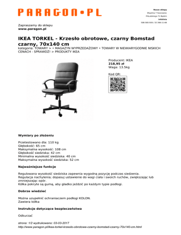 Nasze sklepy Wspólna 7 Sosnowiec Piłsudskiego 71 Będzin Infolinia 508-500-500 / 32 266-11-66 Zapraszamy do sklepu www.paragon.pl IKEA TORKEL - Krzesło obrotowe, czarny Bomstad czarny, 70x140 cm kategoria: TOWARY > • MAGAZYN WYPRZEDAŻOWY • TOWARY W NIEWIARYGODNIE NISKICH CENACH - SPRAWDŹ! > PRODUKTY IKEA Producent: IKEA 218,95 zł Waga: 13.5kg Kod QR: Wymiary po złożeniu Przetestowano dla: 110 kg Głębokość: 65 cm Maksymalna wysokość: 108 cm Głębokość siedziska: 42 cm Minimalna wysokość siedziska: 40 cm Maksymalna wysokość siedziska: 52 cm Najważniejsze funkcje Regulowana wysokość siedziska zapewnia wygodną pozycję podczas siedzenia. Regulacja nachylenia; dopasuj ustawienie do wagi ciała i swoich ruchów, zwiększając lub zmniejszając opór. Kółka pokryte są gumą, aby gładko jeździć po każdym typie podłogi. Dobrze wiedzieć Można uzupełnić ochraniaczem podłogi KOLON. Zawiera kółka Instrukcje dotyczące bezpieczeństwa Odkurzać strona: 1/2 wydrukowano: 03-03-2017 http://www.paragon.pl/ikea-torkel-krzeslo-obrotowe-czarny-bomstad-czarny-70x140-cm.html Chronić przed bezpośrednim nasłonecznieniem, by zapobiec wysuszeniu. Opis produktu Rama tylna: stal, Epoksydowa/poliestrowa powłoka proszkowa Wypełnienie siedziska: watolina poliestrowa, Pianka poliuretanowa 35kg/m3 Rama oparcia: tworzywo polipropylenowe Tkanina z pokryciem: 75% poliester, 25% bawełna, 100% poliuretan strona: 2/2 wydrukowano: 03-03-2017 http://www.paragon.pl/ikea-torkel-krzeslo-obrotowe-czarny-bomstad-czarny-70x140-cm.html
