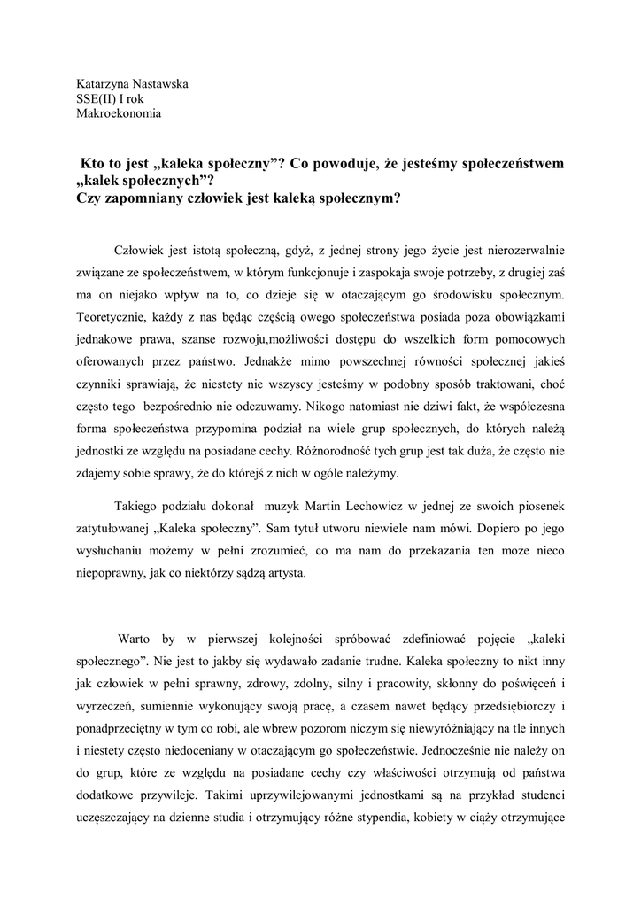 Katarzyna Nastawska SSE(II) I rok Makroekonomia Kto to jest „kaleka społeczny”? Co powoduje, że jesteśmy społeczeństwem „kalek społecznych”? Czy zapomniany człowiek jest kaleką społecznym? Człowiek jest istotą społeczną, gdyż, z jednej strony jego życie jest nierozerwalnie związane ze społeczeństwem, w którym funkcjonuje i zaspokaja swoje potrzeby, z drugiej zaś ma on niejako wpływ na to, co dzieje się w otaczającym go środowisku społecznym. Teoretycznie, każdy z nas będąc częścią owego społeczeństwa posiada poza obowiązkami jednakowe prawa, szanse rozwoju,możliwości dostępu do wszelkich form pomocowych oferowanych przez państwo. Jednakże mimo powszechnej równości społecznej jakieś czynniki sprawiają, że niestety nie wszyscy jesteśmy w podobny sposób traktowani, choć często tego bezpośrednio nie odczuwamy. Nikogo natomiast nie dziwi fakt, że współczesna forma społeczeństwa przypomina podział na wiele grup społecznych, do których należą jednostki ze względu na posiadane cechy. Różnorodność tych grup jest tak duża, że często nie zdajemy sobie sprawy, że do którejś z nich w ogóle należymy. Takiego podziału dokonał muzyk Martin Lechowicz w jednej ze swoich piosenek zatytułowanej „Kaleka społeczny”. Sam tytuł utworu niewiele nam mówi. Dopiero po jego wysłuchaniu możemy w pełni zrozumieć, co ma nam do przekazania ten może nieco niepoprawny, jak co niektórzy sądzą artysta. Warto by w pierwszej kolejności spróbować zdefiniować pojęcie „kaleki społecznego”. Nie jest to jakby się wydawało zadanie trudne. Kaleka społeczny to nikt inny jak człowiek w pełni sprawny, zdrowy, zdolny, silny i pracowity, skłonny do poświęceń i wyrzeczeń, sumiennie wykonujący swoją pracę, a czasem nawet będący przedsiębiorczy i ponadprzeciętny w tym co robi, ale wbrew pozorom niczym się niewyróżniający na tle innych i niestety często niedoceniany w otaczającym go społeczeństwie. Jednocześnie nie należy on do grup, które ze względu na posiadane cechy czy właściwości otrzymują od państwa dodatkowe przywileje. Takimi uprzywilejowanymi jednostkami są na przykład studenci uczęszczający na dzienne studia i otrzymujący różne stypendia, kobiety w ciąży otrzymujące becikowe czy też bezrobotni, którzy także zyskują z faktu posiadanego statusu połecznego. Takich zbiorowości można by wyliczać w nieskończoność. To właśnie dzięki pracy przeciętnego człowieka, który w naszym przypadku nazywany jest „kaleką społecznym” ci pozostali mogą na tym korzystać. Nie ulega wątpliwości, że taki stan rzeczy świadczy o dyskryminacji owego obywatela, który tak naprawdę płaci podatki po to, by innym żyło się lepiej, bez wględu na to czy faktycznie na to zasługują czy nie. Nie jest on przy tym dostrzegany ani przez innych ludzi ani też przez samo państwo. Wykonuje tylko to co do niego należy, chce czy nie chce, bo tak dyktuje mu istniejące prawo, a w razie sprzeciwu czekałyby go niemiłe konsekwencje. Stąd też można powiedzieć, że określenie, jakiego użył Lechowicz po to, by nazwać taką jednostkę jest w pełni trafne. Kaleka społeczny, czyli ktoś, kto nie jest w stanie sam nic wskórać, by zmienić swój los, który czyni z niego osobę poszkodowaną, a jednocześnie bezradną w społeczeństwie, w którym żyje. Z drugiej strony można by przytoczyć pewną analogię między kaleką jako osobą nie w pełni sprawną a wyżej opisanym kaleką społecznym. Tym, co łączy obie jednostki jest fakt, iż stanowią one niejako przedmiot dyskryminacji i o ile w przypadku tej pierwszej podejmowane są wszelki formy walki z dyskryminacją, o tyle jeśli chodzi o kaleki społeczne, to nic nie robi się w kierunku poprawy ich sytuacji, co więcej znajdują się one najniżej w hierarchii społecznej. Najwyższe miejsce w tym społecznym porządku zajmują naturalnie władze, kolejne stopnie tej „piramidy” zarezerwowane są dla tych, którzy otrzymują pomoc od państwa, zaś na samym końcu usytuowani są ci, którzy mają największy wkład w rozwój zarówno społeczeństwa, jak i całego państwa, a więc „kaleki społeczne”. Kolejną ważną kwestią, nad jaką warto by zastanowić i rozważyć jest fakt, iż należymy do społeczeństwa kalek społecznych i nie ulega to najmniejszej wątpliwości. To, co mogłoby być przedmiotem dyskusji jest problem czynników, przyczyn, które sprawiają, że żyjemy w takim, a nie innym społeczeństwie. Po pierwsze, wynika to z systemu państwa, w jakim żyjemy.Obowiązek płacenia podatków jest czymś normalnym, w końcu jak powiedział Benjamin Franklin „ Na tym świecie pewne są jedynie śmierć i podatki”. Co więcej, podatki przyczyniają się do redystrybucji dochodów w społeczeństwie, co przejawia się m.in. w transferach pieniężnych z portfeli podatników w kierunku (czasem najbardziej) potrzebujących jednostek społecznych. Skoro żyjemy w takim systemie, to wiadome jest, że nie jesteśmy w stanie mu się przeciwstawić, bo i tak z nim nie wygramy. Jednocześnie wynika z tego, że nie jesteśmy kalekami społecznymi z wyboru, bo przecież któż z nas mając możliwość płacenia lub niepłacenia podatków nie wybrałby drugiej opcji? Kolejnym problemem jest brak przynależności do określonej grupy, tj. bezrobotnych, studentów itp. Tak naprawdę nie wiadomo, czy powinniśmy się cieszyć czy nie z tego,że nie spełniamy takich kryteriów. Może nie należymy do grona osób pozostających bez pracy, którzy mogą cieszyć się z tego,że otrzymują zasiłki, ale musimy pamiętać, że mamy stabilną i często przynoszącą nam satysafkcję pracę, a to czasem stanowi priorytet w naszym życiu codziennym. Następnym argumentem, który niejako przemawia za tym, że należymy do społeczeństwa kalek społecznych jest fakt, iż spełniamy różne role społeczne, których realizacja