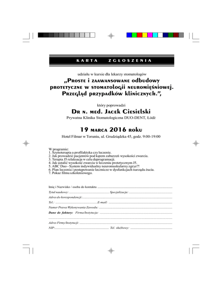 KARTA ZG£OSZENIA udziału w kursie dla lekarzy stomatologów „Proste i zaawansowane odbudowy protetyczne w stomatologii neuromiêœniowej. Przegl¹d przypadków klinicznych.”, który poprowadzi Dr n. med. Jacek Ciesielski Prywatna Klinika Stomatologiczna DUO-DENT, Łódź 19 marca 2016 roku Hotel Filmar w Toruniu, ul. Grudziądzka 45, godz. 9:00-19:00 W programie: 1. Szynoterapia a profilaktyka czy leczenie. 2. Jak prowadzić pacjentów pod kątem zaburzeń wysokości zwarcia. 3. Terapia J5 relaksacja w celu deprogramacji. 4. Jak ustalić wysokość zwarcia w leczeniu protetycznym J5. 5. ABC Duo - System indywidualny neuromuskularny zgryz?! 6. Plan leczenia i postępowanie lecznicze w dysfunkcjach narządu żucia. 7. Pokaz filmu szkoleniowego. Imię i Nazwisko / osoba do kontaktu ............................................................................................. Tytuł naukowy: .................................................. Specjalizacja: ...................................................... Adres do korespondencji:................................................................................................................. Tel.: ....................................................E-mail: ............................................................................... Numer Prawa Wykonywania Zawodu: ............................................................................................ Dane do faktury: Firma/Instytucja: ......................................................................................... .................................................................................................................................................... Adres Firmy/Instytucji: .................................................................................................................... NIP:................................................................... Tel. służbowy: .................................................... Jestem zainteresowany: Proszę wpisać „TAK” przy wybranych punktach oferty oraz wpisać odpowiednią do wyboru kwotę w zł. I. Uczestnictwem w Kursie ........... Opłata .................... zł (TAK/NIE) 230 zł - w terminie do 31 stycznia 2016 255 zł - w terminie do 29 lutego 2016 285 zł - w terminie do 19 marca 2016 II. Wykupieniem obiadów w Restauracji Hotelu FILMAR **** . . . . . . . Opłata ......... zł (TAK/NIE) (40 zł / obiad, przerwa obiadowa w godz. 13:00-14:00). III. Rezerwacją noclegu w Hotelu FILMAR ****- zainteresowanych prosimy o kontakt telefoniczny 56 657 35 05 lub 56 652 20 66. Wyrażam zgodę na przetwarzanie danych osobowych przez Centrum Konferencji i Wystaw Expo-Andre w celach marketingowych oraz na przesyłanie na podany adres e-mail oraz numer telefonu wiadomości zawierających informacje dotyczące szkoleń oraz innych wydarzeń im towarzyszących. ILOŚĆ MIEJSC NA SZKOLENIU JEST OGRANICZONA. RAZEM (I-III): ............................................ zł ........................................................ data i podpis uczestnika Uprzejmie prosimy o odesłanie niniejszej ankiety na adres: Centrum Konferencji i Wystaw Expo-Andre 87-100 Toruń 1 skrytka poczt. 290 tel.: 56 657-35-05, 652-20-66 fax. 56 657-35-06, e-mail: [email protected] www.expo-andre.pl Sumę kwot z pozycji I - III prosimy wpłacić na konto: Centrum Konferencji i Wystaw Expo-Andre ul. Prosta 19/7 87-100 Toruń BPH S.A. 35 1060 0076 0000 4016 0000 9154 z dopiskiem „KURS marzec 2016”