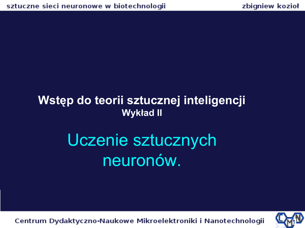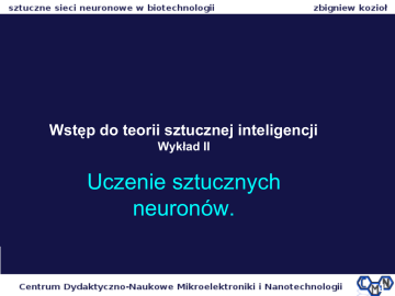 Wstęp do teorii sztucznej inteligencji Wykład II Uczenie sztucznych neuronów. 1 - powtórzyć o klasyfikacji: – – – – Sieci liniowe I nieliniowe Sieci rekurencyjne Uczenie z nauczycielem lub bez Jednowarstwowe I wielowarstwowe Podać przykład elektronicznej realizacji neuronu Podać przykład programowej(?) realizacji neuronu??? (Python?) 1 Zastosowanie sztucznych sieci neuronowych - w rozpoznawaniu dźwięków i obrazów (mowy i pisma); - do prognozowania, klasyfikacji i rozpoznawania stanów obiektów ekonomicznych; - do analizy, kojarzenia i optymalizacji w podsystemach doradczych w procesach zarządzania; - przy sterowaniu robotami; - do kompresji i kodowania danych; - do rozpoznawania obrazów; - do rozpoznawania i syntezy mowy; - prognozowanie sprzedaży, giełdy, wyścigów konnych; - interpretacja badan biologicznych i medycznych; - diagnostyka układów elektronicznych; - dobór pracowników; - selekcja celów sledztwa w kryminalistyce. 3 Neuron a jego sztuczny odpowiednik Dendryt - „wejście” neuronu. Tędy trafiają do jądra sygnały Mające być w nim później poddane obróbce. Biologiczne neurony mają ich tysiące. Synapsa - „furtka” do neuronu (poprzedza dendryt). Może ona zmienić moc sygnału napływającego poprzez dendryt. Jądro - „centrum obliczeniowe” neuronu. To tutaj zachodzą procesy kluczowe dla funkcjonowania neuronu. Wzgórek aksonu - stąd wysyłany jest sygnał wyjściowy, który wędruje dalej poprzez akson. Akson - „wyjście” neuronu. Za jego pośrednictwem neuron powiadamia świat zewnętrzny o swojej reakcji na dane wejściowe. Neuron ma tylko jeden akson. Wejścia to dendryty, lub ściślej - sygnały przez nie nadchodzące. Wagi stanowią cyfrowe odpowiedniki modyfikacji dokonywanych na sygnałach przez synapsy. Blok sumujący to odpowiednik jądra. Blok aktywacji to wzgórek aksonu. Wyjście odpowiada aksonowi. 4 Sieci neuronowe a komputery •Wiele (1011) prostych elementów przetwarzających (neuronów) • Przetwarzanie równoległe, rozłożone • Rozłożona w całej strukturze pamięć adresowana zawartością • Duża odporność na uszkodzenia •Wiele (1011) prostych elementów przetwarzających (neuronów) • Przetwarzanie równoległe, rozłożone • Rozłożona w całej strukturze pamięć adresowana zawartością • Duża odporność na uszkodzenia Podział sztucznych sieci neuronowych Sztuczne sieci neuronowe można podzielić ze względu na: - ilość warstw (tutaj nie bierze się pod uwagę warstwy wejściowej) – wyróżniamy sieci jednowarstwowe oraz sieci wielowarstwowe; -kierunek przepływu sygnałów - wyróżnić możemy sieci jednokierunkowe, w których sygnał płynie zawsze w jednym kierunku - sieci rekurencyjne, w których występują tzw. sprzężenia zwrotne. Za ich pośrednictwem sygnały mogą po przejściu danej warstwy wracać na jej wejście, zmieniając przy tym swoje wartości, co powtarza się wiele razy, aż do osiągnięcia pewnego ustalonego stanu. 7 Schemat neuronu opracowany przez McCullocha i Pittsa w 1943 roku. (sprzętowa realizacja modelu neuronu) Sprzętowa realizacja modelu neuronu. Funkcje aktywacji neuronu. Przykład funkcji aktywacyjnej Tzw. funkcja sigmoidalna, np.: 1 f ( z) = 1 + e − βz β=1 β=100 β=0.4 Schemat sieci wielowarstwowej. Wagi i wejścia jako wektory dla pojedynczego neuronu. Jeśli na wejści e rozważanego neuronu X , t.o wyjście neuronu y bęcłzie miało tyrn większą wartość, im bardziej poelany sygnał X będzie podobny do "wzorcowego" sygnału , który neuron pamięta w postaci swojego zestawu wag W Wagi i wejścia dla sieci neuronuowej: reprezentacja macierzowa Y=W*X Wzór ten ujawnia jedną z podstawowych wlasności rozważanej tu sieci neuronowej: Otóż macierz W zadaje określone odwzorowauie sygnału X w sygnal Y Na szczęśc.ie istnieje możliwość zastąpienia jednorazowego aktu zaprogmmowania sici iteracyjnym , wieloetapowym procesem jej uczenia. Aby zapewnić możliwość uczenia, trzeba wprowadzony wyżej model neuronu uzupełnić o dwa dodatkowe elementy: procesor zmiany wag i detektor błędu. Tak uzupełniony neuron nazywany bywa ADALINE (ADAptive LINear Element) δ= y – z W'=W+ηδX Metoda ADALINE; Uczenie z nauczycielem (supervised learning)