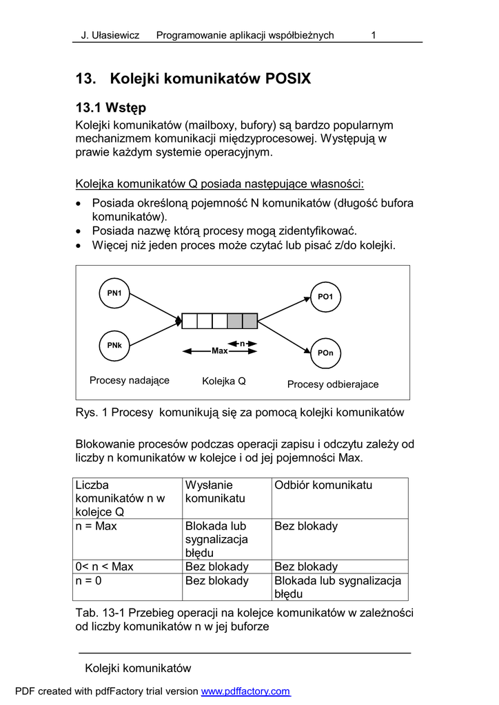 Tab. 13-1 Przebieg operacji na kolejce komunikatów w zależności