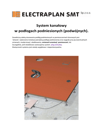 System kanałowy w podłogach podniesionych (podwójnych). Zasadniczą zaletą stosowania podłóg podniesionych w pomieszczeniach biurowych jest łatwość wykonania instalacji pod płytą podłogi podniesionej oraz wygoda przy jej ewentualnych zmianach, modernizacji okablowania, zmianach aranżacji pomieszczeń, itd. Szczególnie, jeśli dodatkowo zastosujemy system plug and play. Elastyczność systemu jest wtedy wyjątkowa i nieporównywalna. 1. Cechy systemu podłogowego. - b. łatwy i oszczędny czasowo montaż instalacji, - przejrzystość wykonanych w podłodze instalacji, - łatwość rozdziału słabych od silnych prądów, - stosując dodatkowo system „plug and play” zwiększa się łatwość zmian i przełączeń, - stosując punkty zbiorcze pod płytą (w systemie określane jako „ rozdzielacze płaskie” albo punkty konsolidacji), osiągamy dodatkowo podział instalacji; system staje się przez to decentralny, elastyczny, dowolnie kombinowany, (w rozdzielaczach maks. 12 gniazd na wyjściu), - dodatkowo można stosować przygotowane (konfekcjonowane) puszki montażowe z zamontowanymi uprzednio gniazdami, - pod płytą podłogi podniesionej stosowane są ponadto koryta kablowe - blaszane lub siatkowe. 2. Zastosowanie podłóg podniesionych. Podłogi podniesione (podwójne) przeznaczone są głównie do dużych, otwartych przestrzeni biurowych, call center; do dużych powierzchni biurowych z nagromadzeniem komputerów (duże ilości kabli!) oraz konieczności wykonywania częstych zmian instalacji, przełączeń itd. Ponadto do serwerowni itp., z wymogiem b. elastycznych instalacji (również tu mamy ogromne ilości kabli i przewodów pod płytą podłogi). Ponadto do sal wystawowych lub targowych, z koniecznością łatwych zmian w instalacjach, zmian aranżacji pomieszczeń lub powierzchni, każdorazowo wg życzenia kolejnego Najemcy. 3. Wkłady (pokrywy uchylne) w podłogach podniesionych. W wycięte uprzednio otwory w płycie podłogi podniesionej montowane są właściwe (pasujące do otworów) wkłady, czyli pokrywy uchylne standardowe lub pokrywy nowej serii. Dla wyprowadzenia wyłącznie kabelków spod płyty, w otworach płyty montowane są okrągłe przepusty kablowe (oznaczenie: LAFK, LARK itd.). 3.1. Pokrywy standardowe. W zależności od rodzaju płyty podłogi oraz jej grubości , mamy do dyspozycji następujące wykonania pokryw uchylnych standardowych: - KD0 – dla podłóg z płyt mineralnych, gotowych lub lanych na budowie, - KD2 – dla płyt drewnopodobnych o grubości: 15 – 35 mm, - KD3 – dla płyt drewnopodobnych o grubości: 35 – 50 mm. Chodzi przy tym wyłącznie o wyposażenie pokryw uchylnych w odpowiednie do rodzaju i grubości płyty zaciski mocujące. Zacisk metalowy (pazur) - dla wkładów w wykonaniu KD0. Zacisk z pcv - dla wkładów w wykonaniach KD2 i KD3 (różnica w wysokości dolnej części zacisku). Uwaga: pokrywy uchylne w wyk. KD0, KD2 i KD3 różnią się tylko zaciskami mocującymi. Są to praktycznie te same pokrywy. 3.2. Pokrywy nowej serii. Dla pokryw nowej serii nie trzeba pamiętać o doborze odpowiedniego wykonania, w zależności od rodzaju i grubości płyty podłogi podniesionej. Nie ma tu zatem wykonań pokryw KD0, KD2 czy KD3. Pokrywy nowej serii mają jeden uniwersalny, metalowy zestaw zacisków. W zależności od potrzeb – jest tylko odmiennie ustawiany. Powyżej pokazano ustawienie zacisków mocujących w pokrywach nowej serii; z lewej odpowiednik KD0 (lana podłoga mineralna) , a z prawej KD2 lub KD3 (płyta drewnopodobna). 4. Okrągłe przepusty podłogowe. 4.1. Przepusty montowane w płytach podłóg podniesionych grubych, o grubości > 20 mm. Do suchych pomieszczeń. Przepust z poliamidu (bezhalogenowego) , z ramką dociskającą wykładziny, przygotowany do montażu w podłogach podniesionych. Wypust na kabelki 2 – częściowy, uchylny, z zabezpieczeniem wypustu gumową pianką. Dekielek obrotowy, łatwo zdejmowalny (np. na czas wykonywania okablowania). Do wypustu można systemowo dołączyć wąż kablowy FK, płaski, prowadzony po podłodze. Średnica przepustu LAFK : Ø 132 mm. Otwór pod montaż przepustu: Ø 112 mm. Min. zagłębienie: 55 mm; ale zakres zaciskania musi wynosić min. 20 mm. Oznaczenia przepustów: LAFK G20 7011, kolor szary, otwór w płycie: Ø 112 mm, nr katalog. 800 840 001 LAFK G20 9005, kolor czarny, otwór w płycie: Ø 112 mm, nr katalog. 800 840 009. 4.2. Przepusty montowane w płytach podłóg podniesionych o grubości > 20 mm. Do suchych pomieszczeń. Otwarte, bez dekielka. Przepust z poliamidu, z ramką dociskającą wykładziny, przygotowany do montażu w podłogach podniesionych. Poprzeczka (przegroda) - łatwo wyjmowana (np. na czas wykonywania okablowania). Do przegrody można systemowo dołączyć wąż kablowy RK, okrągły, prowadzony pionowo, z podłogi na biurko. Średnica przepustu: Ø 132 mm. Otwór w płycie pod przepust: Ø 112 mm. Min. zagłębienie: 55 mm; zakres zaciskania musi wynosić min. 20 mm. Oznaczenia: LARK G20 7011, kolor szary, Ø 112 mm, nr katalog. 800 840 101 LARK G20 9005, kolor czarny, Ø 112 mm, nr katalog. 800 840 109. 4.3. Przepusty do podłogi czyszczonej na mokro. Grubość płyty >20 mm. Przepust z poliamidu, z ramką dociskającą wykładziny, przygotowany do montażu w podłogach podniesionych. W stanie nieużywanym przepust jest zrównany z powierzchnią podłogi podniesionej (nie wystaje ponad poziom podłogi). Wystający tubus zapobiega przedostaniu się wody do przepustu. Przewody można wyprowadzić przez przepust w 4 dowolne kierunki. Średnica przepustu: Ø 132 mm. Otwór w płycie pod przepust: Ø 112 mm. Min. zagłębienie: 55 mm; zakres zaciskania musi wynosić min. 20 mm. Oznaczenia przepustów: LATU G20 7011, kolor szary, otwór pod przepust: Ø 112 mm, nr katalog. 800 840 201 LATU G20 9005, kolor czarny, „ „ Ø 112 mm, nr katalog. 800 840 209. Poniżej wskazówki montażowe przepustu LATU. 4.4. Przepust ślepy (