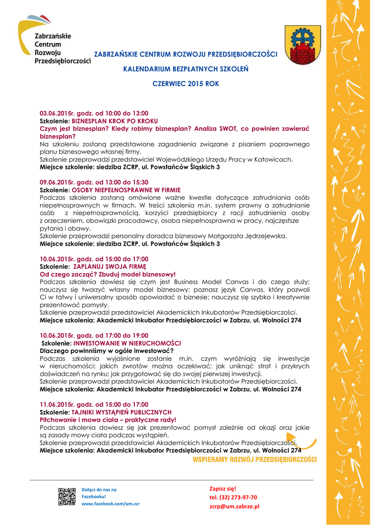 ZABRZAŃSKIE CENTRUM ROZWOJU PRZEDSIĘBIORCZOŚCI KALENDARIUM BEZPŁATNYCH SZKOLEŃ CZERWIEC 2015 ROK 03.06.2015r. godz. od 10:00 do 13:00 Szkolenie: BIZNESPLAN KROK PO KROKU Czym jest biznesplan? Kiedy robimy biznesplan? Analiza SWOT, co powinien zawierać biznesplan? Na szkoleniu zostaną przedstawione zagadnienia związane z pisaniem poprawnego planu biznesowego własnej firmy. Szkolenie przeprowadzi przedstawiciel Wojewódzkiego Urzędu Pracy w Katowicach. Miejsce szkolenie: siedziba ZCRP, ul. Powstańców Śląskich 3 09.06.2015r. godz. od 13:00 do 15:30 Szkolenie: OSOBY NIEPEŁNOSPRAWNE W FIRMIE Podczas szkolenia zostaną omówione ważne kwestie dotyczące zatrudniania osób niepełnosprawnych w firmach. W treści szkolenia m.in. system prawny a zatrudnianie osób z niepełnosprawnością, korzyści przedsiębiorcy z racji zatrudnienia osoby z orzeczeniem, obowiązki pracodawcy, osoba niepełnosprawna w pracy, najczęstsze pytania i obawy. Szkolenie przeprowadzi personalny doradca biznesowy Małgorzata Jędrzejewska. Miejsce szkolenie: siedziba ZCRP, ul. Powstańców Śląskich 3 10.06.2015r. godz. od 15:00 do 17:00 Szkolenie: ZAPLANUJ SWOJA FIRMĘ Od czego zacząć? Zbuduj model biznesowy! Podczas szkolenia dowiesz się czym jest Business Model Canvas i do czego służy; nauczysz się tworzyć własny model biznesowy; poznasz język Canvas, który pozwoli Ci w łatwy i uniwersalny sposób opowiadać o biznesie; nauczysz się szybko i kreatywnie prezentować pomysły. Szkolenie przeprowadzi przedstawiciel Akademickich Inkubatorów Przedsiębiorczości. Miejsce szkolenia: Akademicki Inkubator Przedsiębiorczości w Zabrzu, ul. Wolności 274 10.06.2015r. godz. od 17:00 do 19:00 Szkolenie: INWESTOWANIE W NIERUCHOMOŚCI Dlaczego powinniśmy w ogóle inwestować? Podczas szkolenia wyjaśnione zostanie m.in. czym wyróżniają się inwestycje w nieruchomości; jakich zwrotów można oczekiwać; jak uniknąć strat i przykrych doświadczeń na rynku; jak przygotować się do swojej pierwszej inwestycji. Szkolenie przeprowadzi przedstawiciel Akademickich Inkubatorów Przedsiębiorczości. Miejsce szkolenia: Akademicki Inkubator Przedsiębiorczości w Zabrzu, ul. Wolności 274 11.06.2015r. godz. od 15:00 do 17:00 Szkolenie: TAJNIKI WYSTĄPIEŃ PUBLICZNYCH Pitchowanie i mowa ciała – praktyczne rady! Podczas szkolenia dowiesz się jak prezentować pomysł zależnie od okazji oraz jakie są zasady mowy ciała podczas wystąpień. Szkolenie przeprowadzi przedstawiciel Akademickich Inkubatorów Przedsiębiorczości. Miejsce szkolenia: Akademicki Inkubator Przedsiębiorczości w Zabrzu, ul. Wolności 274 Dołącz do nas na Facebooku! www.facebook.com/um.zcr Zapisz się! tel. (32) 273-97-70 [email protected] 11.06.2015r. godz. 17:00 Szkolenie: STARTUP CHILLOUT Swobodne, otwarte spotkanie w celu nawiązaniu kontaktów biznesowych. Miejsce spotkania: Akademicki Inkubator Przedsiębiorczości w Zabrzu, ul. Wolności 274 12.06.2015r. godz. od 10:00 do 13:00 Szkolenie: SAMOZATRUDNIENIE KROK PO KROKU Uczestnicy szkolenia otrzymają wiedzę jak krok po kroku należy przygotować się do rozpoczęcia działalności gospodarczej. Jakie niezbędne dokumenty należy złożyć, jakie są możliwe formy opodatkowania działalności gospodarczej oraz wiele innych niezbędnych informacji. Szkolenie przeprowadzi przedstawiciel Wojewódzkiego Urzędu Pracy w Katowicach Miejsce szkolenia: siedziba ZCRP, ul. Powstańców Śląskich 3 15.06.2015r. godz. od 8:30 do 14:30 KONSULTACJE NT. WSPARCIA ZE ŚRODKÓW UNII EUROPEJSKIEJ MOBILNY PUNKT INFORMACYJNY W ZABRZU Mobilne Punkty Informacyjne to nowa usługa dostępna dla mieszkańców regionu oferowana przez pracowników Punktu Informacyjnego Funduszy Europejskich w Katowicach. Konsultanci będą udzielać bezpłatnych konsultacji w zakresie możliwości uzyskania wsparcia ze środków Unii Europejskiej w nowej perspektywie finansowej 2014 – 2020. Miejsce konsultacji: siedziba ZCRP, ul. Powstańców Śląskich 3 19.06.2015r. godz. od 10:00 do 13:00 Szkolenie: BIZNESPLAN KROK PO KROKU Czym jest biznesplan? Kiedy robimy biznesplan? Analiza SWOT, co powinien zawierać biznesplan? Na szkoleniu zostaną przedstawione zagadnienia związane z pisaniem poprawnego planu biznesowego własnej firmy. Szkolenie przeprowadzi przedstawiciel Wojewódzkiego Urzędu Pracy w Katowicach. Miejsce szkolenie: siedziba ZCRP, ul. Powstańców Śląskich 3 29.06.2015r. godz. od 9:00 do 12:00 Szkolenie: HORYZONT 2020 Horyzont 2020 to największy w historii program finansowania badań naukowych i innowacji w Unii Europejskiej. Jego budżet w latach 2014-2020 wynosi prawie 80 mld euro. Chodzi o stworzenie spójnego systemu finansowania innowacji: od koncepcji naukowej, poprzez etap badań, aż po wdrożenie nowych rozwiązań, produktów czy technologii. Szkolenie przeprowadzi przedstawiciel Górnośląskiej Agencji Promocji Przedsiębiorczości. Miejsce konsultacji: siedziba ZCRP, ul. Powstańców Śląskich 3 ZAPISZ SIĘ! ZADZWOO: (32) 273-97-70, NAPISZ: [email protected] SERDECZNIE ZAPRASZAMY WSZYSTKICH PRZEDSIĘBIORCÓW DO SKORZYSTANIA Z BEZPŁATNYCH PORAD PRAWNYCH Z ZAKRESU PROWADZENIA DZIAŁALNOŚCI GOSPODARCZEJ. Godziny konsultacji: Poniedziałek 14:00 – 17:00 Piątek 7:30 – 10:30 Prosimy o wcześniejszą rejestrację telefoniczną (32) 273-97-70