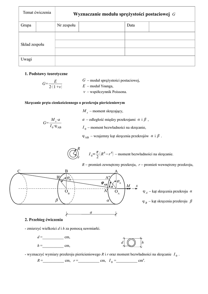 Temat ćwiczenia Grupa Wyznaczanie modułu sprężystości postaciowej G Nr zespołu Data Skład zespołu Uwagi 1. Podstawy teoretyczne G= G − moduł sprężystości postaciowej, E − moduł Younga, ν − współczynnik Poissona. E 2⋅( 1 +ν ) Skręcanie pręta cienkościennego o przekroju pierścieniowym M s − moment skręcający, G= a − odległość między przekrojami α i β , M s⋅a I 0⋅ϕAB I 0 − moment bezwładności na skręcanie, ϕAB − wzajemny kąt skręcenia przekrojów α i β . R r π I 0= ( R 4 −r 4 ) − moment bezwładności na skręcanie. 2 R − promień zewnętrzny przekroju, r − promień wewnętrzny przekroju, C B' B ϕB A A'' ϕ AB A' OB β ϕA Ms OA α x ϕ A − kąt skręcenia przekroju α ϕ B − kąt skręcenia przekroju β a 2. Przebieg ćwiczenia - zmierzyć wielkości d i h za pomocą suwmiarki. d =___________ cm, h =___________ cm, d h - wyznaczyć wymiary przekroju pierścieniowego R i r oraz moment bezwładności na skręcanie I 0 . R =___________ cm, r =___________ cm, I 0 =___________ cm4. - zmierzyć odległości przyrządów laserowych od ekranów l A i l B oraz wielkości a i b. b l A =___________ cm, ϕ (ϕ ) A i A l B =___________ cm, B A a =___________ cm, b =___________ cm. β a B i A (B) B i si (s ) Ms α lA (lB) A B A P B - wykonać odczyty na ekranach dla pręta nieobciążonego s0 i s0 i po przyłożeniu obciążenia si i si oraz obliczyć wielkości przedstawione w tabeli. 3. Wyniki ćwiczenia Przyjąć E = 205 GPa i ν = 0,3 , obliczyć moduł sprężystości postaciowej G i porównać z wartością średnią modułu uzyskaną z doświadczenia. P M s = ⋅b 2 [kG] 1 kG=9,81 N [kN·cm] P̃ 0 Przekrój α P [kN] 0 siA [cm] A Δsi = A A ∣s i − s 0 ∣ [cm] Przekrój β ϕiA = ΔsiA lA [rad] sBi [cm] B Δsi B B = ∣s i − s 0 ∣ [cm] ϕiB = ΔsiB lB [rad] 0 G= E = ___________ GPa 2⋅( 1 +ν ) G sr =___________ GPa ϕi AB = ϕiA −ϕiB G G [rad] [kN/cm2] [GPa]