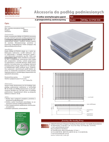 Akcesoria do podłóg podniesionych www.lukasiak.com.pl Kratka wentylacyjna ppoż z przepustnicą samoczynną Typ: Model: WKWp-321PSK E30 Opis: Wymiary: Max. wymiary zewnętrzne kratki: Długość:600mm Szerokość:600mm Zastosowanie: Kratka wentylacyjna WKWp-321PSK E30 stosowana jest jako element systemów podłóg podniesionych o wymaganej odporności ogniowej REI 30 w pomieszczeniach dużych i średnich centrów danych do wymiany klimatyzowanego powietrza w przestrzeni podpodłogowej. Kratka zastępuje całą płytę podłogi podniesionej. Specyfikacja: Kratka WKWp-321PSK E30 składa się z ramki stabilizacyjnej wykonanej z profili stalowych, rusztu wykonanego z trwałego aluminium (ramka i ruszt lakierowane proszkowo wg RAL 7004) oraz przepustnicy ppoż. Kratka dodatkowo zaopatrzona jest w przepustnicę samoczynną, która działa jako przepustnica zwrotna. Lamele przepustnicy są wyposażone w uszczelki tłumiące, dzięki czemu podczas normalnej pracy nie występuje zderzenie krawędzi jednej z drugą. Dzięki temu nie wzbudzają dodatkowego hałasu podczas pracy. Przepustnica wykonana z aluminiowych profili (lekkie, odporne na środowisko zewnętrzne). Kratka posiada regulację poziomu umożliwiającą dopasowanie do sąsiednich elementów. Zalety: 1. Bardzo duża wydajność przepływu powietrza z przestrzeni podpodłogowej; 2. Solidny system konstrukcji pozwalający na zachowanie nośności podłogi podniesionej; 3. Pełne bezpieczeństwo użytkowania, ochrona przeciw pożarowa; 4. Estetyka wykonania, uniwersalność. 600 ruszt kratki 600 ~300 28-40 Właściwości: System kratek dostosowany jest do każdego typu podłogi podniesionej wykonanej w technologii REI 30. Kratki serii WKWp dostosowane są do przenoszenia obciążeń do 5 kN (tyle samo co podłoga podniesiona). Uzupełnieniem oferty są przepusty kablowe w klasie E / EI 30. rysunek schematyczny Powierzchnia czynna: F=0,234m2 Średnia wydajność (przy V=2,5 m/s): Q = 1530 m3/h przepustnica ppoż. przepustnica samoczynna Jesteśmy dla każdej firmy Zakład Produkcyjno-Usługowo-Handlowy Paweł Łukasiak i S-ka Spółka Komandytowa 05-820 Piastów; ul. Niecała 7; tel : 0-22 723 74 82, 723 74 83, fax : 723 49 93; e-mail: [email protected] Biuro Projektowo-Handlowe 02-320 Warszawa, Aleje Jerozolimskie 157 lok. 3 tel: 0-22 668 99 00, 668 95 05, 668 95 30, fax : 0-22 668 96 06; e-mail: [email protected] w w w.luk asiak .com.pl