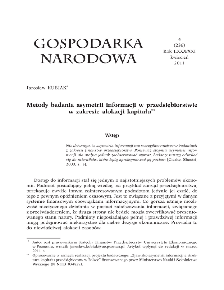 GOSPODARKA NARODOWA 4 (236) Rok LXXX/XXI kwiecień 2011 Jarosław KUBIAK* Metody badania asymetrii informacji w przedsiębiorstwie w zakresie alokacji kapitału** Wstęp Nic dziwnego, że asymetria informacji ma szczególne miejsce w badaniach z zakresu finansów przedsiębiorstw. Ponieważ stopnia asymetrii informacji nie można jednak zaobserwować wprost, badacze muszą odwołać się do mierników, które będą aproksymować jej poziom [Clarke, Shastri, 2000, s. 3]. Dostęp do informacji stał się jednym z najistotniejszych problemów ekonomii. Podmiot posiadający pełną wiedzę, na przykład zarząd przedsiębiorstwa, przekazuje zwykle innym zainteresowanym podmiotom jedynie jej część, do tego z pewnym opóźnieniem czasowym. Jest to związane z przyjętymi w danym systemie finansowym obowiązkami informacyjnymi. Co gorsza istnieje możliwość nieetycznego działania w postaci zafałszowania informacji, związanego z przeświadczeniem, że druga strona nie będzie mogła zweryfikować prezentowanego stanu natury. Podmioty nieposiadające pełnej i prawdziwej informacji mogą podejmować niekorzystne dla siebie decyzje ekonomiczne. Prowadzi to do niewłaściwej alokacji zasobów. * Autor jest pracownikiem Katedry Finansów Przedsiębiorstw Uniwersytetu Ekonomicznego w Poznaniu, e-mail: [email protected]. Artykuł wpłynął do redakcji w marcu 2011 r. ** Opracowanie w ramach realizacji projektu badawczego: „Zjawisko asymetrii informacji a struktura kapitału przedsiębiorstw w Polsce” finansowanego przez Ministerstwo Nauki i Szkolnictwa Wyższego (N N113 034837). 46 GOSPODARKA NARODOWA Nr 4/2011 W związku z szybkim rozwojem technologii informacyjnej, m.in. Internetu, następuje proces nazywany demokratyzacją informacji [Schmidt, 2006]. Coraz więcej ludzi ma szeroki dostęp do informacji umożliwiający poszerzenie zakresu wiedzy. Szybkość wymiany informacji za pomocą techniki cyfrowej umożliwia lepszą kontrolę realizacji obietnic zapisanych w zawieranych na rynku kontraktach. Pomaga to także w odróżnianiu dobrych od złych produktów. Można wyrazić nadzieję, że dalszy rozwój technologii informacyjnej przyczyni się do redukcji asymetrii informacji, także pomiędzy interesariuszami przedsiębiorstwa. Przedsiębiorstwo jako podmiot rynkowy jest narażone na negatywne skutki asymetrii informacji. W wielu sytuacjach asymetria informacyjna może być blokadą w zawarciu obustronnie korzystnego kontraktu, gdyż prowadzi albo do oszustwa (pokusa nadużycia) albo do rezygnacji z transakcji przez tę stronę, która czuje się niedoinformowana (negatywna selekcja). Przedsiębiorstwo podejmując działania zmierzające do minimalizacji tych skutków ponosi dodatkowe koszty transakcyjne. Jedną z form ograniczania negatywnych skutków asymetrii informacji jest odpowiednie kształtowanie struktury kapitału. Celem artykułu jest przedstawienie i ocena metod badania poziomu asymetrii informacji, które mogą zostać zastosowane w ramach badań prowadzących do określenia przyczyn kształtowania struktury kapitału przez przedsiębiorstwa. Zdecydowana większość opracowań w zakresie struktury kapitału dotyczy dużych przedsiębiorstw, których akcje notowane są na giełdzie. Bardzo rzadko jest analizowana struktura kapitału przedsiębiorstw pozagiełdowych, często o mniejszej skali działania. Tymczasem podmioty te stanowią ogromną większość ogółu. Co więcej, cechują się z pewnością większą asymetrią informacji niż podmioty giełdowe, ze względu na ograniczony zakres obowiązków informacyjnych. Ważne jest zatem podjęcie próby przeprowadzenia badań nad strukturą kapitału także spółek nienotowanych na giełdzie i uwzględnienia w ramach tych badań poziomu asymetrii informacji pomiędzy inwestorami wewnętrznymi i zewnętrznymi w tych przedsiębiorstwach. Z drugiej jednak strony istnieje problem, jak zmierzyć asymetrię informacji w przedsiębiorstwach nienotowanych na giełdzie papierów wartościowych? Problem dokonania takiego pomiaru z pewnością jest jedną z przyczyn istnienia w literaturze przedmiotu luki w zakresie badania wpływu asymetrii informacji na kształtowanie struktury kapitału przedsiębiorstw, a w szczególności tych, których akcje nie są przedmiotem publicznego obrotu. Badaniami takimi bardzo trudno jednak objąć przedsiębiorstwa nie sporządzające sprawozdań finansowych, ze względu na problem z pozyskaniem pełnych i wiarygodnych danych, zarówno do określenia struktury kapitału, jaki i aproksymacji poziomu asymetrii informacji w tych przedsiębiorstwach. Prezentowane w artykule propozycje pomiaru asymetrii informacji będą zatem ograniczyały się do przedsiębiorstw prowadzących księgi rachunkowe. Jarosław Kubiak, Metody badania asymetrii informacji w przedsiębiorstwie... 47 Istota zjawiska asymetrii informacji Zjawisko asymetrii informacji to sytuacja, kiedy ludzie dysponują o sobie samych wiedzą, która nie jest łatwo dostępna dla innych [Begg, Fischer, Dornbusch, 2007, s. 345]. W ekonomii sytuację taką odnosi się do odmiennego zakresu wiedzy stron o jakiejś transakcji. Stronę, która posiada wszystkie dostępne informacje (pełną wiedzę), jest lepiej poinformowana określa się jako agenta. Strona nieposiadająca pełni informacji to mocodawca. Podstawy analizy zjawiska asymetrii informacji stworzyli Akerlof, Spence i Stiglitz, którym w 2001 r. za te dokonania przyznano w dziedzinie ekonomii Nagrodę Nobla. Wspomniani naukowcy stworzyli fundamenty ogólnej teorii rynków cechujących się asymetrią informacji. Doszli do wniosku, że niewielkie nawet odchylenia od racjonalności na poziomie mikrozachowań powodują istotne odchylenia makroekonomiczne. Gospodarka osiąga wówczas równowagę poniżej optymalnego wykorzystania zasobów. Akerlof zbudował jeden z pierwszych formalnych modeli negatywnej selekcji, która występuje w przypadku asymetrii informacji między uczestnikami