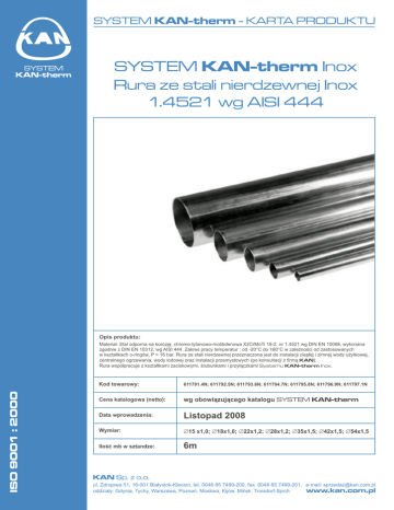 SYSTEM KAN-therm - KARTA PRODUKTU SYSTEM KAN-therm Inox Rura ze stali nierdzewnej Inox 1.4521 wg AISI 444 Opis produktu: ISO 9001 : 2000 Materiał: Stal odporna na korozję, chromo-tytanowo-molibdenowa X2CrMoTi 18-2, nr 1.4521 wg DIN EN 10088, wykonana zgodnie z DIN EN 10312, wg AISI 444. Zakres pracy temperatur : od -20° C do 180° C w zależności od zastosowanych w kształtkach o-ringów, P = 16 bar. Rura ze stali nierdzewnej przeznaczona jest do instalacji ciepłej i zimnej wody użytkowej, centralnego ogrzewania, wody lodowej oraz instalacji przemysłowych (po konsultacji z firmą KAN). Rura współpracuje z kształtkami zaciskowymi, śrubunkami i przyłączkami Systemu KAN-therm Inox. Kod towarowy: 611791.4N; 611792.5N; 611793.6N; 611794.7N; 611795.8N; 611796.9N; 611797.1N Cena katalogowa (netto): wg obowiązującego katalogu SYSTEM KAN-therm Data wprowadzenia: Listopad 2008 Wymiar: Æ 15 x1,0; Æ 18x1,0; Æ 22x1,2; Æ 28x1,2; Æ 35x1,5; Æ 42x1,5; Æ 54x1,5 Ilość mb w sztandze: 6m KAN Sp. z o.o. ul. Zdrojowa 51, 16-001 Białystok-Kleosin, tel. 0048 85 7499-200, fax. 0048 85 7499-201, e-mail: [email protected] www.kan.com.pl oddziały: Gdynia, Tychy, Warszawa, Poznań, Moskwa, Kijów, Mińsk, Troisdorf-Spich