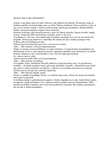 DUSZA NIE LUBI CIEMNOSCI Jestem, a tak jakby mnie nie było. Mówię, a tak jakbym nie mówiła. Wstawiam wodę na herbatę zupełnie nie kontrolując tego, co robię. Marzę o herbacie. Samo myślenie o tym, że już za trzy minuty usiądę w fotelu, podwinę nogi, przykryję się pledem i obejmę dłońmi kubek z gorącym napojem, napawa mnie rozkoszą. Rozkosz wzrośnie, gdy pomyślę jeszcze o tym ,że włączę muzykę. Zgaszę światło, zapalę świece. I będę tak sobie siedziała po cichutko, sama, w tej ciszy. Uwielbiam to. Ten stan. Oszczędnie piję tę herbatę, uważając przy tym by nie uronić ani kropelki. Dzisiaj jest miętowa z czekoladą. Bo skończyła się o smaku grzanego wina. O Boże, jak ja uwielbiam ten stan. Żebym jeszcze można było przy tym o niczym nie myśleć. Albo… albo chociaż o niczym nieprzyjemnym. Nigdy wcześniej nie pomyślałabym, że takie siedzenie w ciemnościach, przyglądanie się płomieniom świec w rytm płynącej muzyki i popijanie herbatki może dostarczyć mi takich doznań. Orgazm to nic w porównaniu z tym. Nic nie odda tego nastroju. Ja - sam na sam ze sobą. Żebym jeszcze miała sobie coś do powiedzenia. Albo… albo chociaż coś miłego. Coś upadło. Ostry, metaliczny dźwięk zakłócił tę moją prywatną ciszę. Tę psychiczną „ izolatkę” , do której uciekam wtedy, gdy moje skołatane, oszalałe , zdezorientowane myśli nie są już w stanie usiedzieć na miejscu, w głowie i za wszelką cenę chcą się wydostać. Żebym jeszcze chciały się wydostać naprawdę. Albo… albo chociaż chciały zostać. Wiem, co upadło na podłogę. Wiem, co rozdarło moją ciszę. Nawet nie muszę się schylać, żeby mieć tę pewność. Uwielbiam siadać z podwiniętymi nogami w fotelu. Zapadać się w nim. Jeden łokieć oparty na oparciu , drugi na kolanie. Ten z oparcia ułożył się jakoś inaczej. Nienaturalnie. Dłoń puściła już kubek z herbatą. Ale to nie było gwałtowne rozstanie. Bez żadnej szamotaniny, bez łez jak w kłótni kochanków.