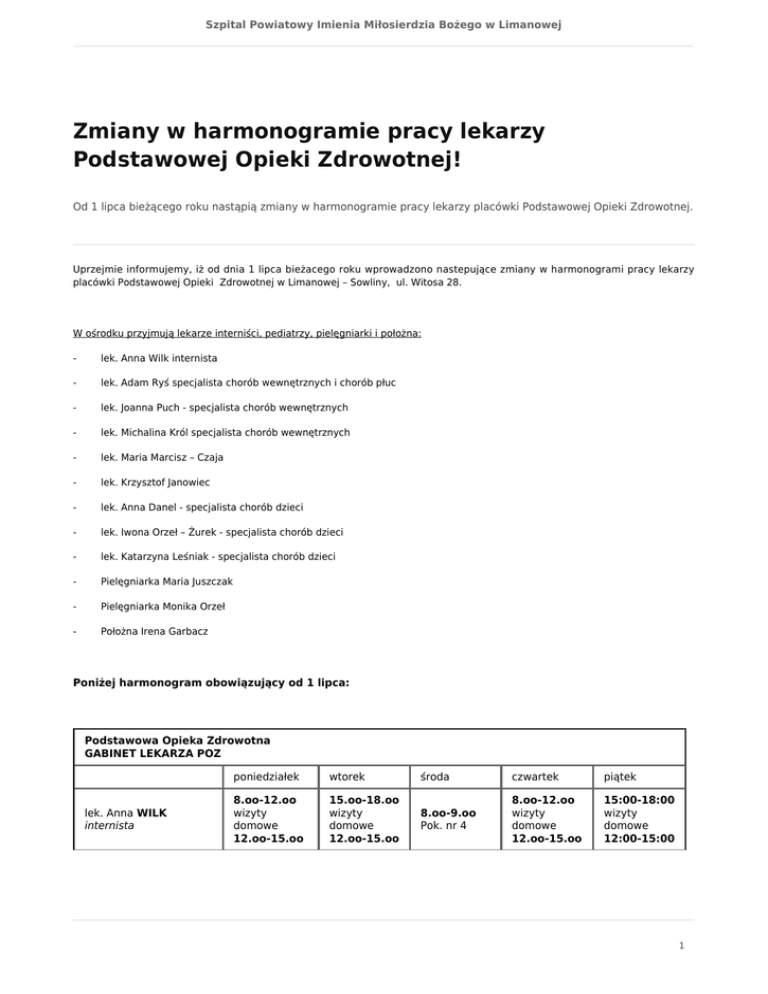 Szpital Powiatowy Imienia Miłosierdzia Bożego w Limanowej Zmiany w harmonogramie pracy lekarzy Podstawowej Opieki Zdrowotnej! Od 1 lipca bieżącego roku nastąpią zmiany w harmonogramie pracy lekarzy placówki Podstawowej Opieki Zdrowotnej. Uprzejmie informujemy, iż od dnia 1 lipca bieżacego roku wprowadzono nastepujące zmiany w harmonogrami pracy lekarzy placówki Podstawowej Opieki Zdrowotnej w Limanowej – Sowliny, ul. Witosa 28. W ośrodku przyjmują lekarze interniści, pediatrzy, pielęgniarki i położna: - lek. Anna Wilk internista - lek. Adam Ryś specjalista chorób wewnętrznych i chorób płuc - lek. Joanna Puch - specjalista chorób wewnętrznych - lek. Michalina Król specjalista chorób wewnętrznych - lek. Maria Marcisz – Czaja - lek. Krzysztof Janowiec - lek. Anna Danel - specjalista chorób dzieci - lek. Iwona Orzeł – Żurek - specjalista chorób dzieci - lek. Katarzyna Leśniak - specjalista chorób dzieci - Pielęgniarka Maria Juszczak - Pielęgniarka Monika Orzeł - Położna Irena Garbacz Poniżej harmonogram obowiązujący od 1 lipca: Podstawowa Opieka Zdrowotna GABINET LEKARZA POZ lek. Anna WILK internista poniedziałek wtorek środa czwartek piątek 8.oo-12.oo wizyty domowe 12.oo-15.oo 15.oo-18.oo wizyty domowe 12.oo-15.oo 8.oo-9.oo Pok. nr 4 8.oo-12.oo wizyty domowe 12.oo-15.oo 15:00-18:00 wizyty domowe 12:00-15:00 1 Szpital Powiatowy Imienia Miłosierdzia Bożego w Limanowej lek. Michalina KRÓL specjalista chorób wewnętrznych lek. Krzysztof JANOWIEC lek. Maria MARCISZ-CZAJA lek. Joanna PUCH specjalista chorób wewnętrznych lek. Adam RYŚ specjalista chorób wewnętrznych i chorób płuc … … … … … 8.oo-11.oo wizyty domowe 11.oo-12.oo … … … … 8.oo-14.oo wizyty domowe 14.oo-15.oo … … … 15.oo-17.oo wizyty domowe 17.oo-18.oo … … … 15:00-17:00 wizyty domowe 17:00-18:00 … … 12.oo-14.oo wizyty domowe 14.oo-15.oo … … … Harmonogram pracy lekarzy pediatrów oraz pielęgniarki i położnej nie ulega zmianie. Rejestracja do lekarzy prowadzona jest w godzinach pracy placówki POZ. Formy rejestracji: ● ● ● rejestracja osobista rejestracja przez osoby trzecie rejestracja telefoniczna pod numerem telefonu 18 33 71 722 Podczas rejestracji oraz na każdym etapie postępowania medycznego osoby głuche i niedosłyszące mogą korzystac z pomocy osób trzecich wskazanych przez siebie. Dyrekcja Szpitala Powiatowego w Limanowej Imienia Miłosierdzia Bożego zaprasza do składania deklaracji do placówki Podstawowej Opieki Zdrowotnej w Limanowej – Sowliny, ul. Witosa 28. Poniżej wzory deklaracji wyboru świadczeniodawcy: ● ● ● Deklaracja wyboru świadczeniodawcy udzielającego świadczeń z zakresu podstawowej opieki zdrowotnej oraz lekarza podstawowej opieki zdrowotnej Deklaracja wyboru świadczeniodawcy udzielającego świadczeń z zakresu podstawowej opieki zdrowotnej oraz pielęgniarki podstawowej opieki zdrowotnej Deklaracja wyboru świadczeniodawcy udzielającego świadczeń z zakresu podstawowej opieki zdrowotnej oraz położnej 2 Szpital Powiatowy Imienia Miłosierdzia Bożego w Limanowej podstawowej opieki zdrowotnej Przypominamy, że Ubezpieczony ma prawo wyboru (zmiany) lekarza, pielęgniarki, położnej POZ nie częściej niż trzy razy w roku. W przypadku, gdy pacjent po raz czwarty w danym roku kalendarzowym zmienia lekarza POZ, pielęgniarkę POZ lub położną POZ - wówczas jest zobowiązany do wniesienia na rachunek Oddziału Funduszu opłaty w wysokości 80 zł. Zmieniając lekarza, pielęgniarkę, położną POZ, należy pamiętać o przekazaniu swojej dokumentacji medycznej nowemu świadczeniodawcy. Poprzedni świadczeniodawca jest zobowiązany do wydania na wniosek ubezpieczonego kopii lub odpisów dokumentacji medycznej dotyczącej ubezpieczonego. Koszty wykonania kserokopii lub odpisu ponosi wnioskujący, w tym przypadku pacjent. ZAPRASZAMY!!! 3