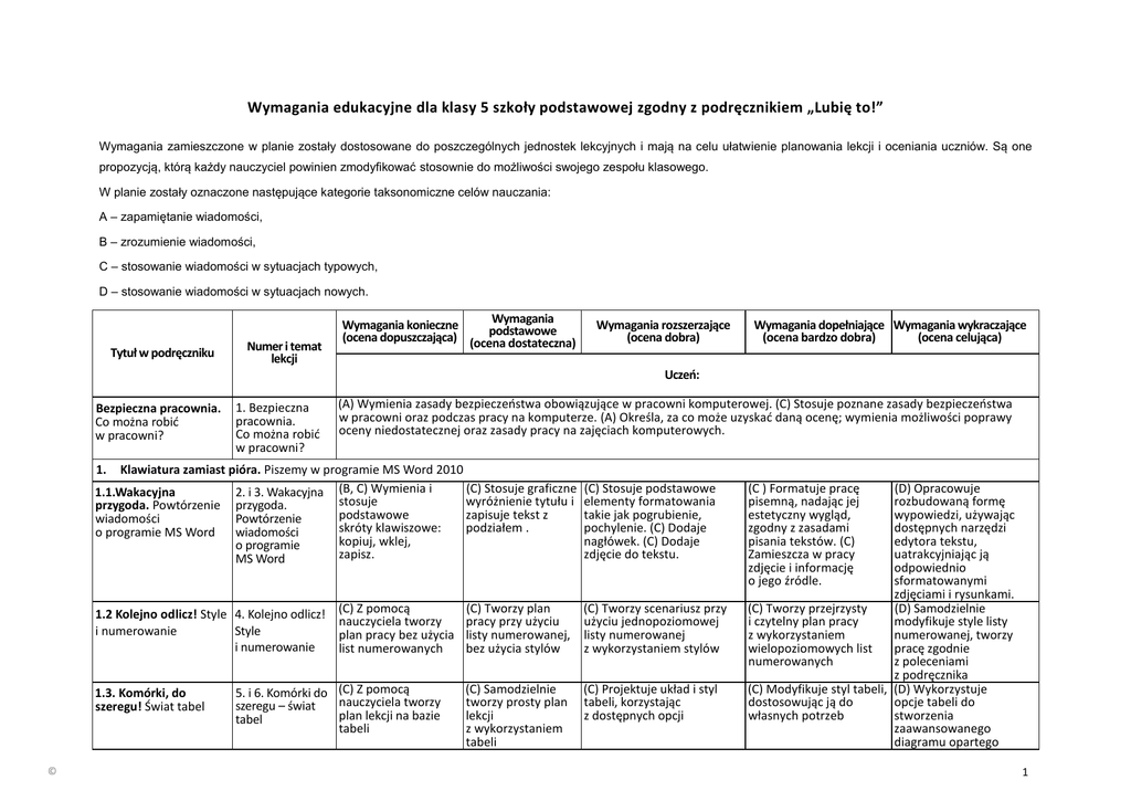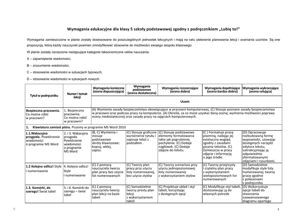 Wymagania edukacyjne dla klasy 5 szkoły podstawowej zgodny z podręcznikiem „Lubię to!” Wymagania zamieszczone w planie zostały dostosowane do poszczególnych jednostek lekcyjnych i mają na celu ułatwienie planowania lekcji i oceniania uczniów. Są one propozycją, którą każdy nauczyciel powinien zmodyfikować stosownie do możliwości swojego zespołu klasowego. W planie zostały oznaczone następujące kategorie taksonomiczne celów nauczania: A – zapamiętanie wiadomości, B – zrozumienie wiadomości, C – stosowanie wiadomości w sytuacjach typowych, D – stosowanie wiadomości w sytuacjach nowych. Tytuł w podręczniku Numer i temat lekcji Wymagania Wymagania konieczne podstawowe (ocena dopuszczająca) (ocena dostateczna) Wymagania rozszerzające (ocena dobra) Wymagania dopełniające Wymagania wykraczające (ocena bardzo dobra) (ocena celująca) Uczeń: Bezpieczna pracownia. Co można robić w pracowni? 1. Bezpieczna pracownia. Co można robić w pracowni? (A) Wymienia zasady bezpieczeństwa obowiązujące w pracowni komputerowej. (C) Stosuje poznane zasady bezpieczeństwa w pracowni oraz podczas pracy na komputerze. (A) Określa, za co może uzyskać daną ocenę; wymienia możliwości poprawy oceny niedostatecznej oraz zasady pracy na zajęciach komputerowych. 1. Klawiatura zamiast pióra. Piszemy w programie MS Word 2010 (C) Stosuje graficzne 1.1.Wakacyjna 2. i 3. Wakacyjna (B, C) Wymienia i stosuje wyróżnienie tytułu i przygoda. Powtórzenie przygoda. podstawowe zapisuje tekst z wiadomości Powtórzenie skróty klawiszowe: podziałem . o programie MS Word wiadomości kopiuj, wklej, o programie zapisz. MS Word 1.2 Kolejno odlicz! Style 4. Kolejno odlicz! i numerowanie Style i numerowanie 1.3. Komórki, do szeregu! Świat tabel © (C) Z pomocą nauczyciela tworzy plan pracy bez użycia list numerowanych 5. i 6. Komórki do (C) Z pomocą nauczyciela tworzy szeregu – świat plan lekcji na bazie tabel tabeli (C) Stosuje podstawowe elementy formatowania takie jak pogrubienie, pochylenie. (C) Dodaje nagłówek. (C) Dodaje zdjęcie do tekstu. (C) Tworzy plan (C) Tworzy scenariusz przy pracy przy użyciu użyciu jednopoziomowej listy numerowanej, listy numerowanej bez użycia stylów z wykorzystaniem stylów (C) Samodzielnie tworzy prosty plan lekcji z wykorzystaniem tabeli (C) Projektuje układ i styl tabeli, korzystając z dostępnych opcji (C ) Formatuje pracę pisemną, nadając jej estetyczny wygląd, zgodny z zasadami pisania tekstów. (C) Zamieszcza w pracy zdjęcie i informację o jego źródle. (D) Opracowuje rozbudowaną formę wypowiedzi, używając dostępnych narzędzi edytora tekstu, uatrakcyjniając ją odpowiednio sformatowanymi zdjęciami i rysunkami. (C) Tworzy przejrzysty (D) Samodzielnie i czytelny plan pracy modyfikuje style listy z wykorzystaniem numerowanej, tworzy wielopoziomowych list pracę zgodnie numerowanych z poleceniami z podręcznika (C) Modyfikuje styl tabeli, (D) Wykorzystuje dostosowując ją do opcje tabeli do własnych potrzeb stworzenia zaawansowanego diagramu opartego 1 Tytuł w podręczniku Numer i temat lekcji Wymagania Wymagania konieczne podstawowe (ocena dopuszczająca) (ocena dostateczna) Wymagania rozszerzające (ocena dobra) Wymagania dopełniające Wymagania wykraczające (ocena bardzo dobra) (ocena celująca) Uczeń: na komórkach tabeli. 7. i 8. Nie tylko tekst. O wstawianiu ilustracji 1.5. Chmura w internecie. O usłudze OneDrive i współtworzeniu dokumentów (B) Uruchamia opcję 9. i 10. Chmura OneDrive w internecie. O usłudze OneDrive i współtworzeniu dokumentów (C) Wykonuje 11. i 12. przynajmniej jedno z Przyrodnicze wędrówki. Praca powierzonych mu zadań. nad projektem 1.6. Przyrodnicze wędrówki. Praca nad projektem © (B) Rozpoznaje (C) Stosuje opcje podstawowe opcje obramowania formatowania tekstu i tła strony dekoracyjnego. (C) Modyfikuje tekst dekoracyjny 1.4. Nie tylko tekst. O wstawianiu ilustracji (C) Formatuje obraz za pomocą stylów obrazów i wykorzystuje opcję Kształty (B) Wymienia zastosowania opcji OneDrive (C) Stosuje opcję OneDrive do tworzenia i udostępniania dokumentów (C) Wykonuje zadania, nie zachowując należytej staranności (C) Wykonuje zadania bardzo starannie i terminowo (D) Przygotowuje estetyczną, spójną pracę z wykorzystaniem dostępnych opcji formatowania tekstu dekoracyjnego, ilustracji, układu strony i kształtów (D) Wykorzystuje opcję OneDrive do stworzenia prezentacji (D) Tworzy komiks z wykorzystaniem zaawansowanych opcji edytora tekstu oraz Obiektów Clipart (D) Wykonuje zadania z należytą starannością, terminowo i angażuje się w prace nad projektem na wszystkich etapach prac (D) Wykazuje ponadprzeciętne zdolności i zaangażowanie w projekt. (D) Inicjuje i realizuje praktyczny i interesujący projekt oparty na usłudze OneDrive i udostępnia jego efekty wielu odbiorcom 2 Tytuł w podręczniku Numer i temat lekcji Wymagania Wymagania konieczne podstawowe (ocena dopuszczająca) (ocena dostateczna) Wymagania rozszerzające (ocena dobra) Wymagania dopełniające Wymagania wykraczające (ocena bardzo dobra) (ocena celująca) Uczeń: 2. Prawie jak w kinie. Ruch i muzyka w MS PowerPoint 2010 (B) Uruchamia 13. i 14. Mocny 2.1. Mocny punkt program. (C) punkt autora. Jak autora. Jak stworzyć Odtwarza stworzyć najprostszą prezentację? najprostszą prezentację.(C) Wybiera motyw prezentację? i wpisuje tytuł prezentacji 15. Wspomnienia (C) Tworzy Album 2.2. Wspomnienia z… z… . Tworzymy fotograficzny Tworzymy album album i wstawia zdjęcie do fotograficzny fotograficzny albumu © (C) Zmienia schemat (C) Wstawia grafikę do prezentacji kolorów motywu. (C) Tworzy przejrzystą prezentację z zastosowaniem grafiki (C) Dodaje tytuł albumu i podpisy pod zdjęciami (C) Formatuje zdjęcia z wykorzystaniem opcji Korekty, Kolor i Efekty artystyczne (C) Stosuje przejścia między slajdami. (C) Wstawia tekst dekoracyjny (B) Rozpoznaje rodzaje animacji (C) St
