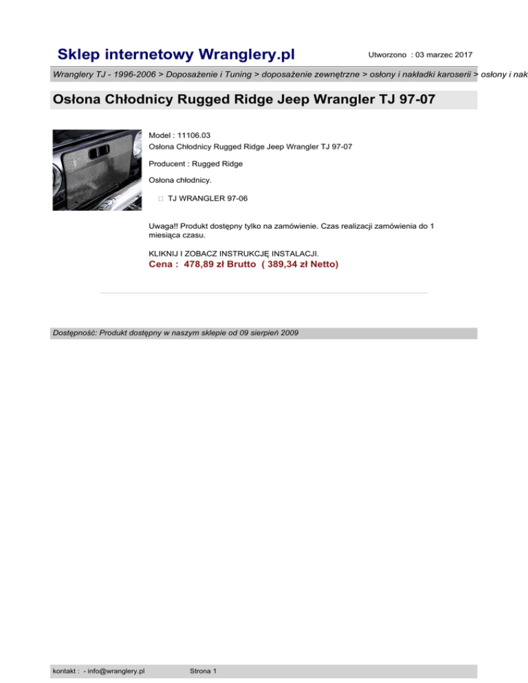 Sklep internetowy Wranglery.pl Utworzono : 03 marzec 2017 Wranglery TJ - 1996-2006 > Doposażenie i Tuning > doposażenie zewnętrzne > osłony i nakładki karoserii > osłony i nak Osłona Chłodnicy Rugged Ridge Jeep Wrangler TJ 97-07 Model : 11106.03 Osłona Chłodnicy Rugged Ridge Jeep Wrangler TJ 97-07 Producent : Rugged Ridge Osłona chłodnicy. � TJ WRANGLER 97-06 Uwaga!! Produkt dostępny tylko na zamówienie. Czas realizacji zamówienia do 1 miesiąca czasu. KLIKNIJ I ZOBACZ INSTRUKCJĘ INSTALACJI. Cena : 478,89 zł Brutto ( 389,34 zł Netto) Dostępność: Produkt dostępny w naszym sklepie od 09 sierpień 2009 kontakt : - [email protected] Strona 1