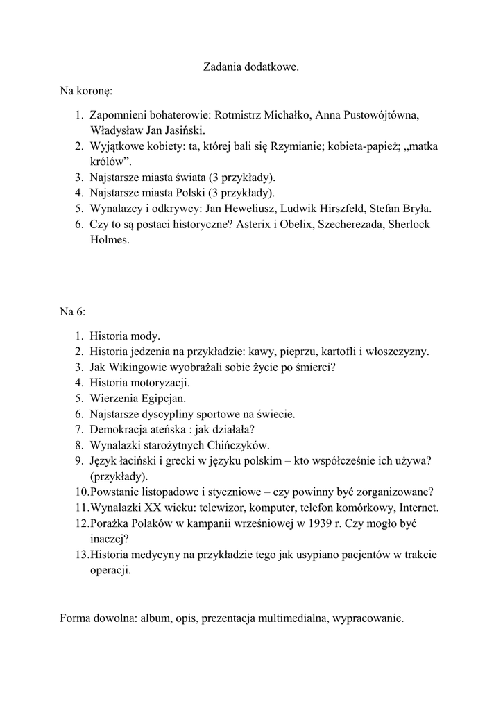 Zadania dodatkowe. Na koronę: 1. Zapomnieni bohaterowie: Rotmistrz Michałko, Anna Pustowójtówna, Władysław Jan Jasiński. 2. Wyjątkowe kobiety: ta, której bali się Rzymianie; kobieta-papież; „matka królów”. 3. Najstarsze miasta świata (3 przykłady). 4. Najstarsze miasta Polski (3 przykłady). 5. Wynalazcy i odkrywcy: Jan Heweliusz, Ludwik Hirszfeld, Stefan Bryła. 6. Czy to są postaci historyczne? Asterix i Obelix, Szecherezada, Sherlock Holmes. Na 6: 1. 2. 3. 4. 5. 6. 7. 8. 9. Historia mody. Historia jedzenia na przykładzie: kawy, pieprzu, kartofli i włoszczyzny. Jak Wikingowie wyobrażali sobie życie po śmierci? Historia motoryzacji. Wierzenia Egipcjan. Najstarsze dyscypliny sportowe na świecie. Demokracja ateńska : jak działała? Wynalazki starożytnych Chińczyków. Język łaciński i grecki w języku polskim – kto współcześnie ich używa? (przykłady). 10.Powstanie listopadowe i styczniowe – czy powinny być zorganizowane? 11.Wynalazki XX wieku: telewizor, komputer, telefon komórkowy, Internet. 12.Porażka Polaków w kampanii wrześniowej w 1939 r. Czy mogło być inaczej? 13.Historia medycyny na przykładzie tego jak usypiano pacjentów w trakcie operacji. Forma dowolna: album, opis, prezentacja multimedialna, wypracowanie.