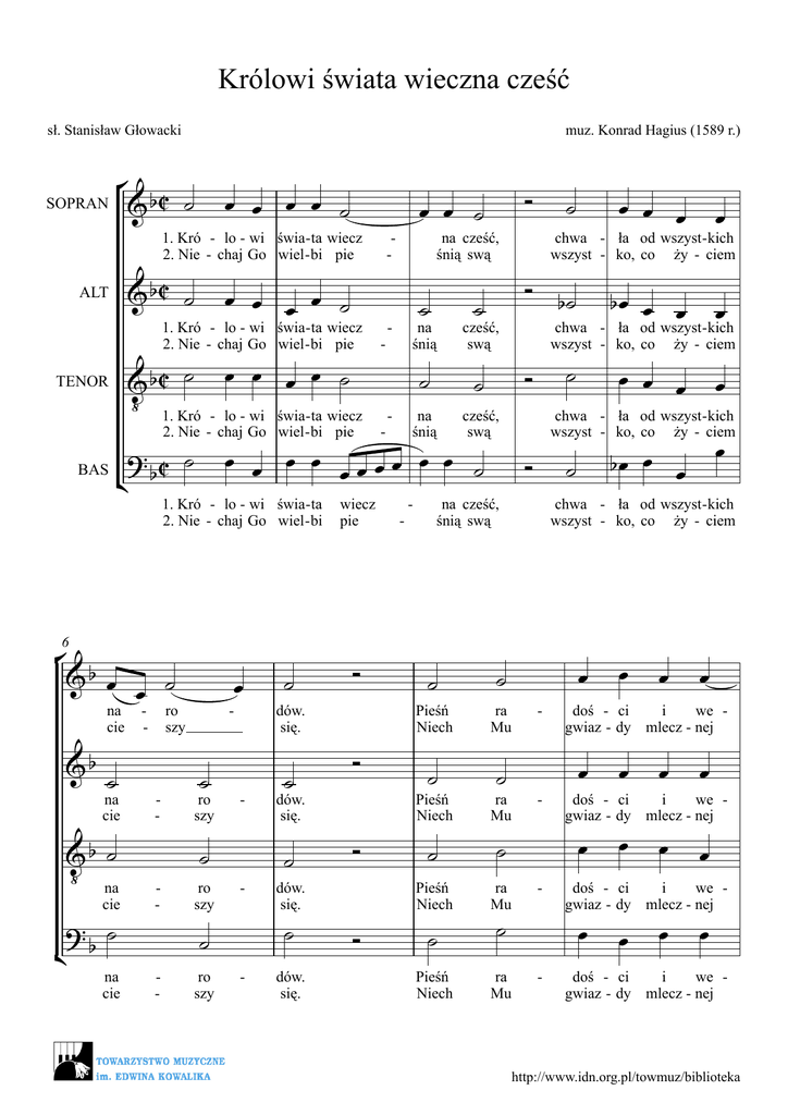 Królowi świata wieczna cześć sł. Stanisław Głowacki SOPRAN muz. Konrad Hagius (1589 r.) ° & bC ˙ œ œ œ œ ˙ & bC ˙ œ œ œ œ ˙ 1. Kró - lo - wi świa - ta wiecz 2. Nie - chaj Go wiel - bi pie ALT 1. Kró - lo - wi świa - ta wiecz 2. Nie - chaj Go wiel - bi pie TENOR & bC ˙ œ œ œ œ ˙ ‹ 1. Kró - lo - wi świa-ta wiecz &b ˙ na cie &b ˙ ‹ na cie ? ˙ ¢ b na cie - - - - ˙ ro szy ˙ ro szy - - ˙ - ro szy na śnią cześć, swą - ˙ dów. się. ˙ dów. się. wiecz pie Ó Ó ˙ Ó ˙ Ó dów. się. dów. się. - ˙ - na śnią - - cześć, swą ˙ Pieśń Niech ra Mu ˙ ˙ Pieśń Niech ra Mu œ b˙ bœ œ œ œ ˙ œ œ œ œ bœ œ œ œ chwa - ła od wszyst - kich wszyst - ko, co ży - ciem ˙ chwa - ła od wszyst - kich wszyst - ko, co ży - ciem œ - - ˙ ˙ Pieśń Niech ra Mu - Pieśń Niech ra Mu - ˙ œ œ œ chwa - ła od wszyst - kich wszyst - ko, co ży - ciem na cześć, śnią swą ˙ ˙ chwa - ła od wszyst - kich wszyst - ko, co ży - ciem Ó Ó œ ro szy - ˙ œ œ œ œ œœœ œ œ ˙ œ 6 na cie ˙ Ó 1. Kró - lo - wi świa - ta 2. Nie - chaj Go wiel - bi ° &b œ œ ˙ na cześć, śnią swą ˙ 2. Nie - chaj Go wiel - bi pie ? C ˙ BAS ¢ b - - Ó œ œ ˙ ˙ œ œ œ doś - ci i we gwiaz - dy mlecz - nej œ œ œ œ œ œ œ œ doś - ci i we gwiaz - dy mlecz - nej doś - ci i we gwiaz - dy mlecz - nej œ œ œ œ doś - ci i we gwiaz - dy mlecz - nej http://www.idn.org.pl/towmuz/biblioteka ° &b œ œ ˙ 2 10 &b ˙ se dro se - la dro - gi ˙ Ó ˙ Ó - la gi dro - la gi se dro - la gi &b ˙ ‹ se ? ˙ ¢ b Ó ˙ Ó ˙ ˙ nie świa ˙ - chaj tłem œ œ nœ ˙ sła - wi ście - lą œ œ ˙ Zba - wi się pod œ - œ œ ˙ w cie - la. no - gi. w nie świa - chaj sła - wi tłem ście - lą ˙ œ œ Zba - wi - cie się pod no - la. gi. nie świa - chaj tłem ˙ sła - wi ście - lą Zba - wi - cie się pod no - la. gi. nie świa - chaj tłem sła - wi ście - lą Zba - wi - cie się pod no - la. gi. ˙ ˙ œ œ œ œ ˙ œ œ ˙ w w http://www.idn.org.pl/towmuz/biblioteka