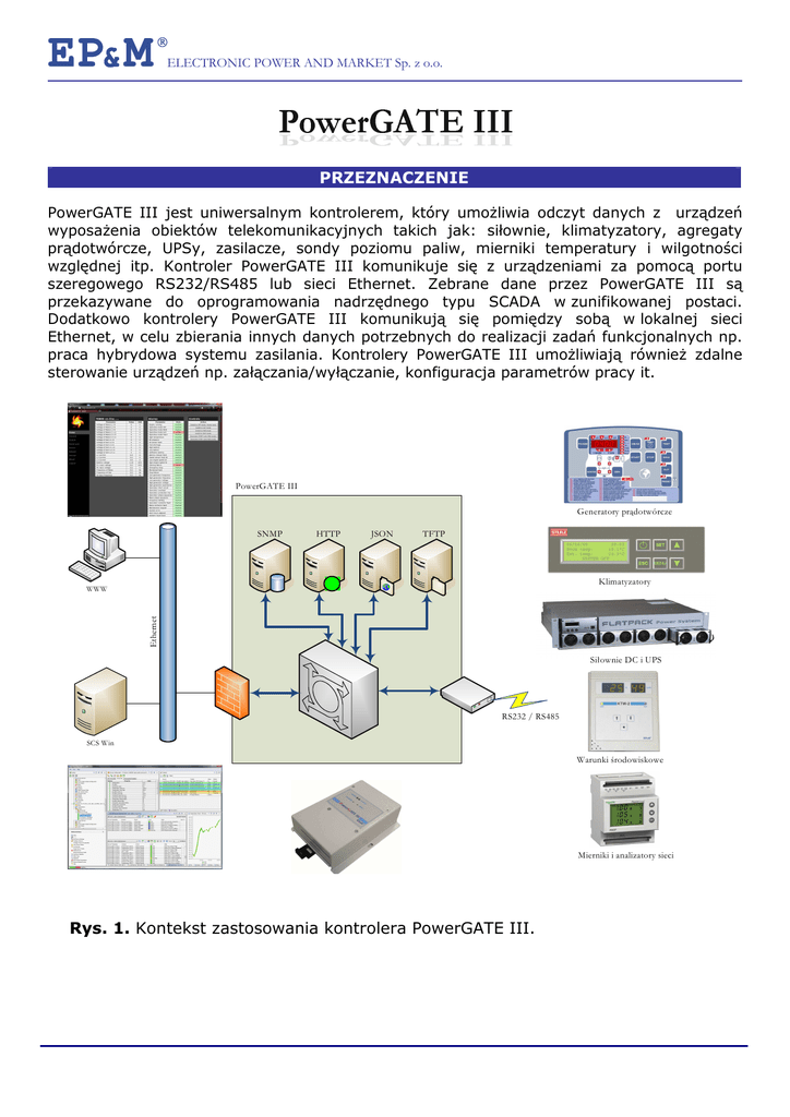 ELECTRONIC POWER AND MARKET Sp. z o.o. PRZEZNACZENIE PowerGATE III jest uniwersalnym kontrolerem, który umożliwia odczyt danych z urządzeń wyposażenia obiektów telekomunikacyjnych takich jak: siłownie, klimatyzatory, agregaty prądotwórcze, UPSy, zasilacze, sondy poziomu paliw, mierniki temperatury i wilgotności względnej itp. Kontroler PowerGATE III komunikuje się z urządzeniami za pomocą portu szeregowego RS232/RS485 lub sieci Ethernet. Zebrane dane przez PowerGATE III są przekazywane do oprogramowania nadrzędnego typu SCADA w zunifikowanej postaci. Dodatkowo kontrolery PowerGATE III komunikują się pomiędzy sobą w lokalnej sieci Ethernet, w celu zbierania innych danych potrzebnych do realizacji zadań funkcjonalnych np. praca hybrydowa systemu zasilania. Kontrolery PowerGATE III umożliwiają również zdalne sterowanie urządzeń np. załączania/wyłączanie, konfiguracja parametrów pracy it. PowerGATE III Generatory prądotwórcze SNMP HTTP JSON TFTP Klimatyzatory Ethernet WWW Siłownie DC i UPS RS232 / RS485 SCS Win Warunki środowiskowe Mierniki i analizatory sieci Rys. 1. Kontekst zastosowania kontrolera PowerGATE III. FUNKCJONALNOŚĆ Kontroler PowerGATE III posiada zaimplementowane algorytmy i protokoły do właściwej komunikacji z wybranym kontrolerem urządzenia. Wyróżnić można następujące pseudoprocesy kontrolera: główny proces komunikacyjny obsługujący transmisję danych przez port szeregowy i Ethernet oraz analizę zebranych danych; serwer www – umożliwiający wyświetlanie aktualnych danych monitorowanego urządzenia, zmianę parametrów konfiguracyjnych, sterowanie itp.; serwer TFTP – umożliwiający bezpośredni transfer plików np. zdalną wymianę firmware; agent SNMP – umożliwiający komunikację pomiędzy kontrolerami PowerGATE III w celu realizacji zadań funkcjonalnych np. praca hybrydowa systemu zasilania; serwer i klient JSON – umożliwiający przekazywanie danych do systemu centralnego SCADA w postaci znormalizawanej niezależnie od protokołu monitorowanego urządzenia; serwer DCOMM – umożliwiający bezpośrednie połączenie z portem szeregowym, dzięki temu możliwa jest bezpośrednia komunikacja z monitorowanym urządzenia np. za pomocą oprogramowania dostarczanego przez producenta urządznia; serwer Xplorer – umożliwiający wykrywanie kontrolerów w lokalnej sieci LAN za pomocą programu konfiguracyjnego Xplorer. PARAMETRY TECHNICZNE PARAMETR Znamionowe napięcie zasilania Maksymalny pobór mocy Interfejsy komunikacyjne Wspierane protokoły sieciowe Liczba wejść dwustanowych Liczba wyjść przekaźnikowych Wymiary kontrolera (szer.x głęb.x wys.) Temperatura pracy WARTOŚĆ 12VDC (9÷18VDC) 48VDC (36÷60V), PoE IEEE 802.3af 3W Ethernet – 100BASE–T Auto MDI-MDIX RS232 – ze sterowaniem RTS/CTS RS485 – 2Wire ADC IP: ARP TCP/IP (HTTP, JSON, DCOMM) UDP/IP (SNMPv1, TFTP) 4 izolowane galwanicznie 2 ze stykiem przełączalnym 110×38×145 mm -20 ÷ 70ºC Electronic Power And Market Sp. z o.o. BIURO HANDLOWE: 78-400 Szczecinek, ul. Junacka 7 Tel. 094 374 08 90, 372 36 00 fax: 094 372 49 13 Edycja 1 e-mail:epm.com.pl http://www.epm.com.pl