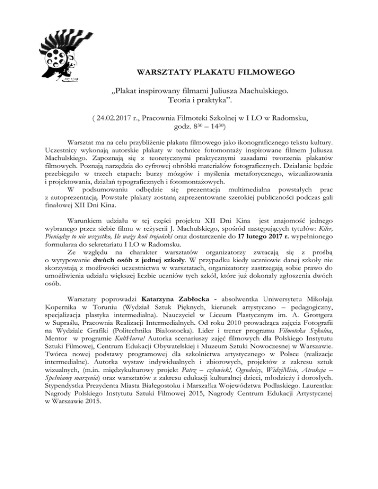 WARSZTATY PLAKATU FILMOWEGO „Plakat inspirowany filmami Juliusza Machulskiego. Teoria i praktyka”. ( 24.02.2017 r., Pracownia Filmoteki Szkolnej w I LO w Radomsku, godz. 830 – 1430) Warsztat ma na celu przybliżenie plakatu filmowego jako ikonograficznego tekstu kultury. Uczestnicy wykonają autorskie plakaty w technice fotomontaży inspirowane filmem Juliusza Machulskiego. Zapoznają się z teoretycznymi praktycznymi zasadami tworzenia plakatów filmowych. Poznają narzędzia do cyfrowej obróbki materiałów fotograficznych. Działanie będzie przebiegało w trzech etapach: burzy mózgów i myślenia metaforycznego, wizualizowania i projektowania, działań typograficznych i fotomontażowych. W podsumowaniu odbędzie się prezentacja multimedialna powstałych prac z autoprezentacją. Powstałe plakaty zostaną zaprezentowane szerokiej publiczności podczas gali finałowej XII Dni Kina. Warunkiem udziału w tej części projektu XII Dni Kina jest znajomość jednego wybranego przez siebie filmu w reżyserii J. Machulskiego, spośród następujących tytułów: Kiler, Pieniądze to nie wszystko, Ile waży koń trojański oraz dostarczenie do 17 lutego 2017 r. wypełnionego formularza do sekretariatu I LO w Radomsku. Ze względu na charakter warsztatów organizatorzy zwracają się z prośbą o wytypowanie dwóch osób z jednej szkoły. W przypadku kiedy uczniowie danej szkoły nie skorzystają z możliwości uczestnictwa w warsztatach, organizatorzy zastrzegają sobie prawo do umożliwienia udziału większej liczbie uczniów tych szkół, które już dokonały zgłoszenia dwóch osób. Warsztaty poprowadzi Katarzyna Zabłocka - absolwentka Uniwersytetu Mikołaja Kopernika w Toruniu (Wydział Sztuk Pięknych, kierunek artystyczno – pedagogiczny, specjalizacja plastyka intermedialna). Nauczyciel w Liceum Plastycznym im. A. Grottgera w Supraślu, Pracownia Realizacji Intermedialnych. Od roku 2010 prowadząca zajęcia Fotografii na Wydziale Grafiki (Politechnika Białostocka). Lider i trener programu Filmoteka Szkolna, Mentor w programie KultHurra! Autorka scenariuszy zajęć filmowych dla Polskiego Instytutu Sztuki Filmowej, Centrum Edukacji Obywatelskiej i Muzeum Sztuki Nowoczesnej w Warszawie. Twórca nowej podstawy programowej dla szkolnictwa artystycznego w Polsce (realizacje intermedialne). Autorka wystaw indywidualnych i zbiorowych, projektów z zakresu sztuk wizualnych, (m.in. międzykulturowy projekt Patrz – człowiek!, Ogrodnicy, WidziMisie, Atrakcja – Spełniamy marzenia) oraz warsztatów z zakresu edukacji kulturalnej dzieci, młodzieży i dorosłych. Stypendystka Prezydenta Miasta Białegostoku i Marszałka Województwa Podlaskiego. Laureatka: Nagrody Polskiego Instytutu Sztuki Filmowej 2015, Nagrody Centrum Edukacji Artystycznej w Warszawie 2015.