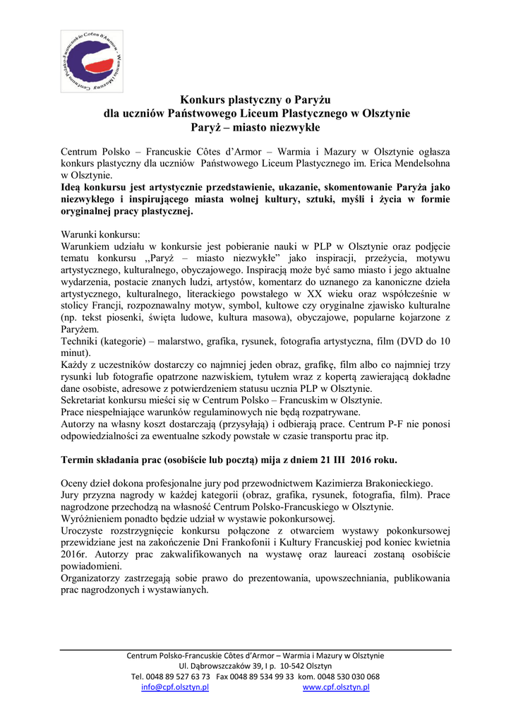 Konkurs plastyczny o Paryżu dla uczniów Państwowego Liceum Plastycznego w Olsztynie Paryż – miasto niezwykłe Centrum Polsko – Francuskie Côtes d’Armor – Warmia i Mazury w Olsztynie ogłasza konkurs plastyczny dla uczniów Państwowego Liceum Plastycznego im. Erica Mendelsohna w Olsztynie. Ideą konkursu jest artystycznie przedstawienie, ukazanie, skomentowanie Paryża jako niezwykłego i inspirującego miasta wolnej kultury, sztuki, myśli i życia w formie oryginalnej pracy plastycznej. Warunki konkursu: Warunkiem udziału w konkursie jest pobieranie nauki w PLP w Olsztynie oraz podjęcie tematu konkursu ,,Paryż – miasto niezwykłe” jako inspiracji, przeżycia, motywu artystycznego, kulturalnego, obyczajowego. Inspiracją może być samo miasto i jego aktualne wydarzenia, postacie znanych ludzi, artystów, komentarz do uznanego za kanoniczne dzieła artystycznego, kulturalnego, literackiego powstałego w XX wieku oraz współcześnie w stolicy Francji, rozpoznawalny motyw, symbol, kultowe czy oryginalne zjawisko kulturalne (np. tekst piosenki, święta ludowe, kultura masowa), obyczajowe, popularne kojarzone z Paryżem. Techniki (kategorie) – malarstwo, grafika, rysunek, fotografia artystyczna, film (DVD do 10 minut). Każdy z uczestników dostarczy co najmniej jeden obraz, grafikę, film albo co najmniej trzy rysunki lub fotografie opatrzone nazwiskiem, tytułem wraz z kopertą zawierającą dokładne dane osobiste, adresowe z potwierdzeniem statusu ucznia PLP w Olsztynie. Sekretariat konkursu mieści się w Centrum Polsko – Francuskim w Olsztynie. Prace niespełniające warunków regulaminowych nie będą rozpatrywane. Autorzy na własny koszt dostarczają (przysyłają) i odbierają prace. Centrum P-F nie ponosi odpowiedzialności za ewentualne szkody powstałe w czasie transportu prac itp. Termin składania prac (osobiście lub pocztą) mija z dniem 21 III 2016 roku. Oceny dzieł dokona profesjonalne jury pod przewodnictwem Kazimierza Brakonieckiego. Jury przyzna nagrody w każdej kategorii (obraz, grafika, rysunek, fotografia, film). Prace nagrodzone przechodzą na własność Centrum Polsko-Francuskiego w Olsztynie. Wyróżnieniem ponadto będzie udział w wystawie pokonkursowej. Uroczyste rozstrzygnięcie konkursu połączone z otwarciem wystawy pokonkursowej przewidziane jest na zakończenie Dni Frankofonii i Kultury Francuskiej pod koniec kwietnia 2016r. Autorzy prac zakwalifikowanych na wystawę oraz laureaci zostaną osobiście powiadomieni. Organizatorzy zastrzegają sobie prawo do prezentowania, upowszechniania, publikowania prac nagrodzonych i wystawianych. Centrum Polsko-Francuskie Côtes d’Armor – Warmia i Mazury w Olsztynie Ul. Dąbrowszczaków 39, I p. 10-542 Olsztyn Tel. 0048 89 527 63 73 Fax 0048 89 534 99 33 kom. 0048 530 030 068 [email protected] www.cpf.olsztyn.pl